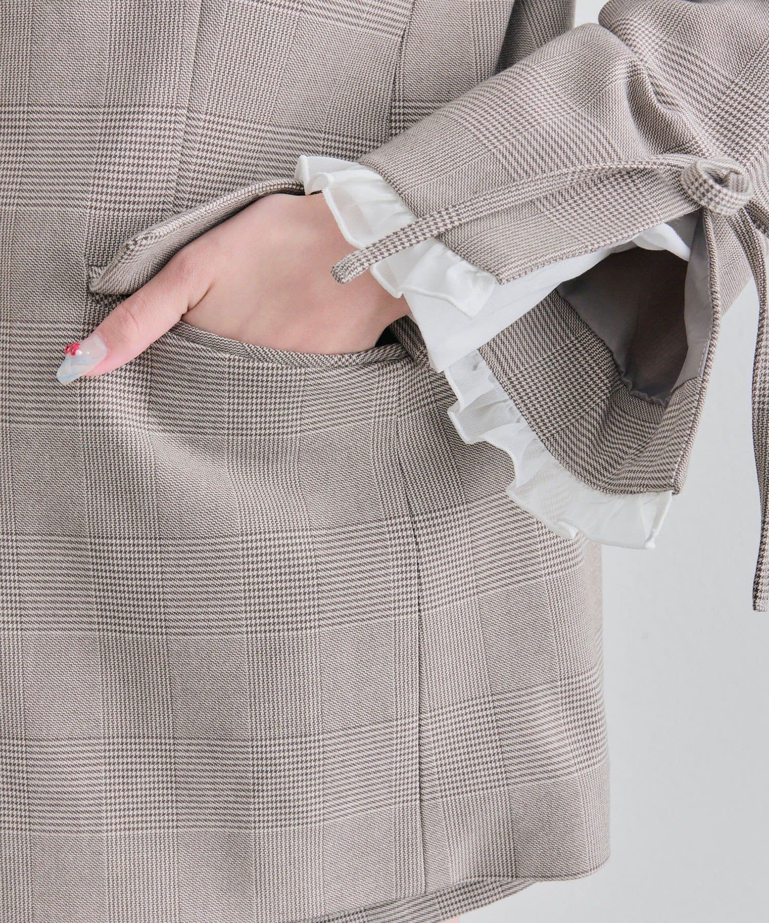 ・袖口のスリットで抜け感を作りつつ、さりげないリボンとフリルで手元までかわいい印象に。