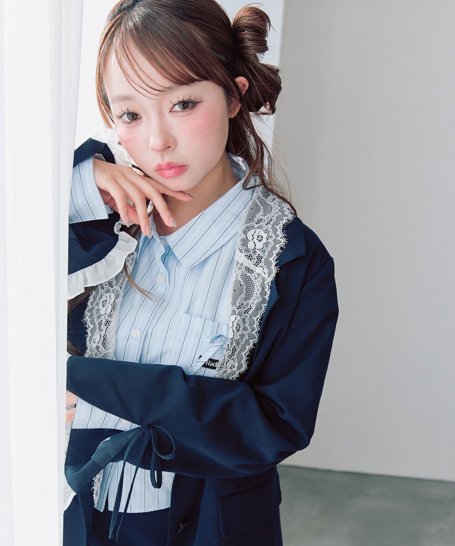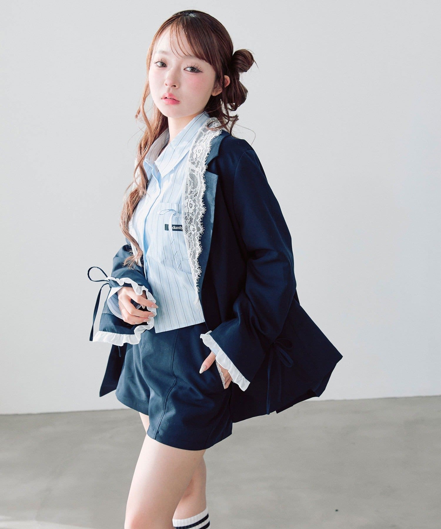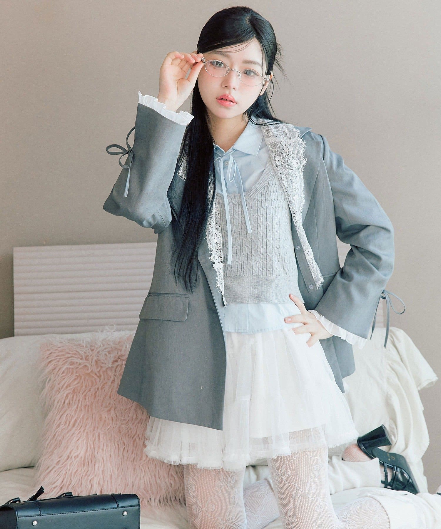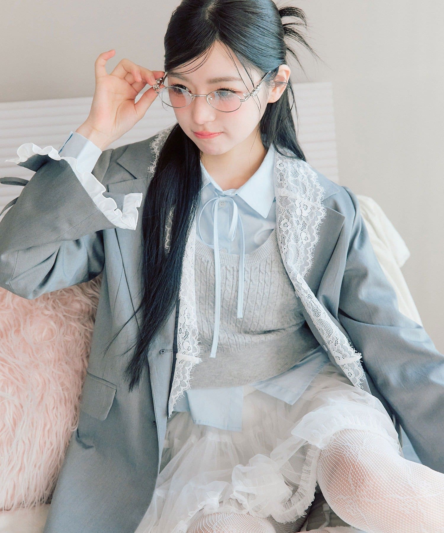 ・袖口のスリットで抜け感を作りつつ、さりげないリボンとフリルで手元までかわいい印象に。