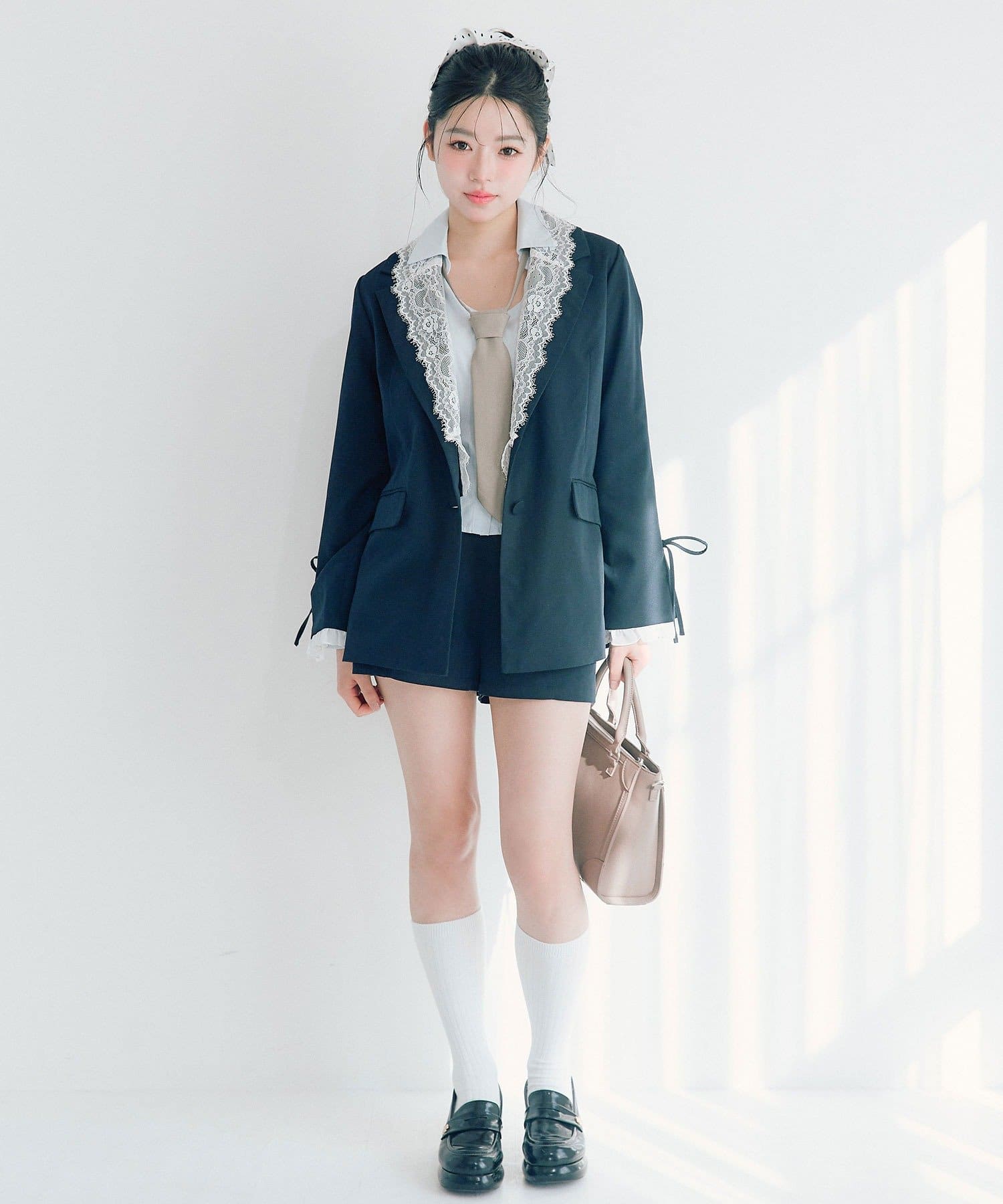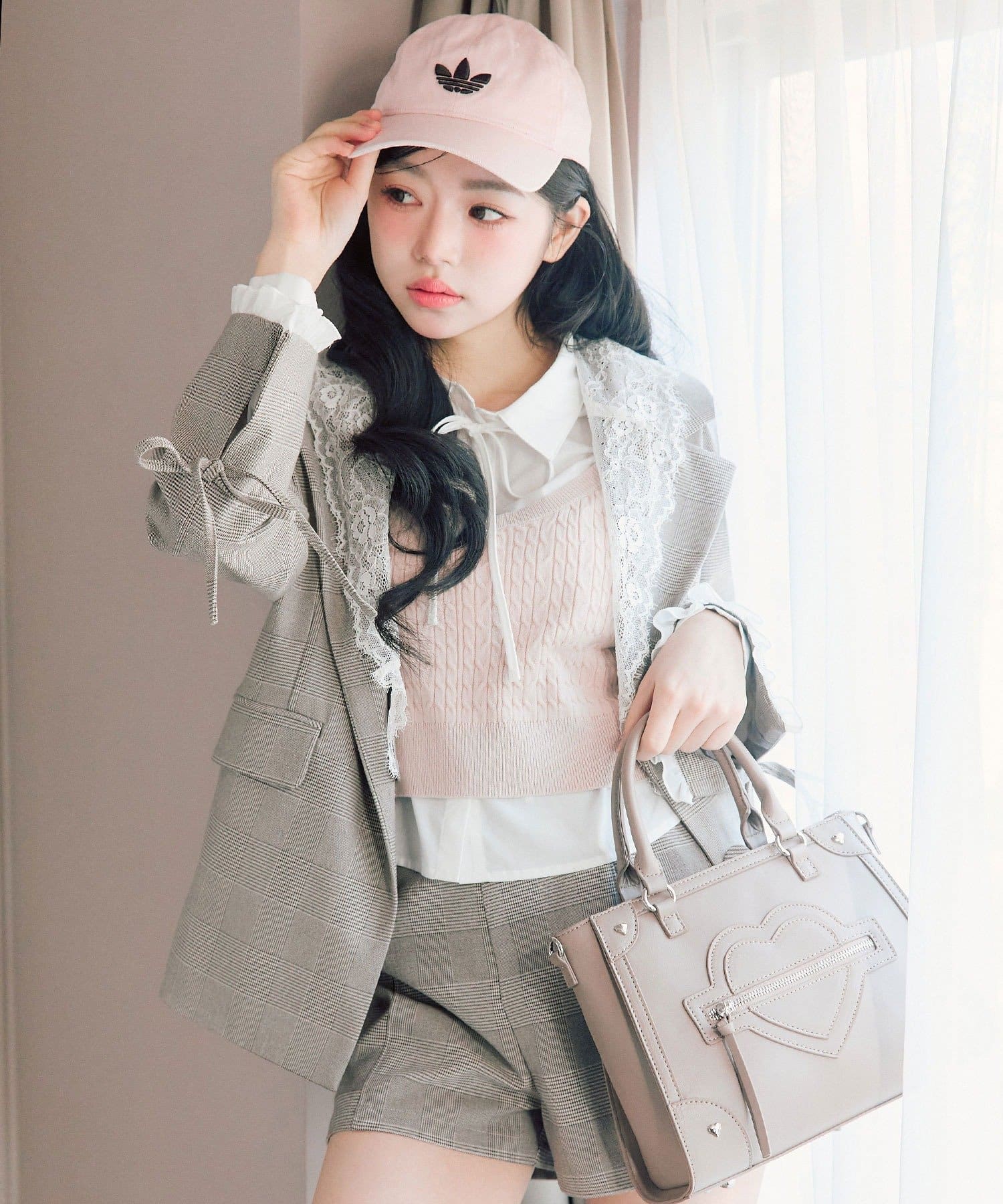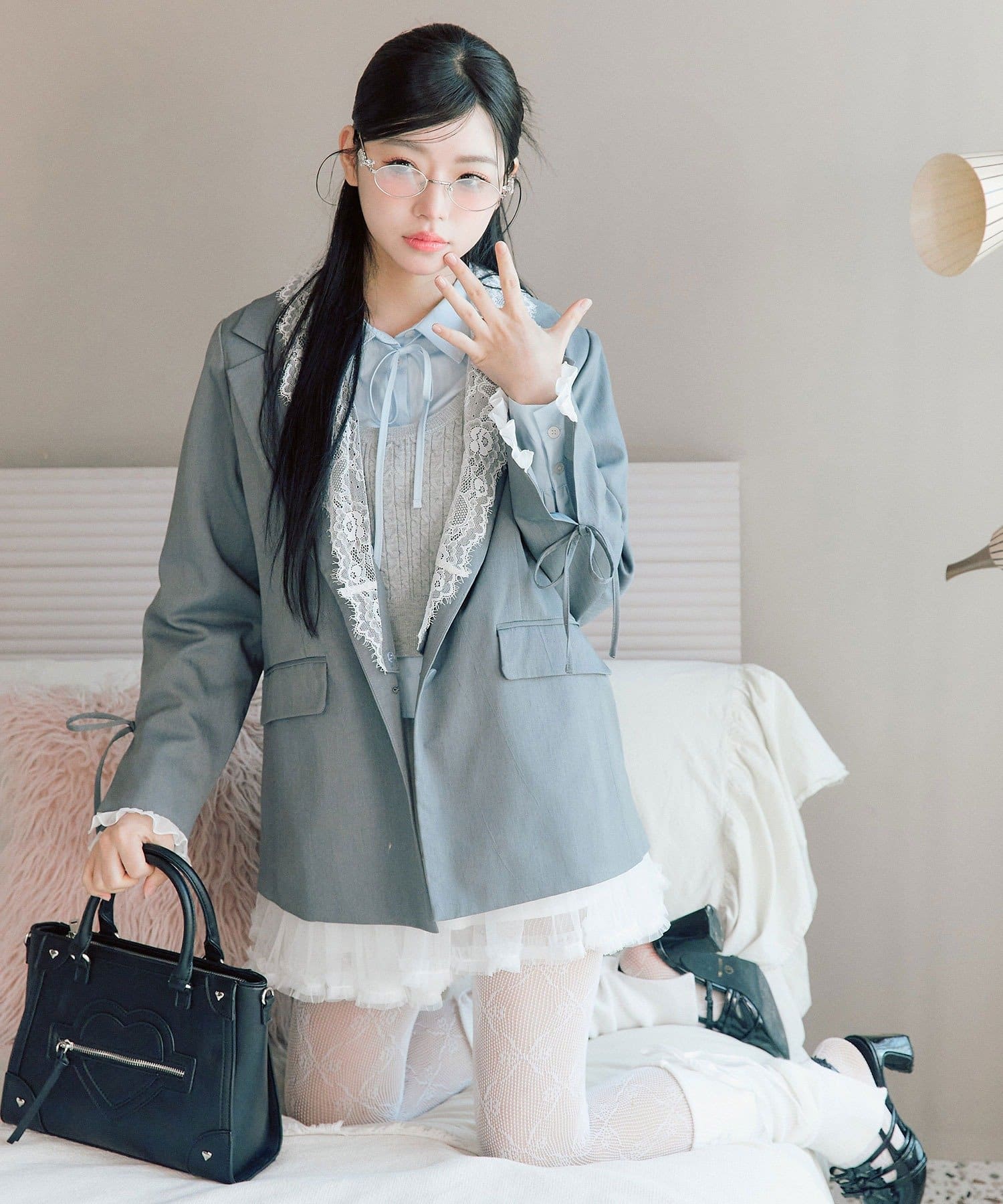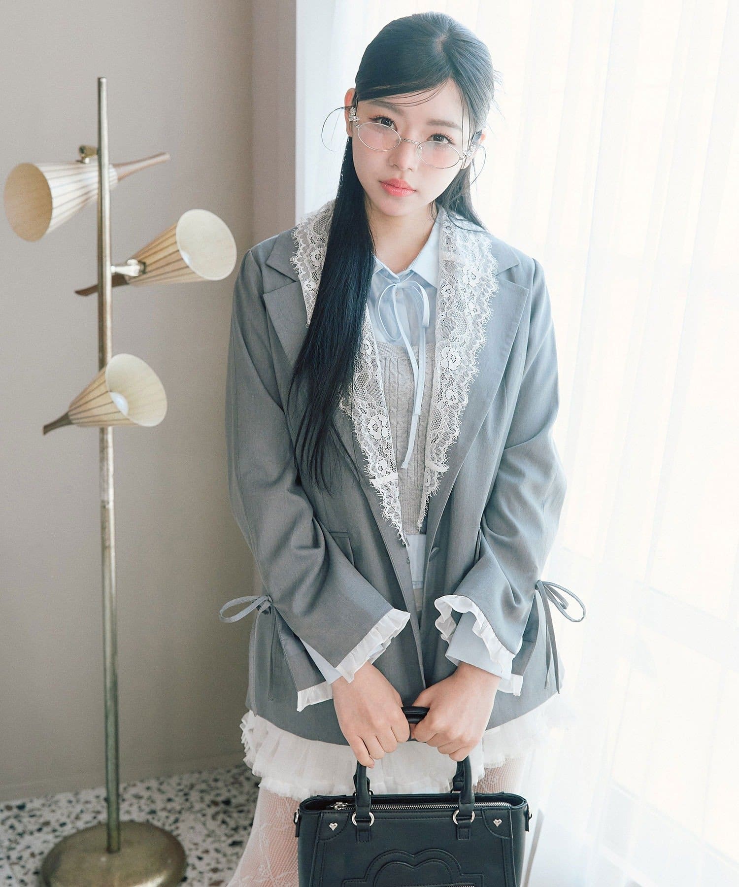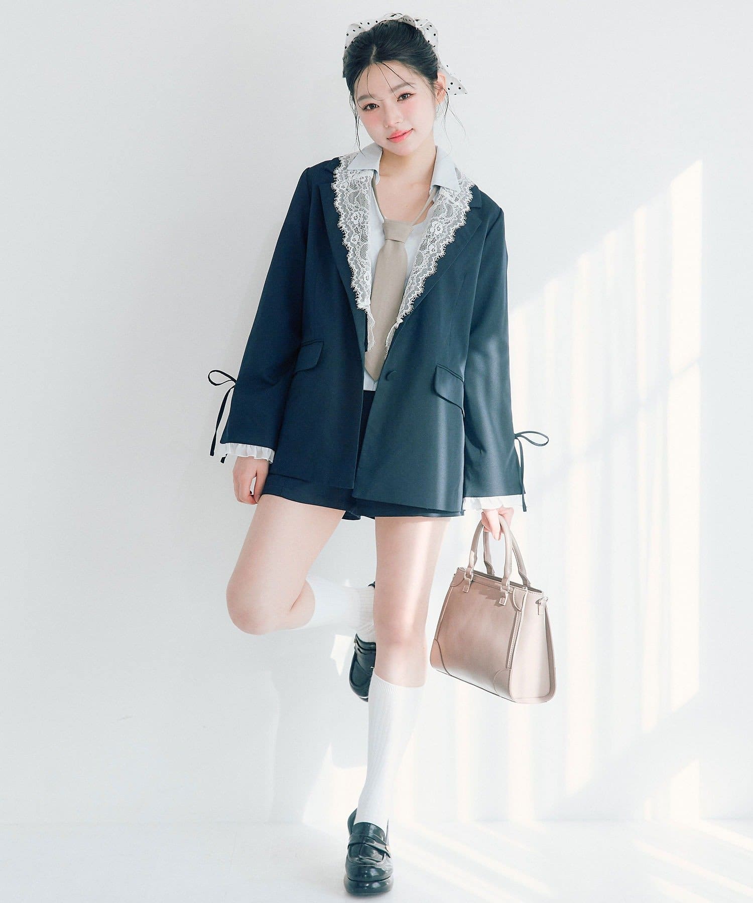 ・袖口のスリットで抜け感を作りつつ、さりげないリボンとフリルで手元までかわいい印象に。
