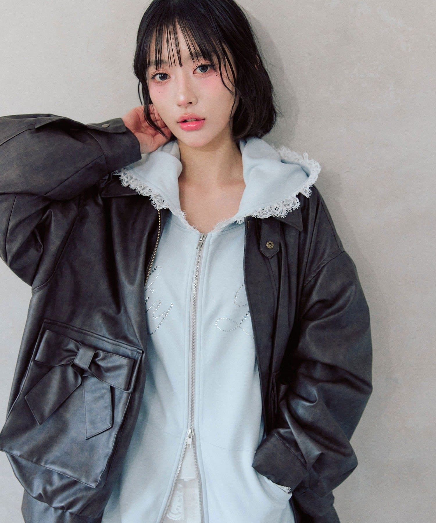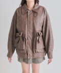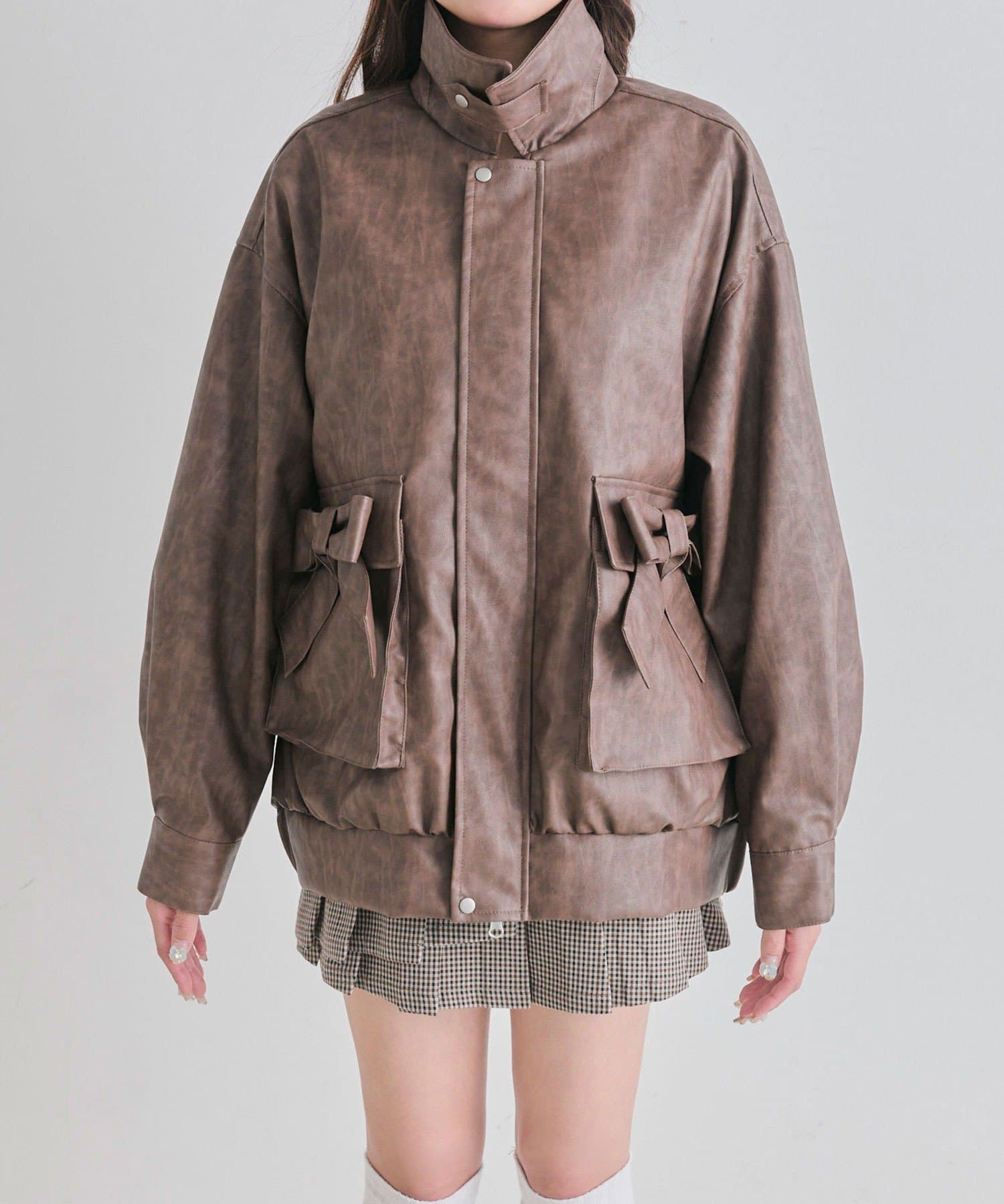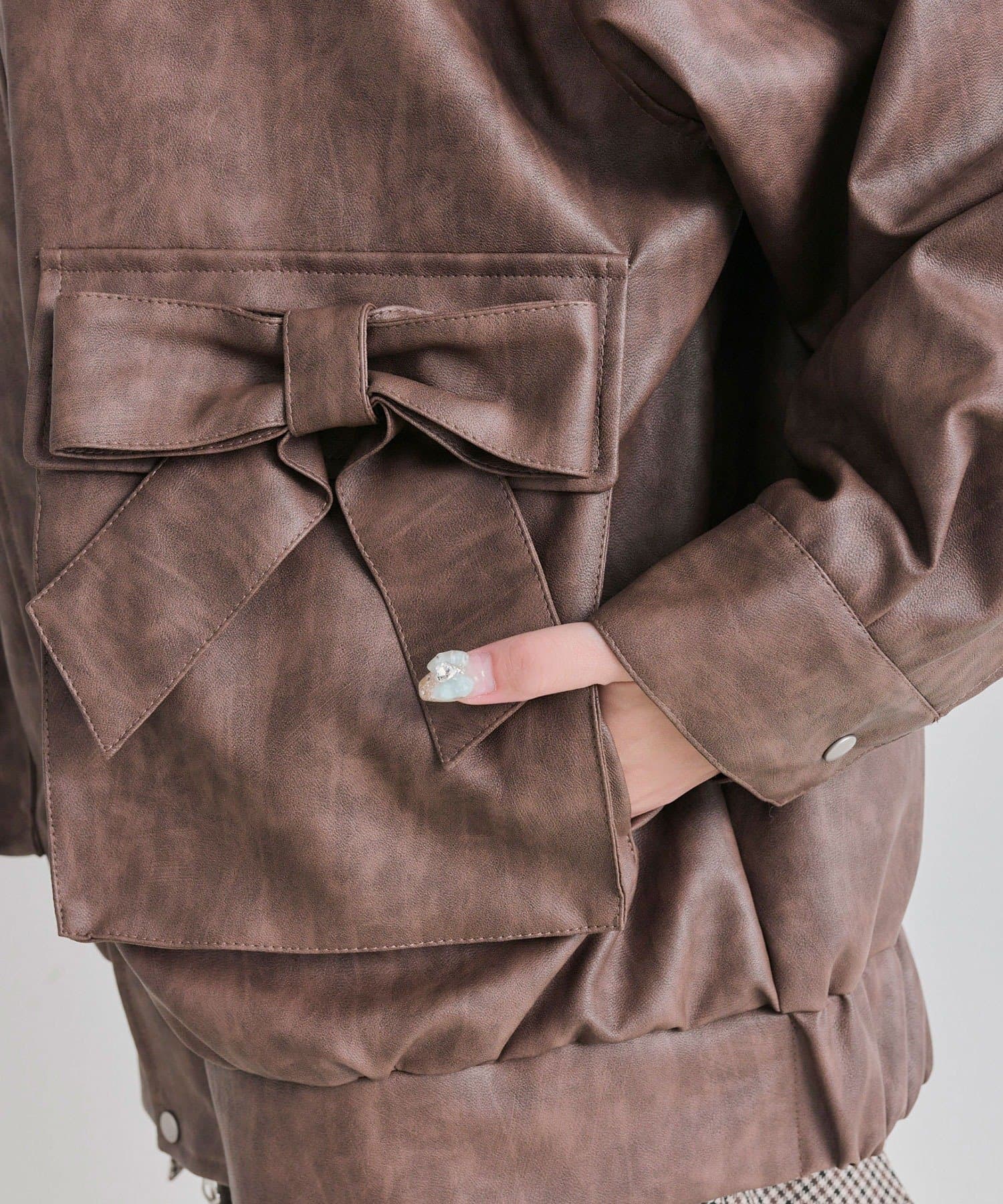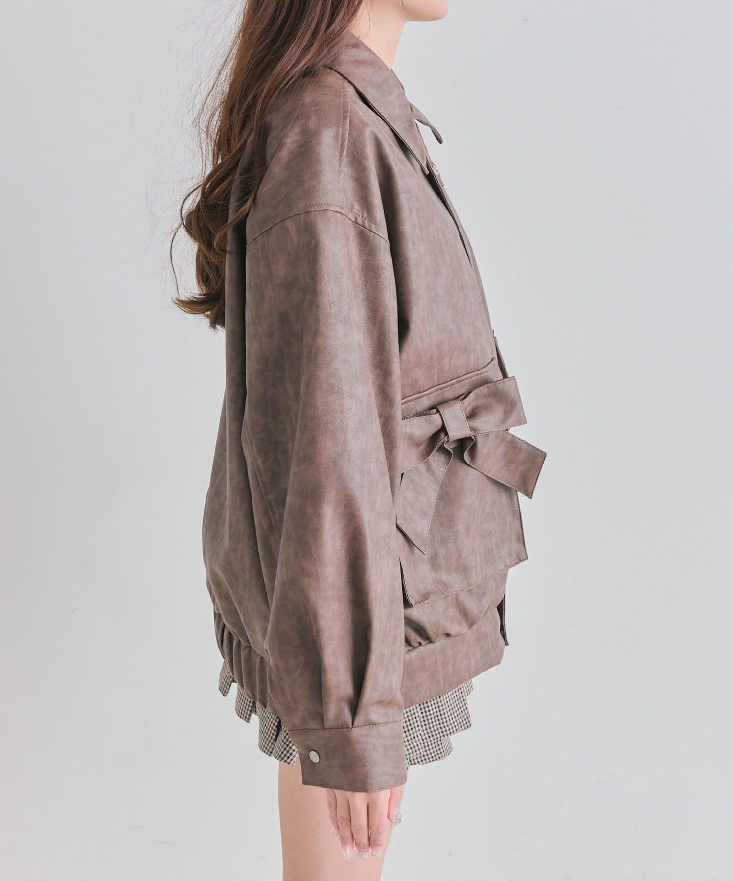 甘さのあるリボンがポイントのエコレザーブルゾン