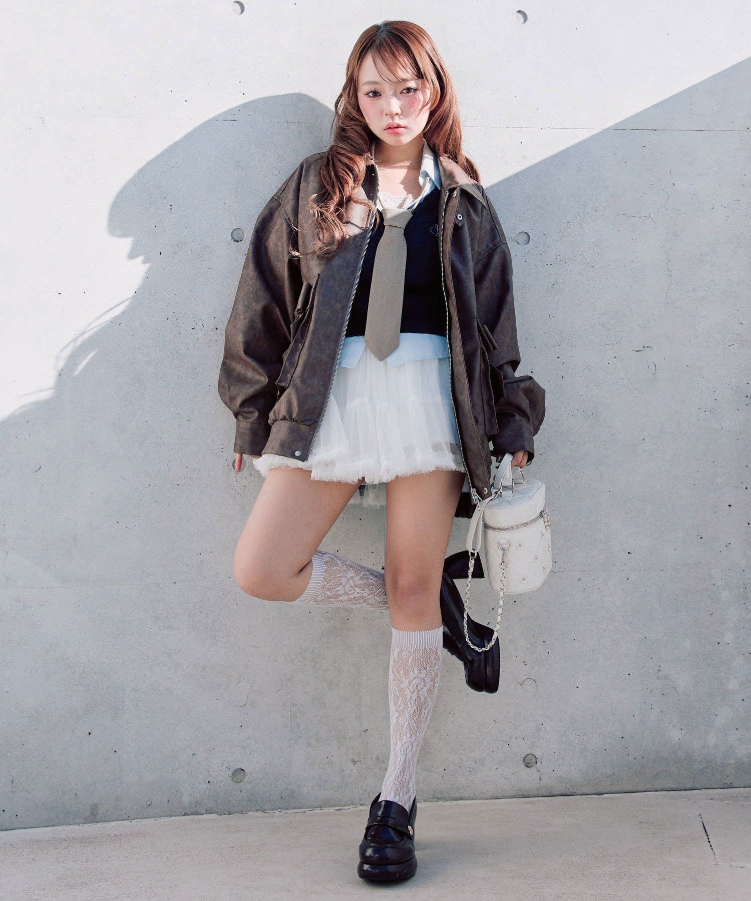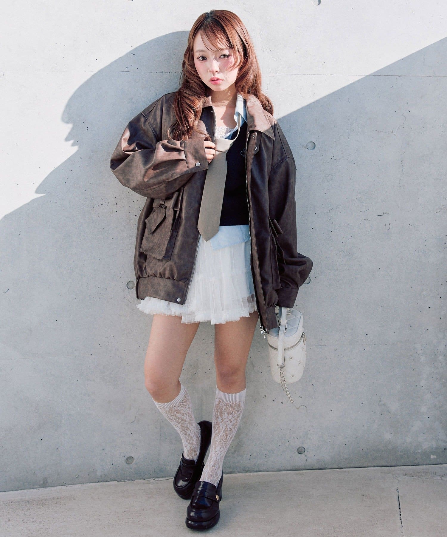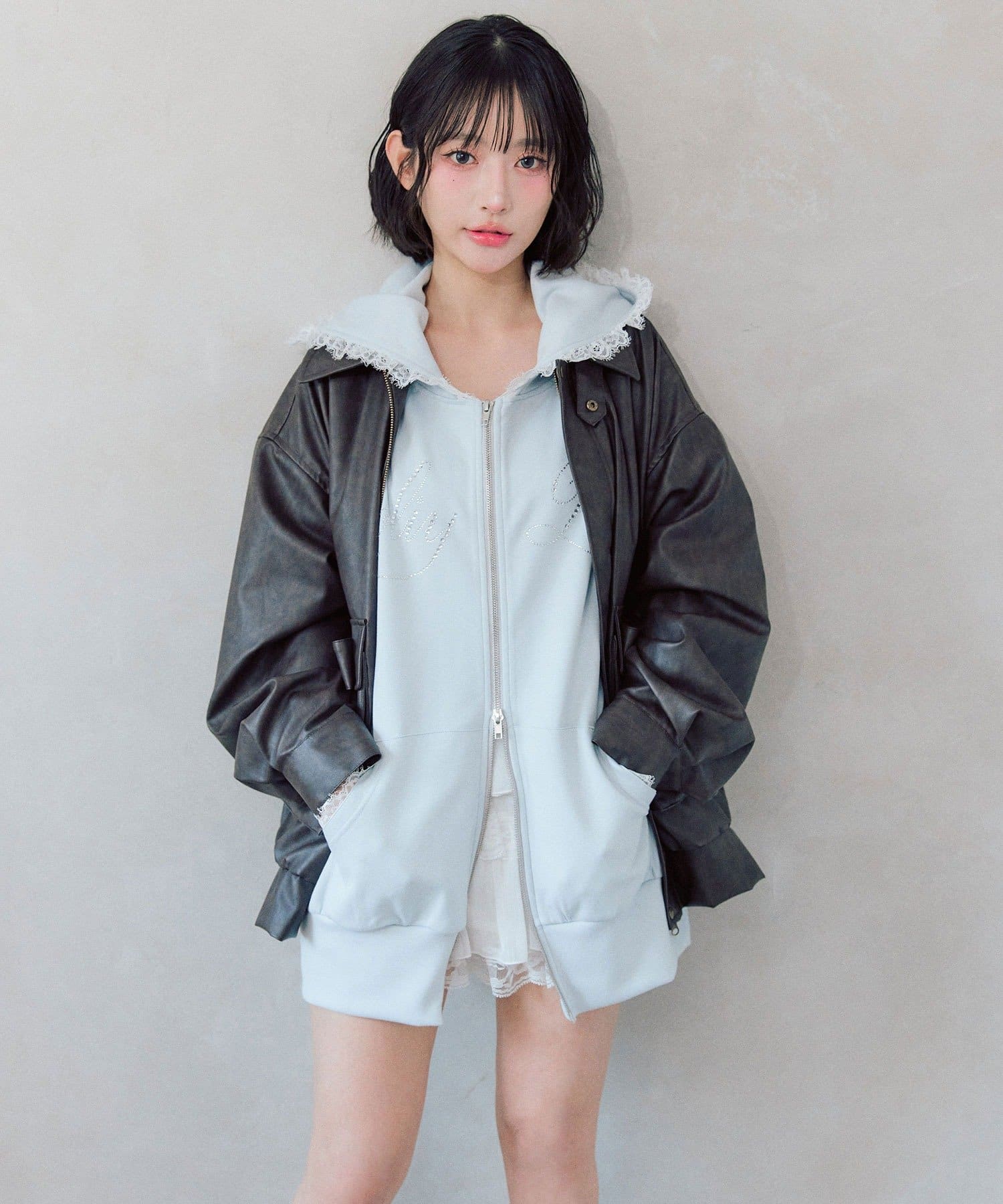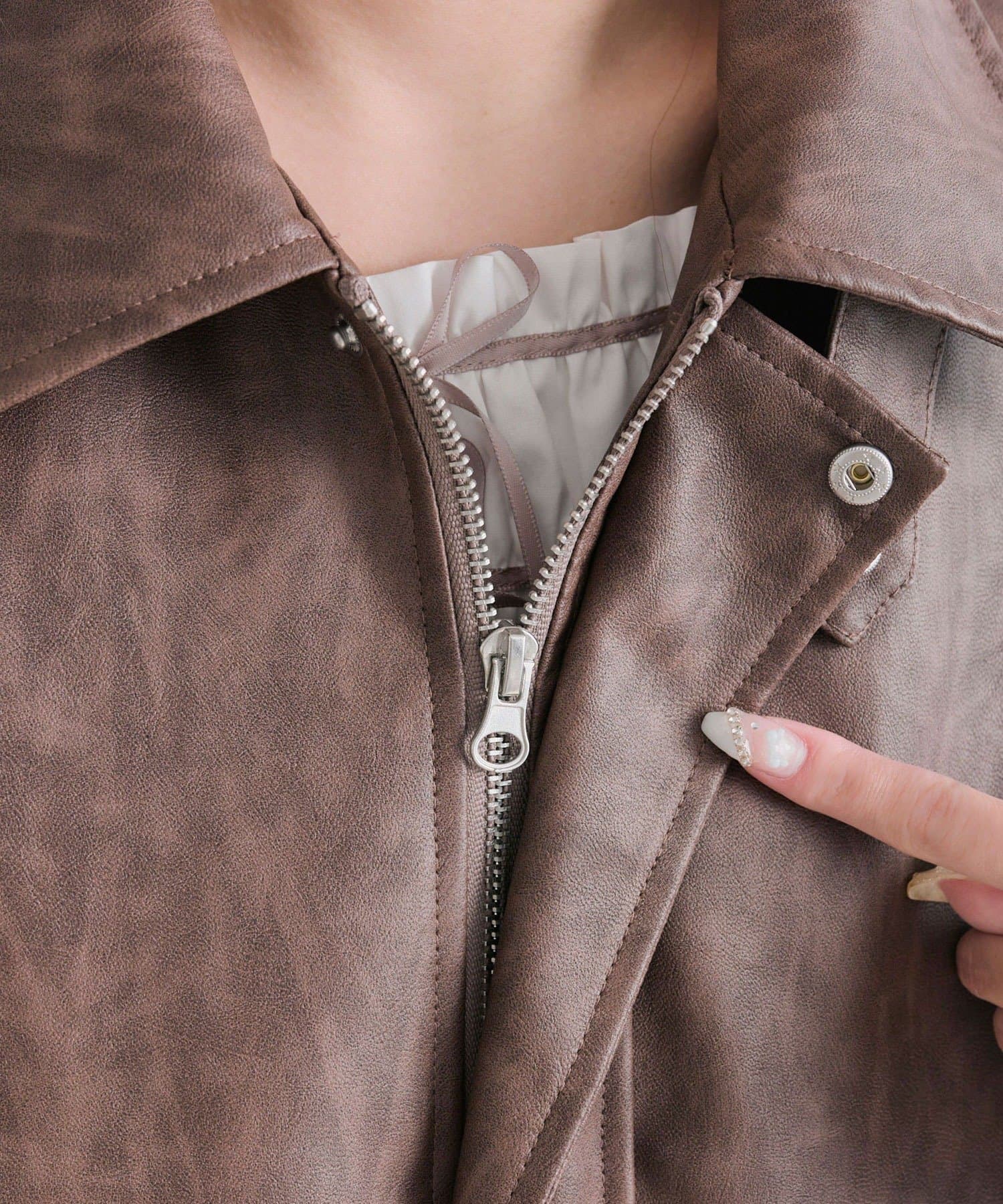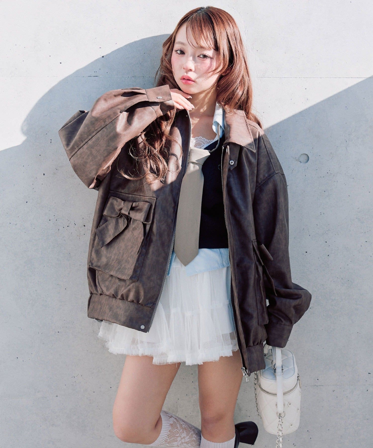 甘さのあるリボンがポイントのエコレザーブルゾン