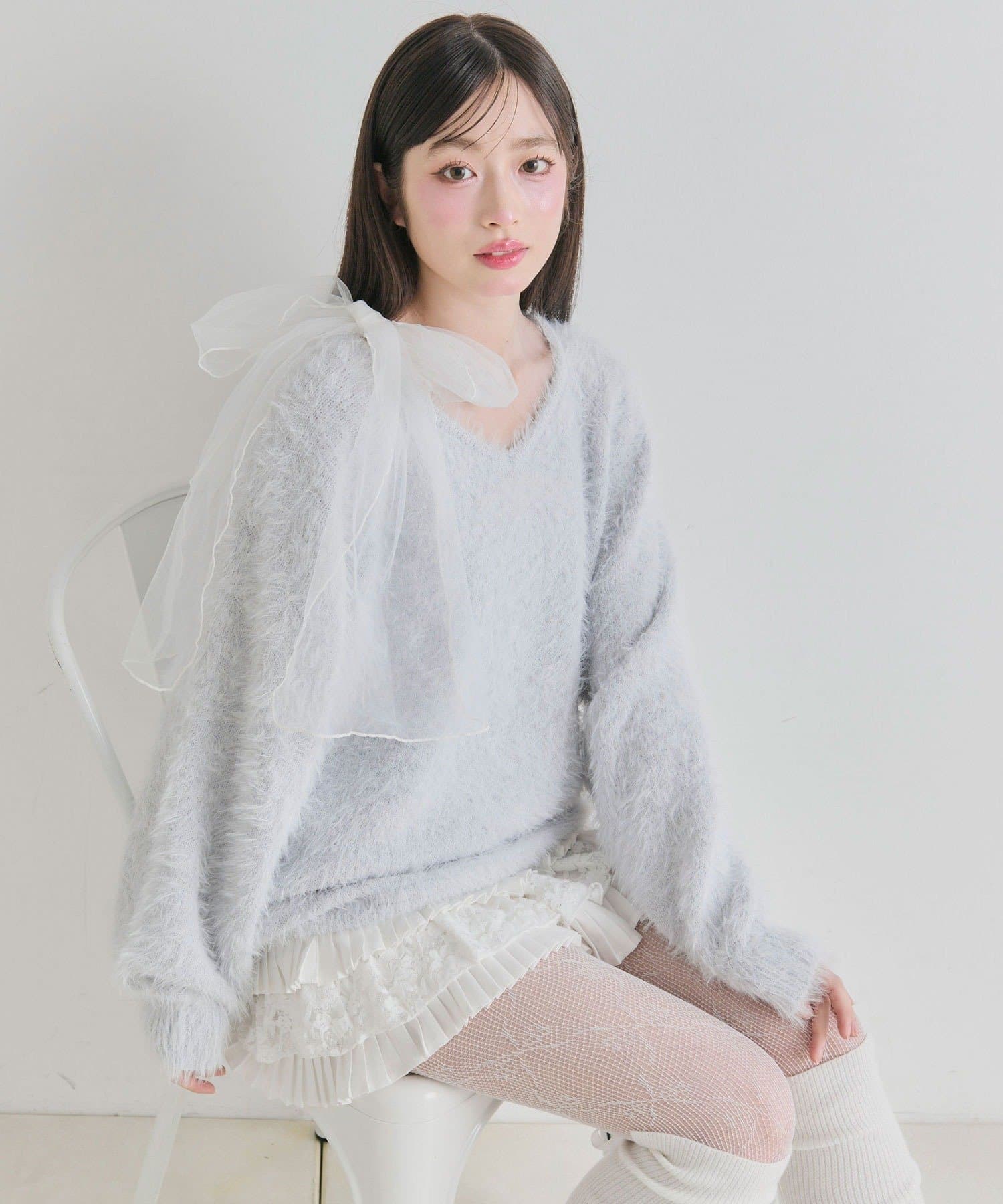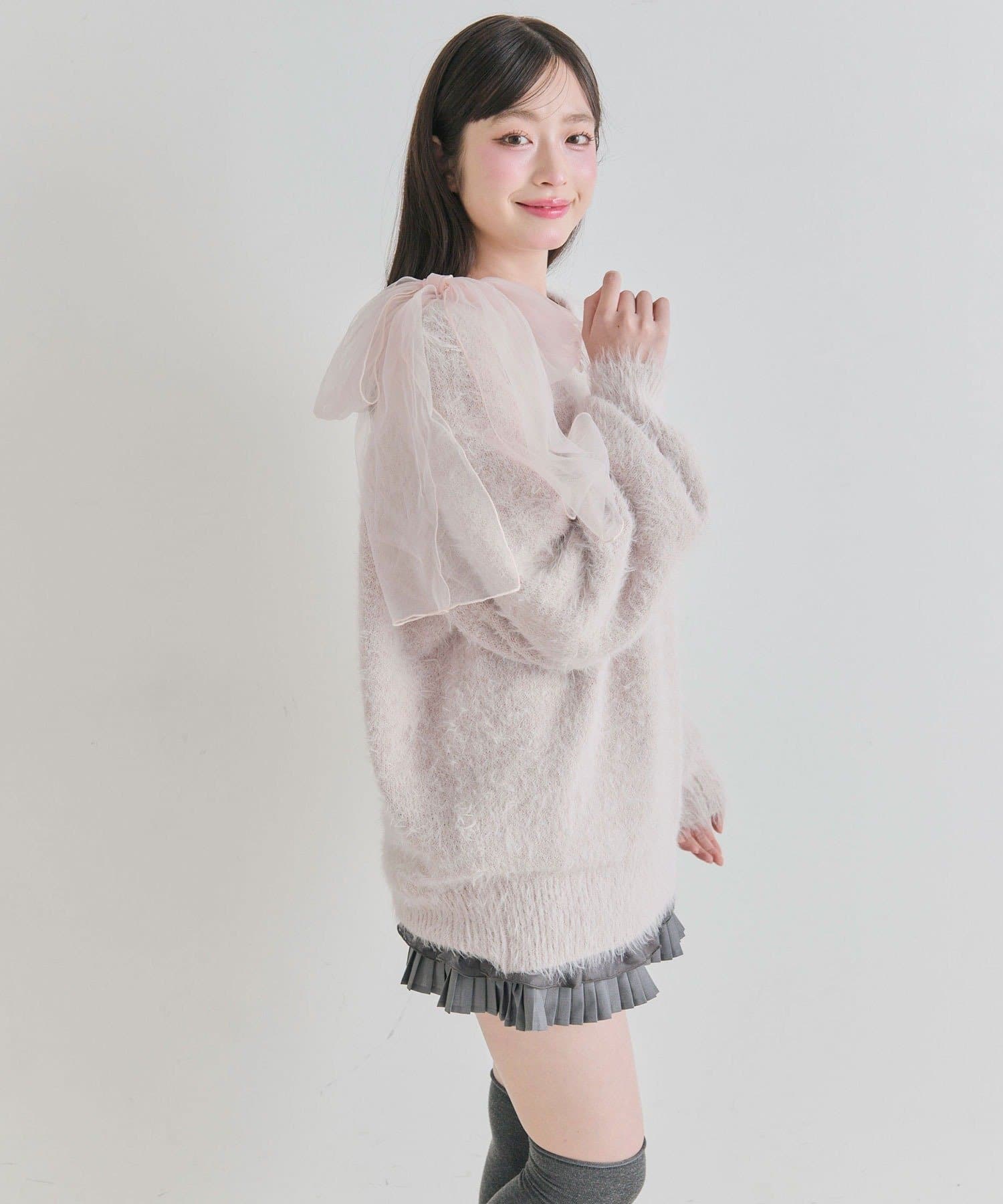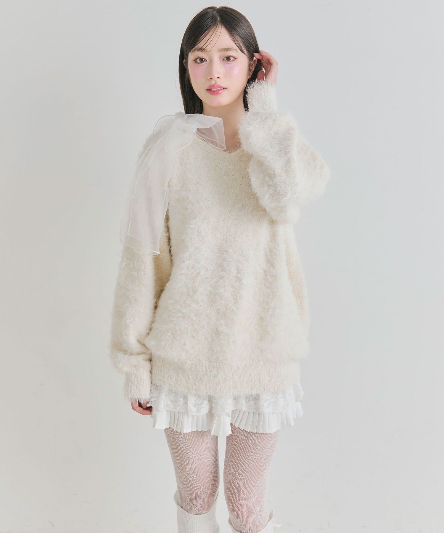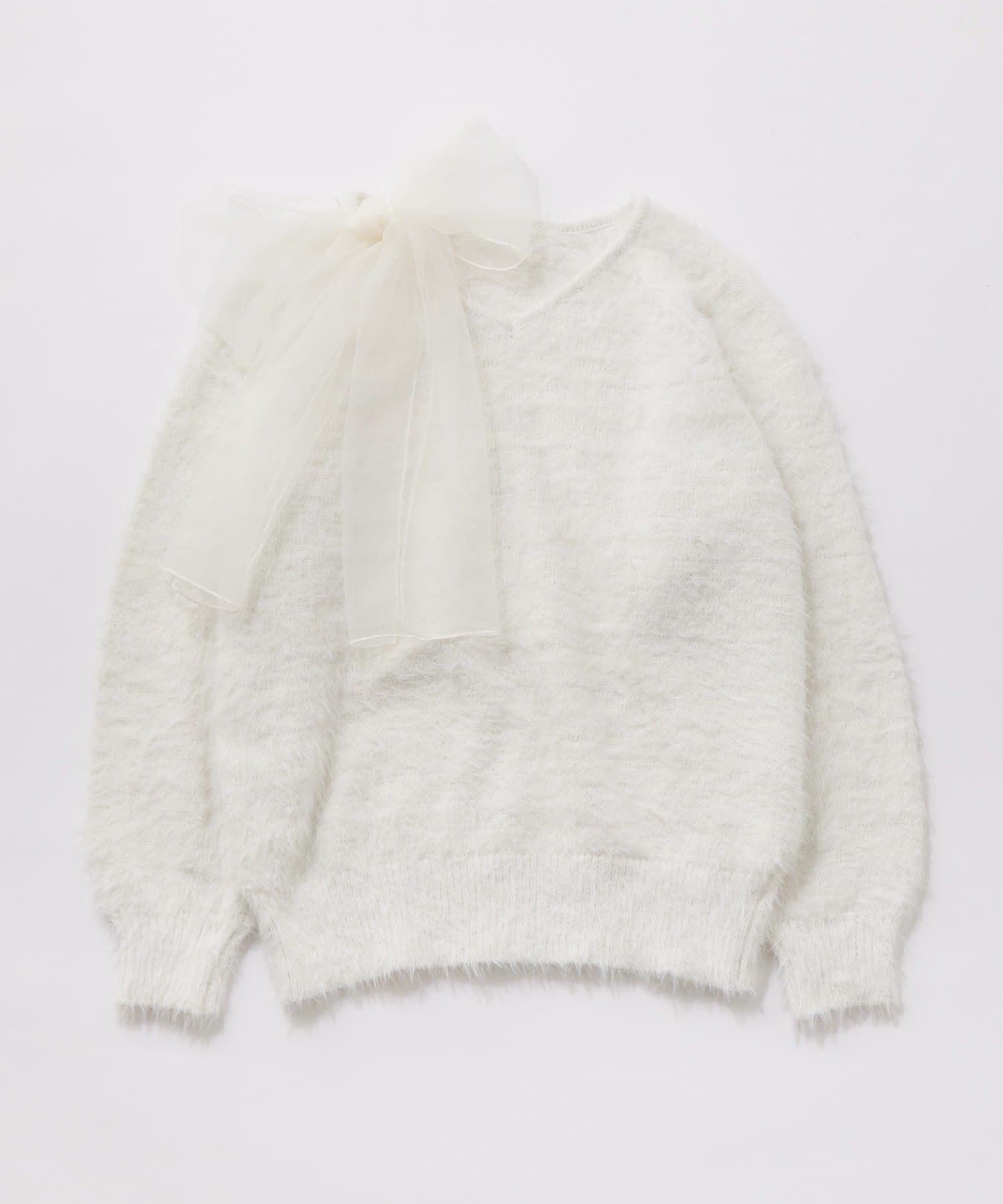 ・触り心地の良いシャギーニットに、大きなリボンをあしらったガーリーデザイン。