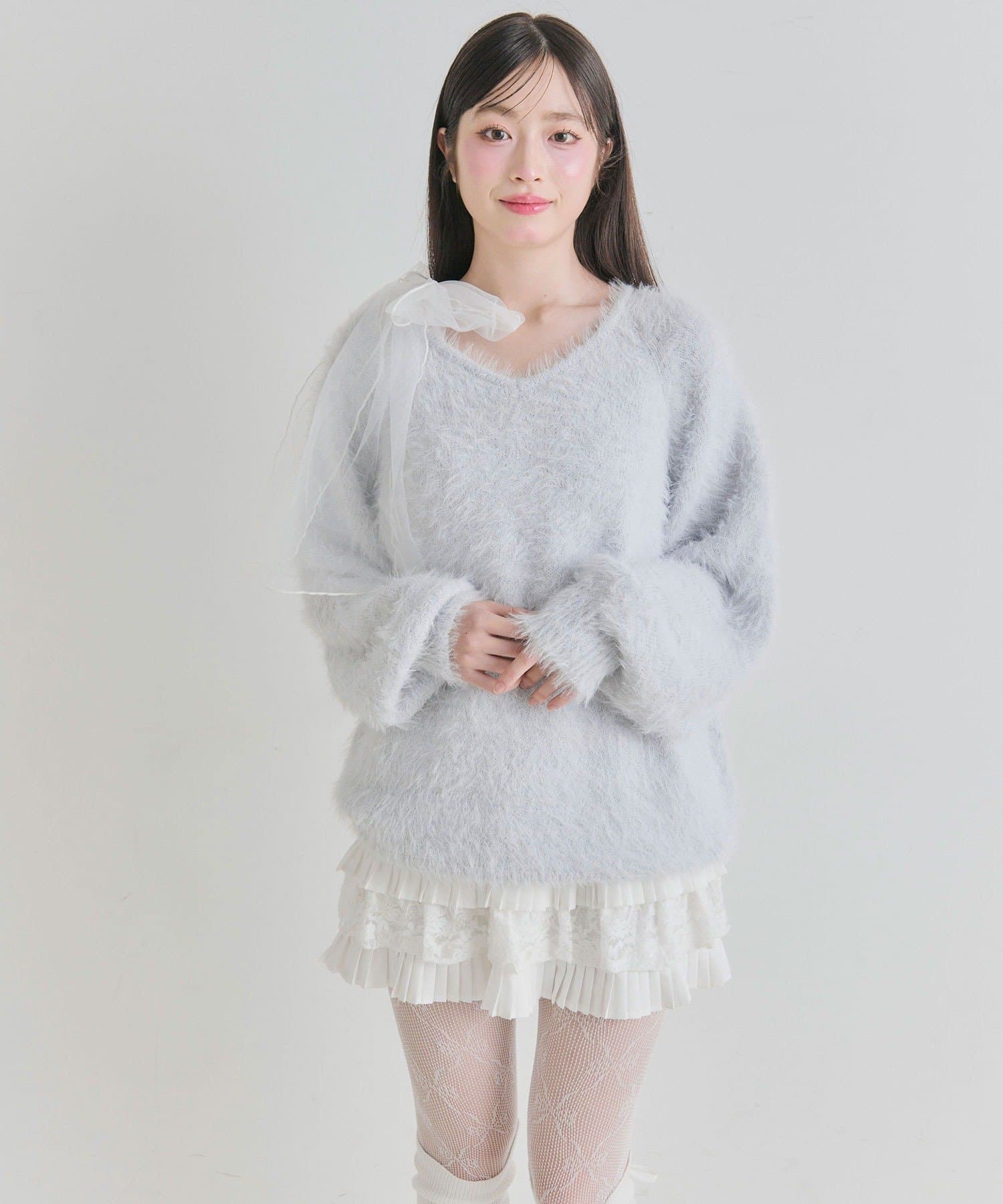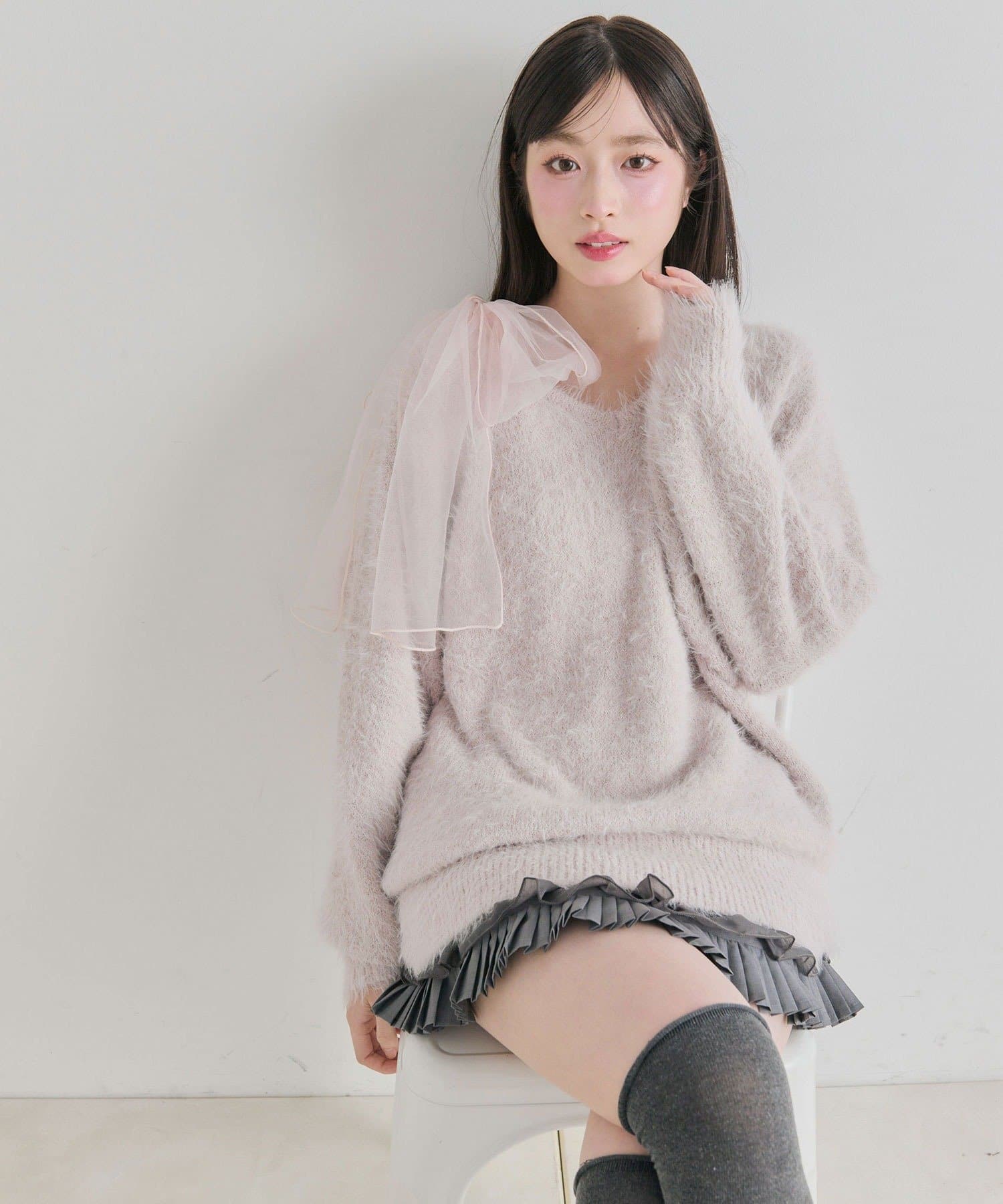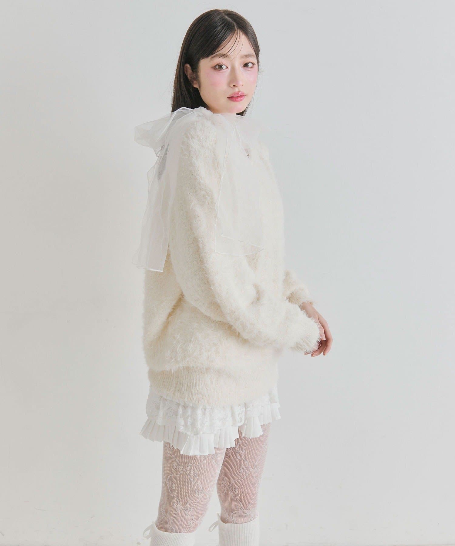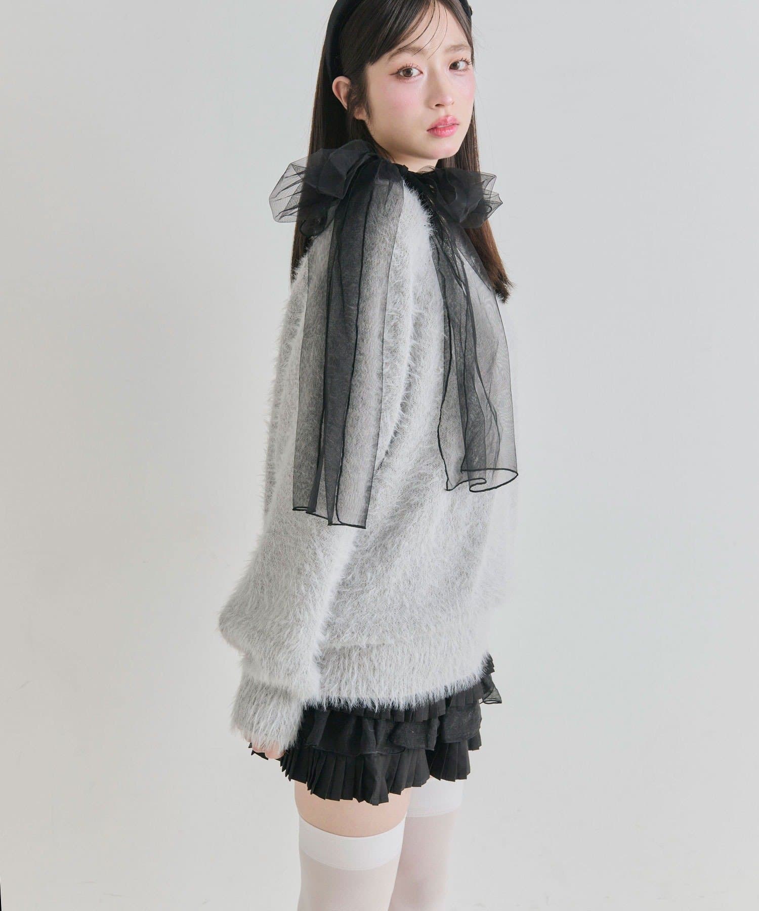 ・触り心地の良いシャギーニットに、大きなリボンをあしらったガーリーデザイン。