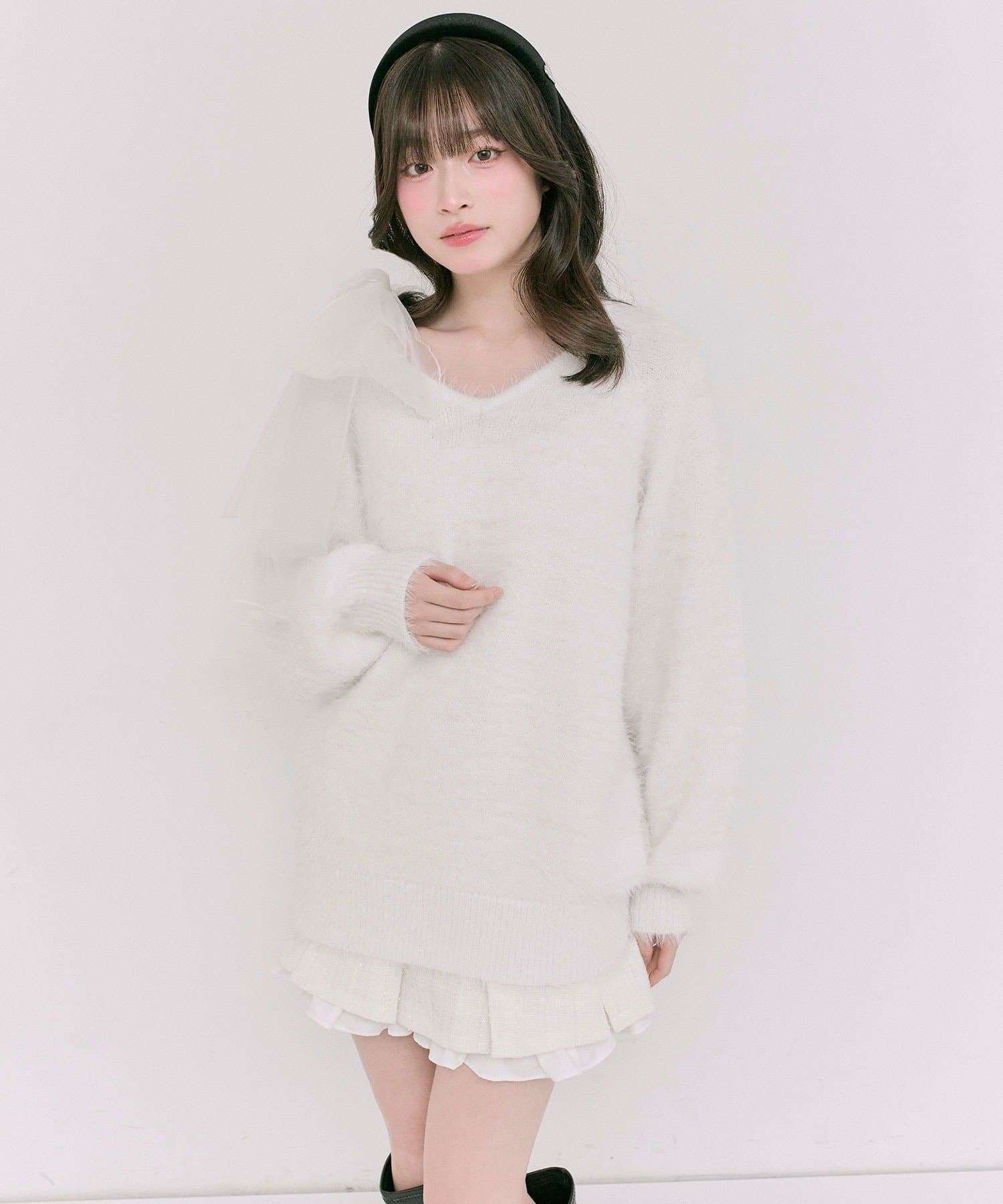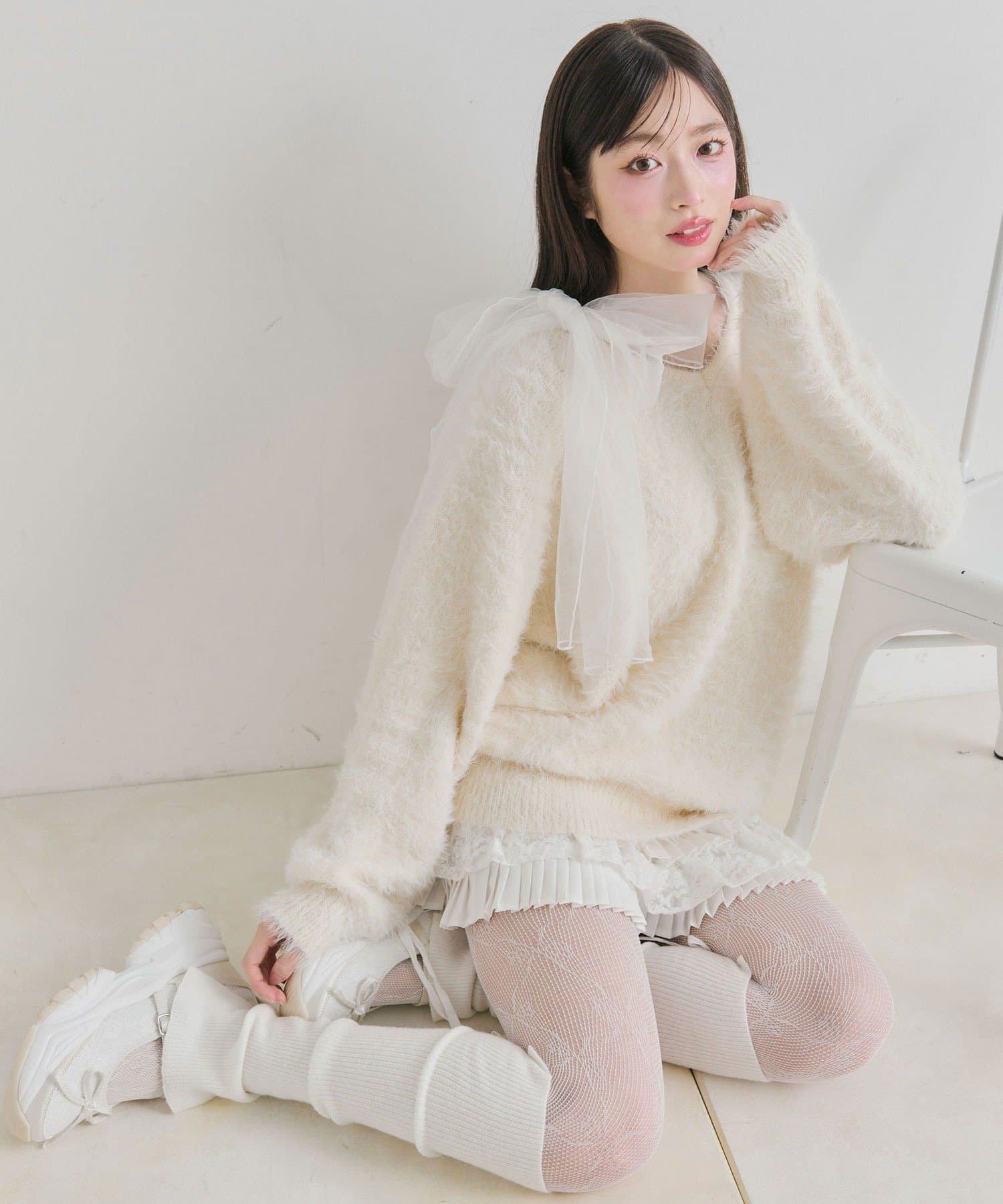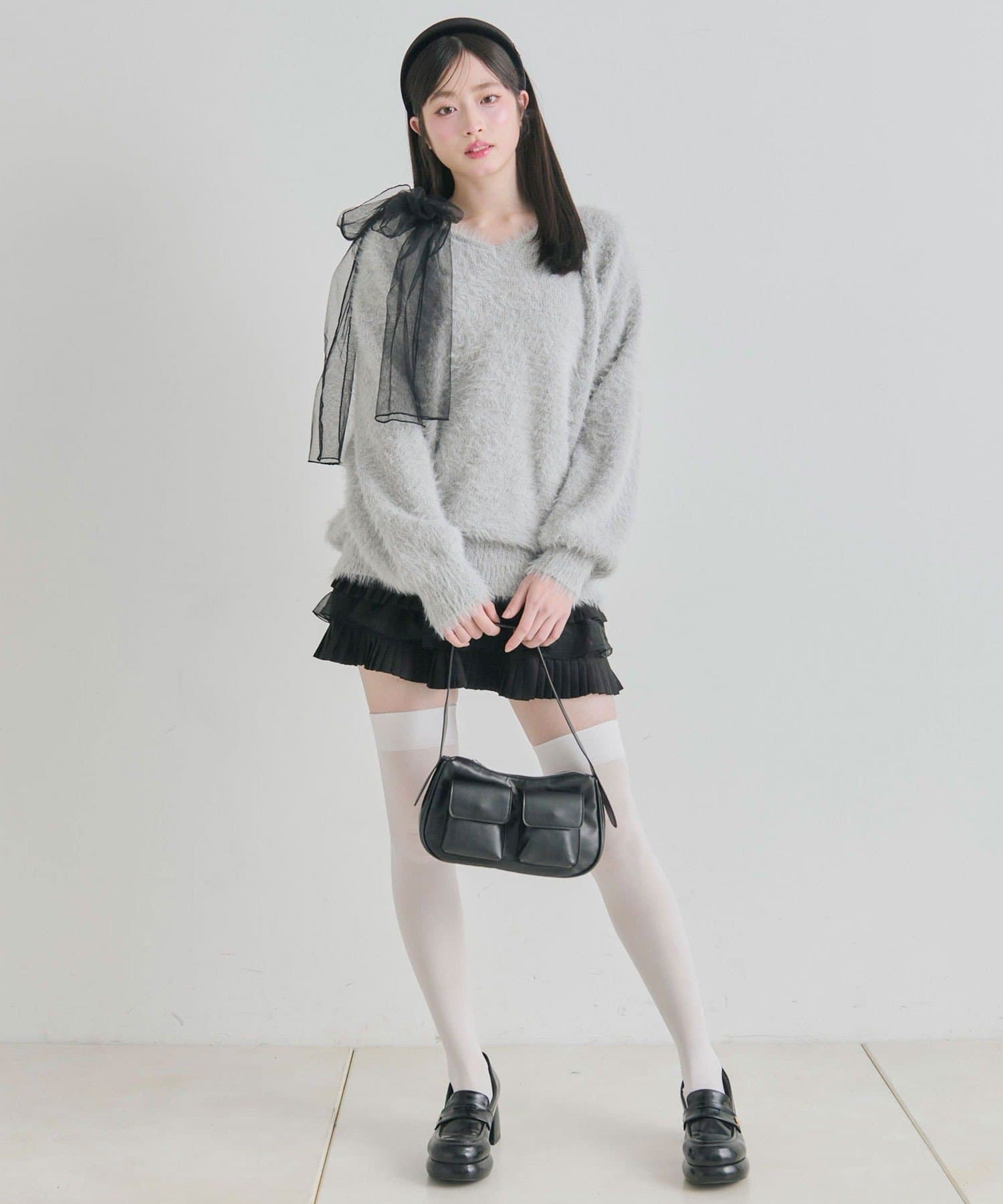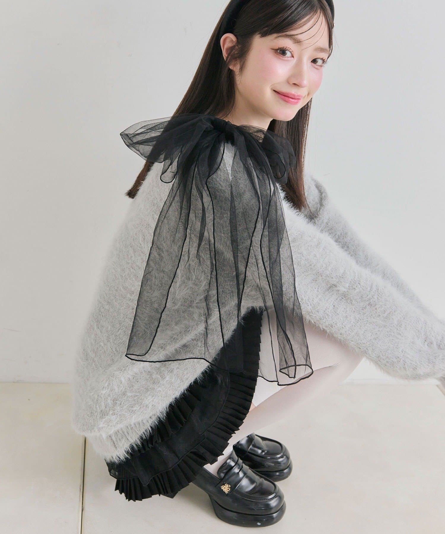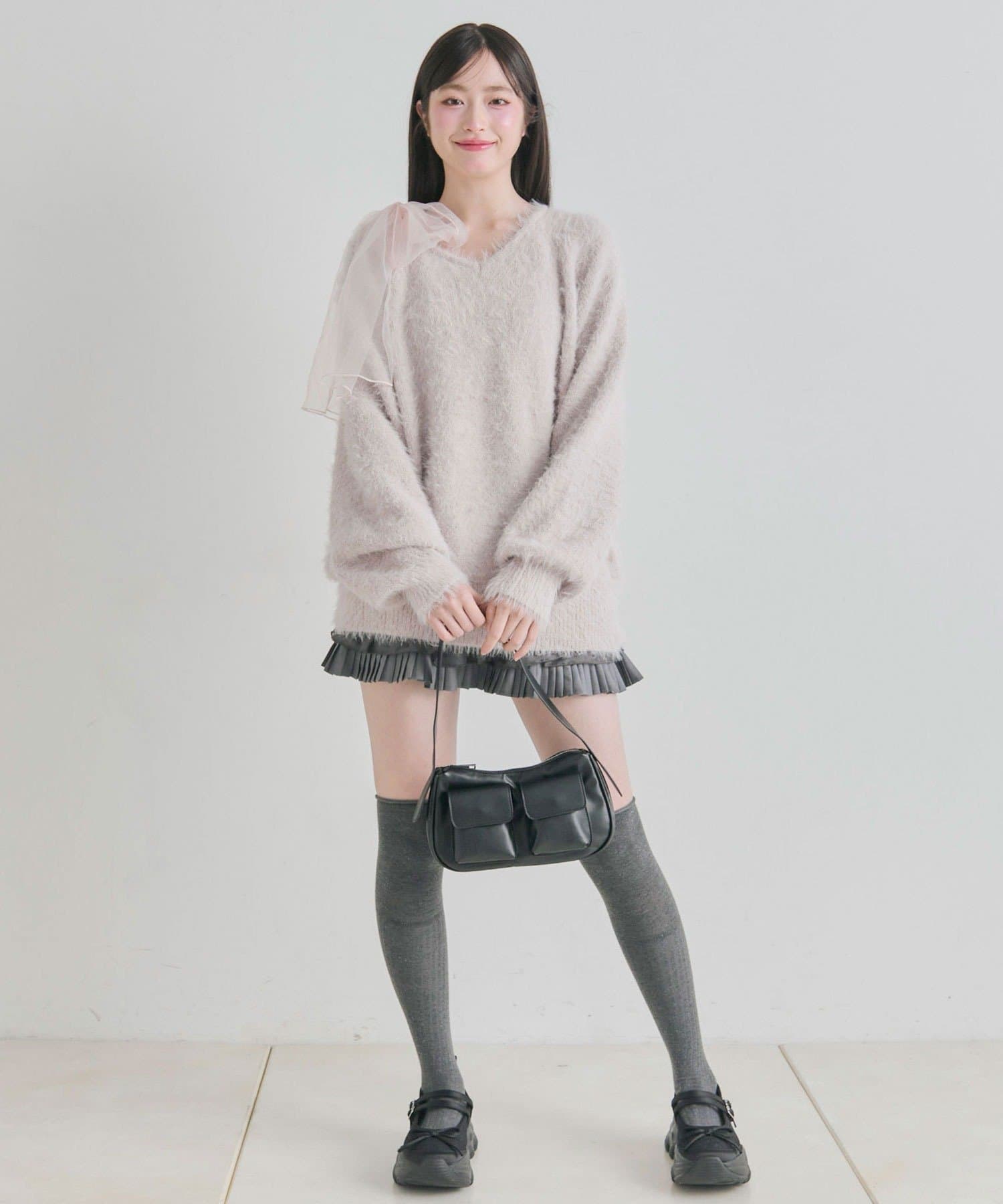 ・触り心地の良いシャギーニットに、大きなリボンをあしらったガーリーデザイン。