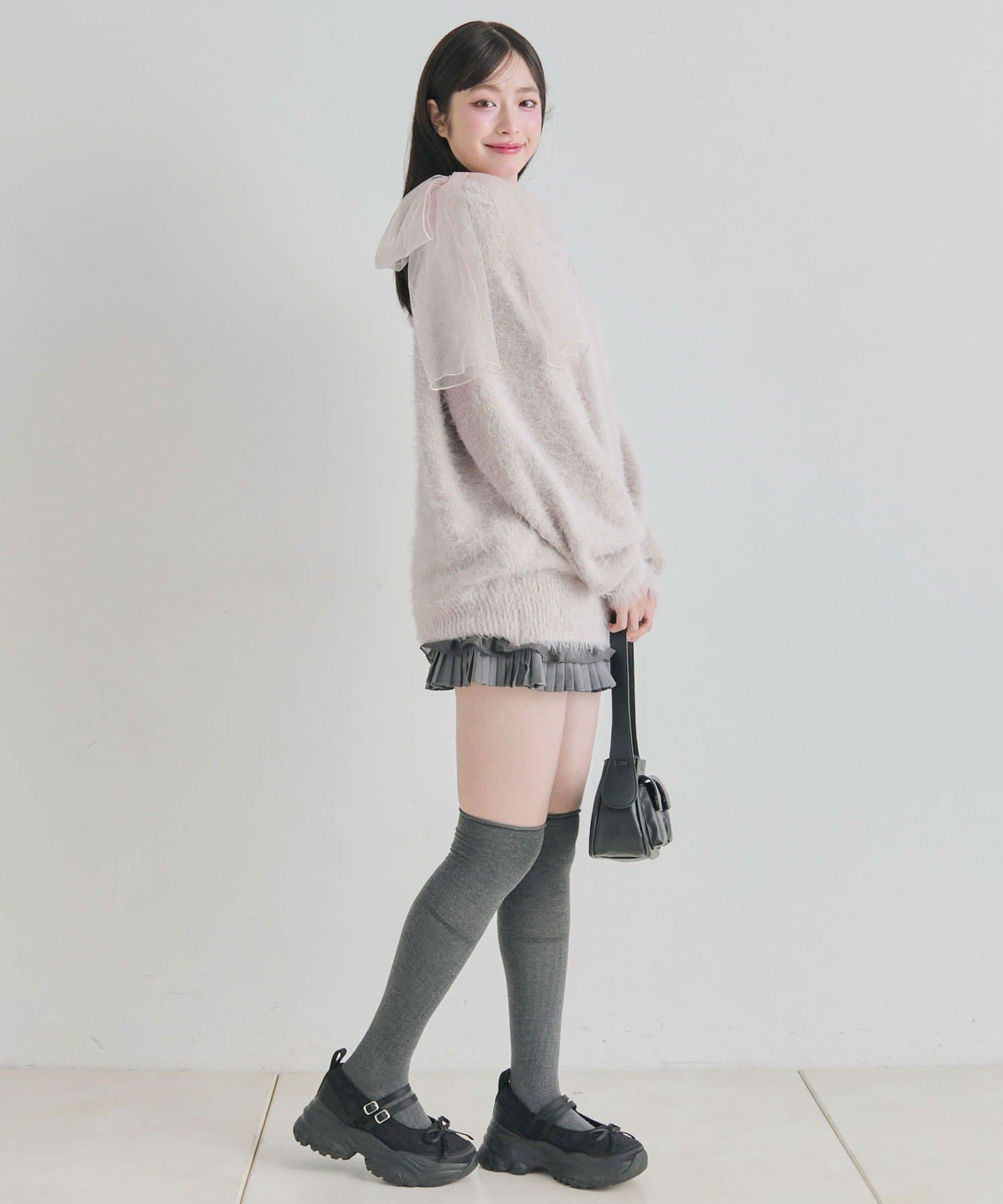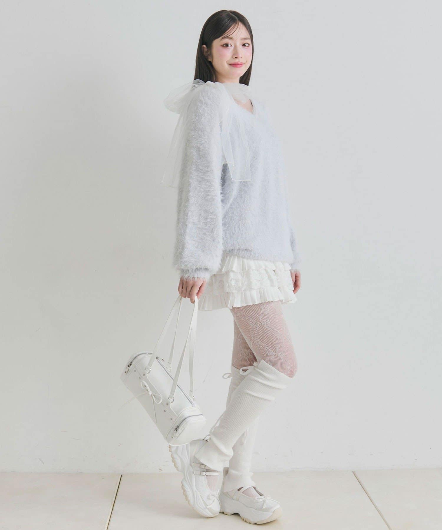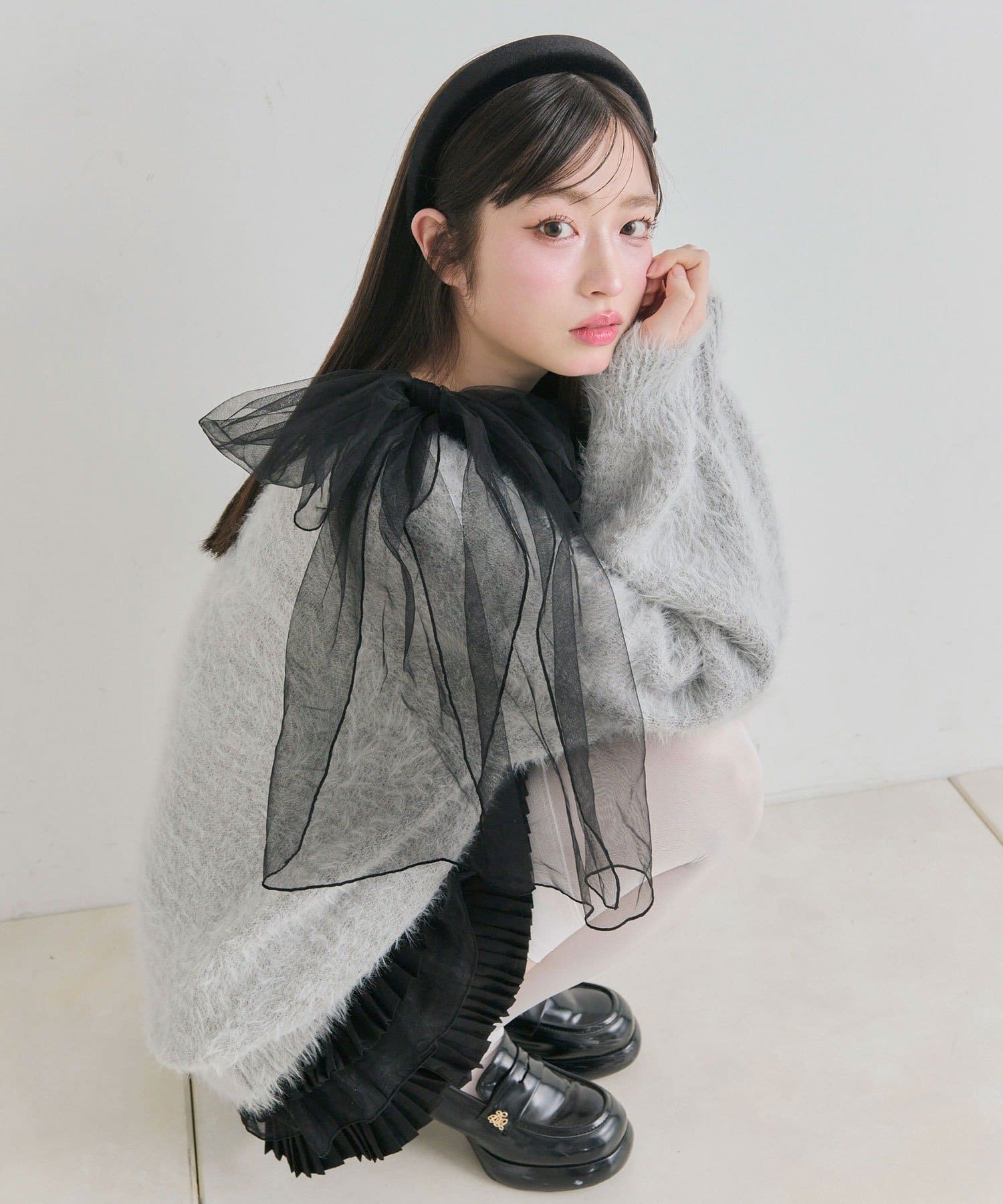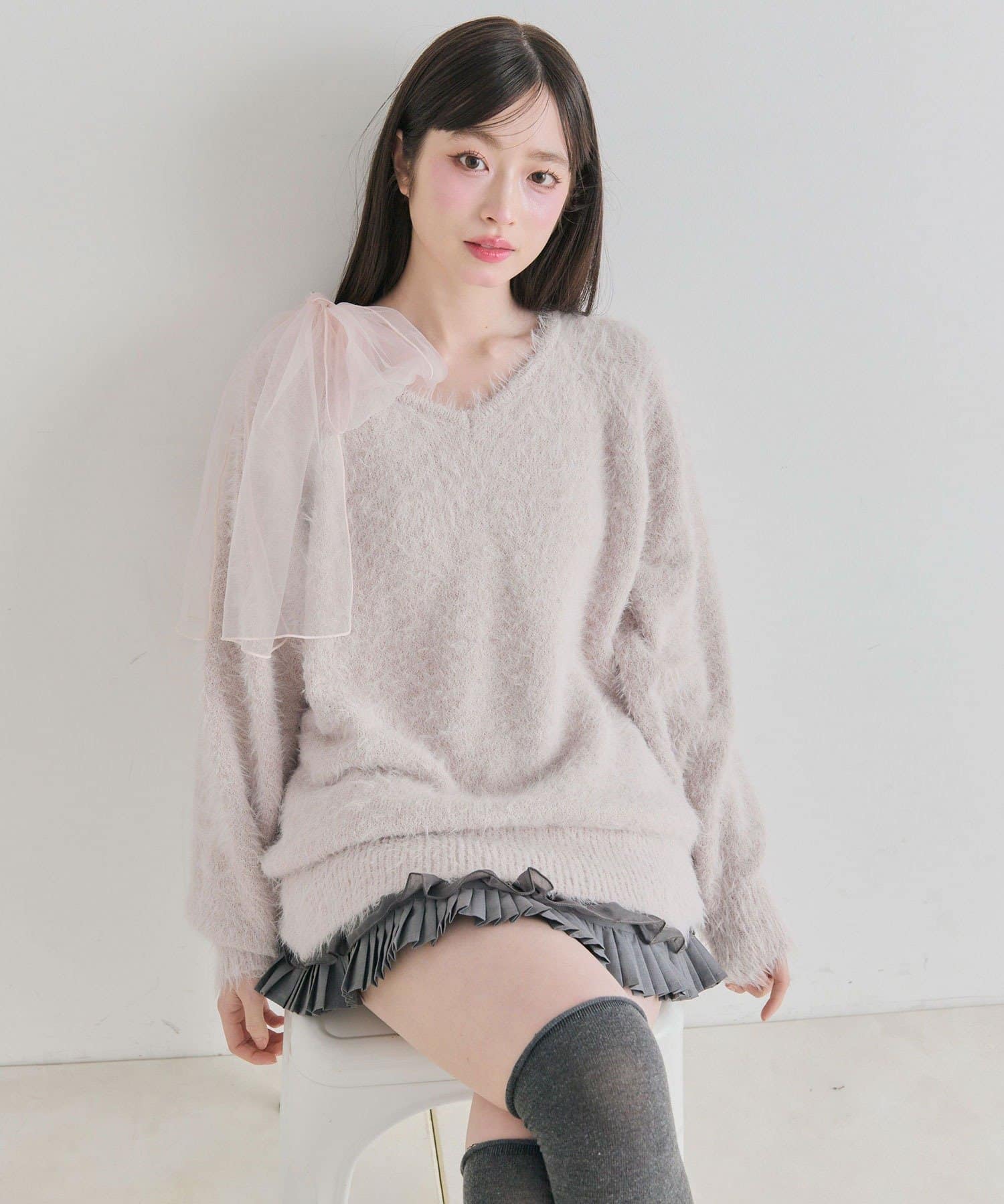 ・触り心地の良いシャギーニットに、大きなリボンをあしらったガーリーデザイン。