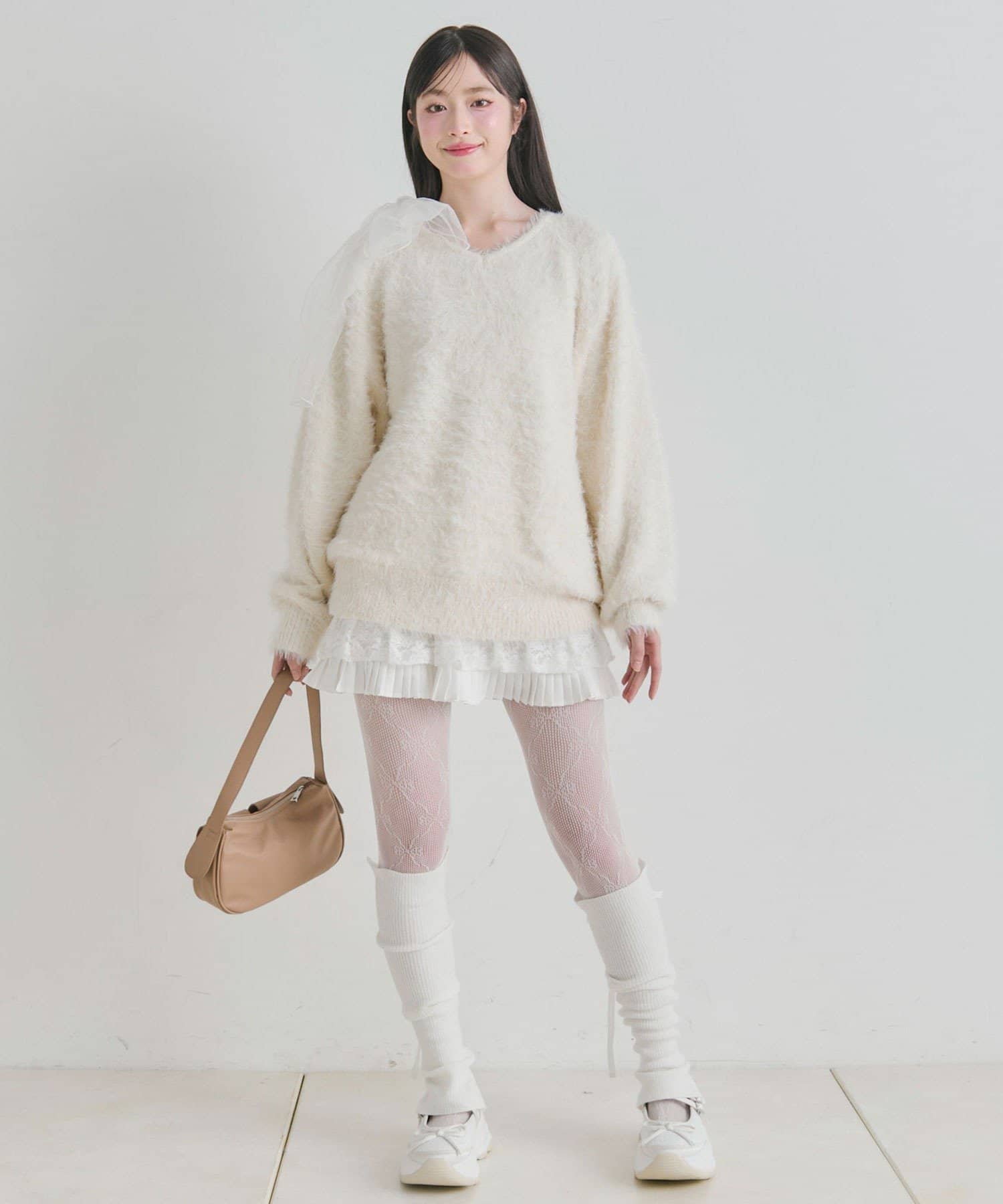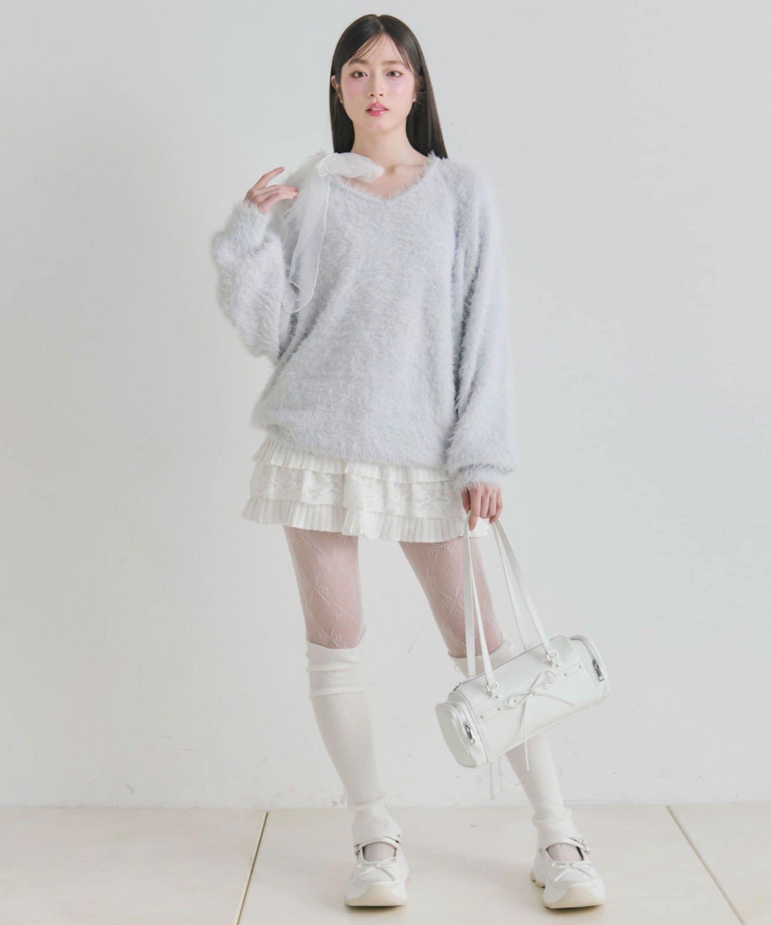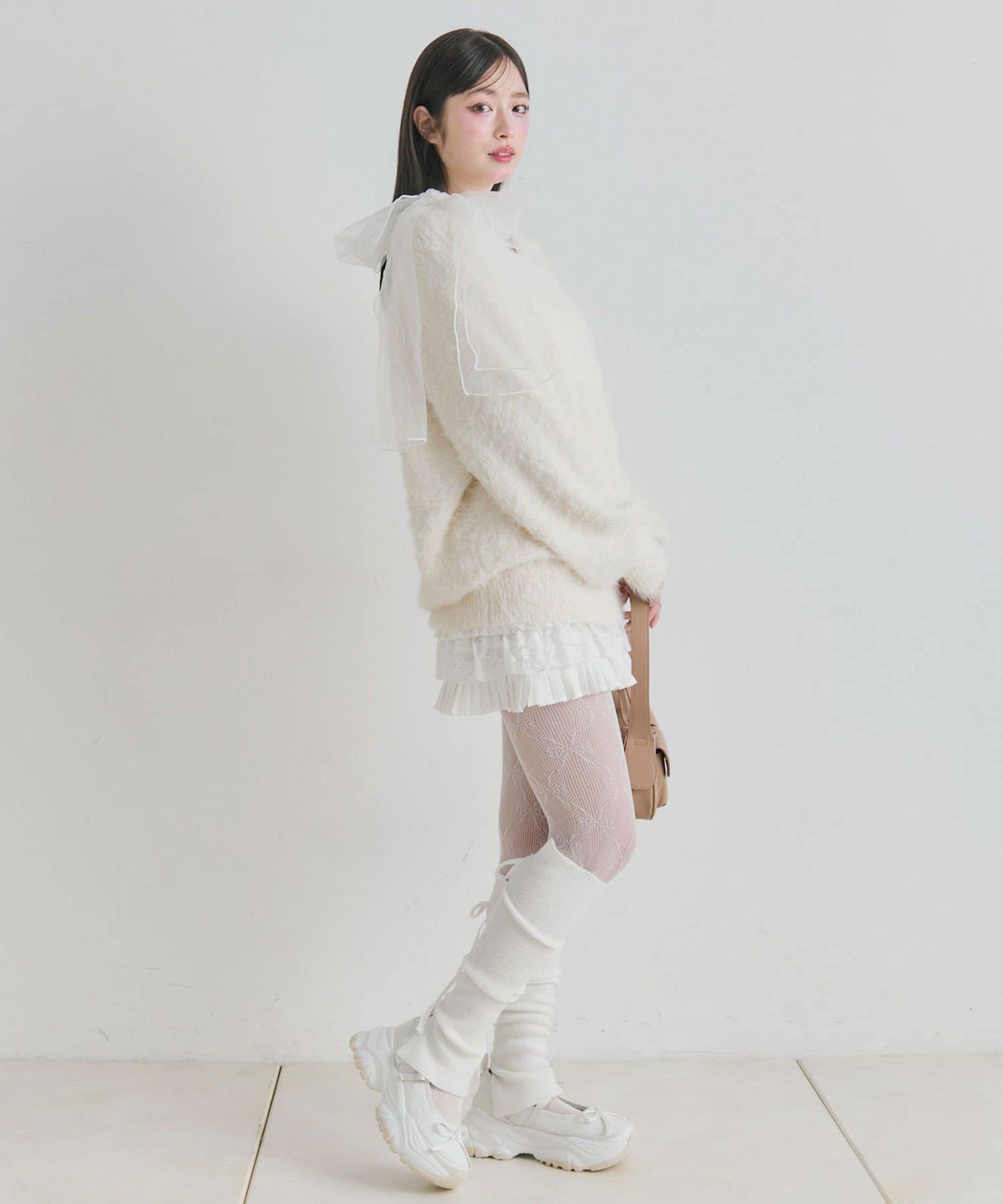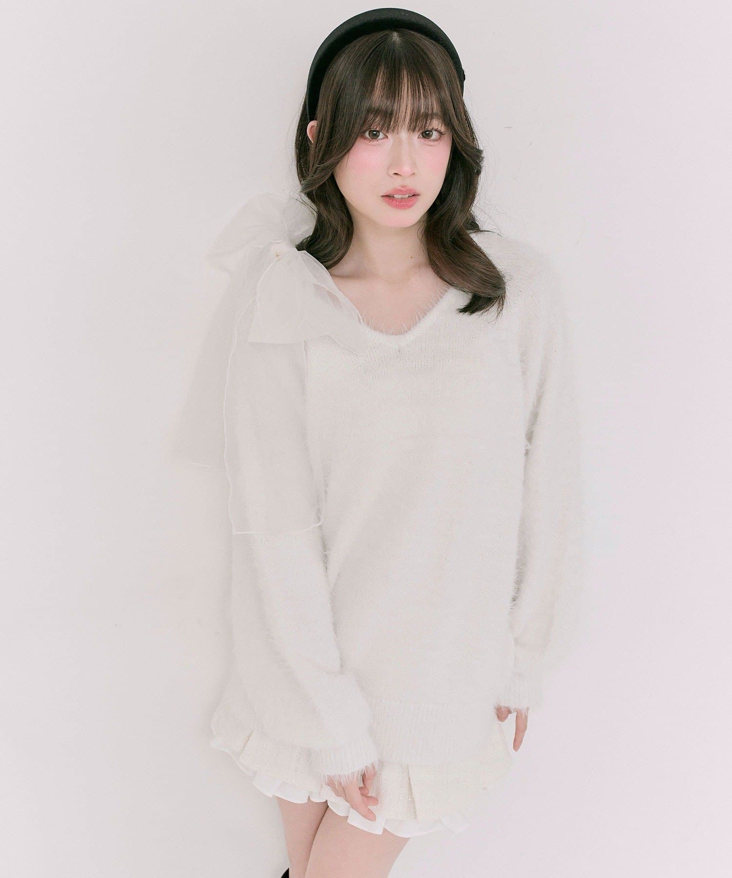 ・触り心地の良いシャギーニットに、大きなリボンをあしらったガーリーデザイン。
