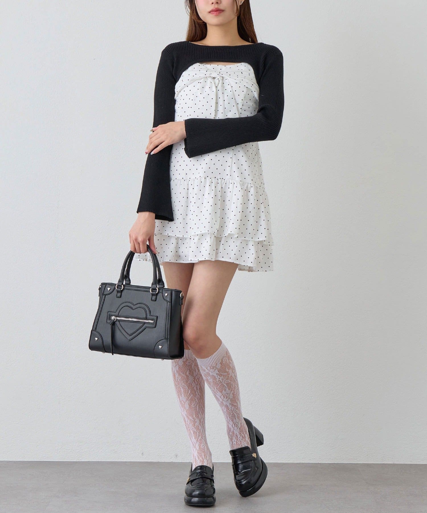・大きいリボンが映え間違いなしなキャミワンピースと、華奢見えするニットのセット。