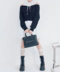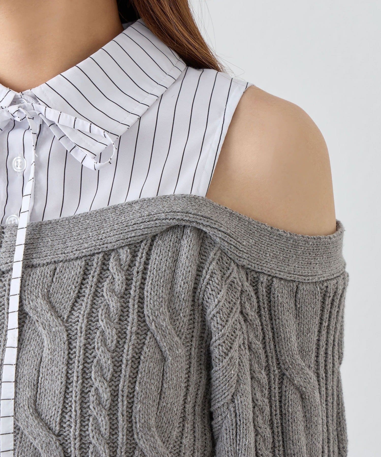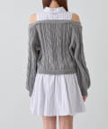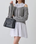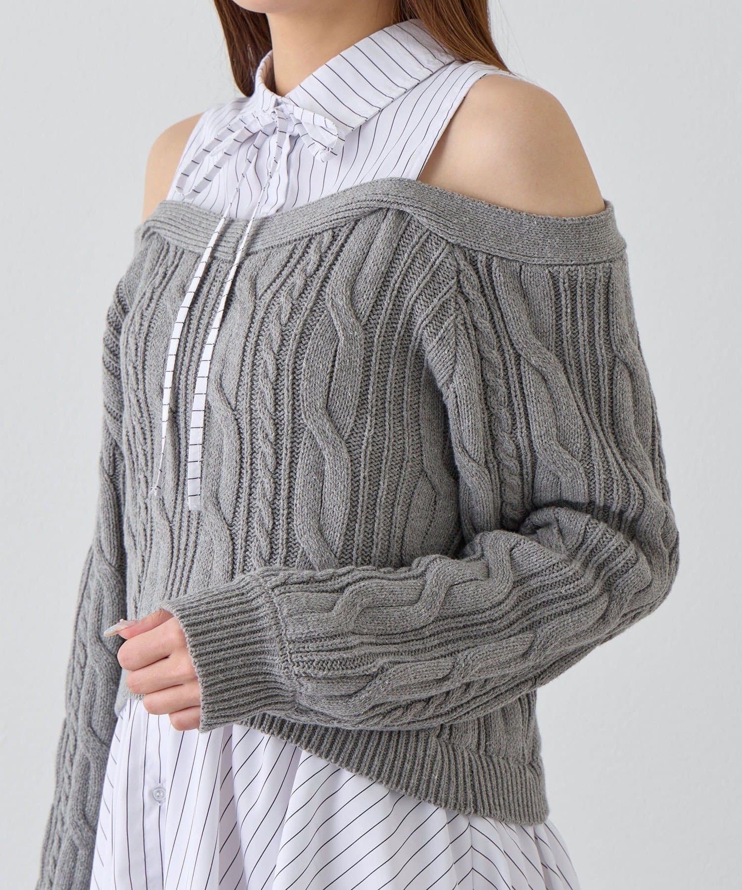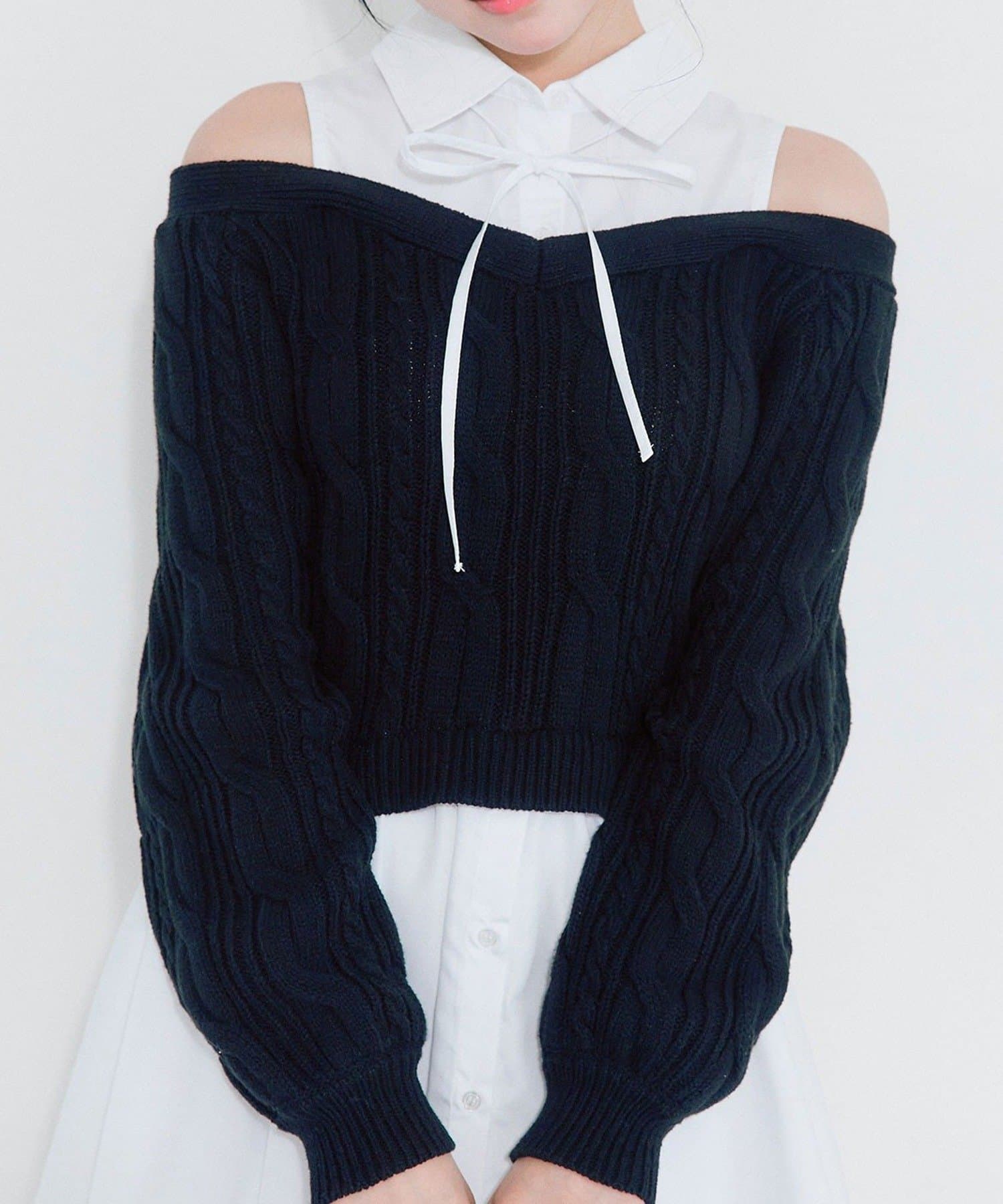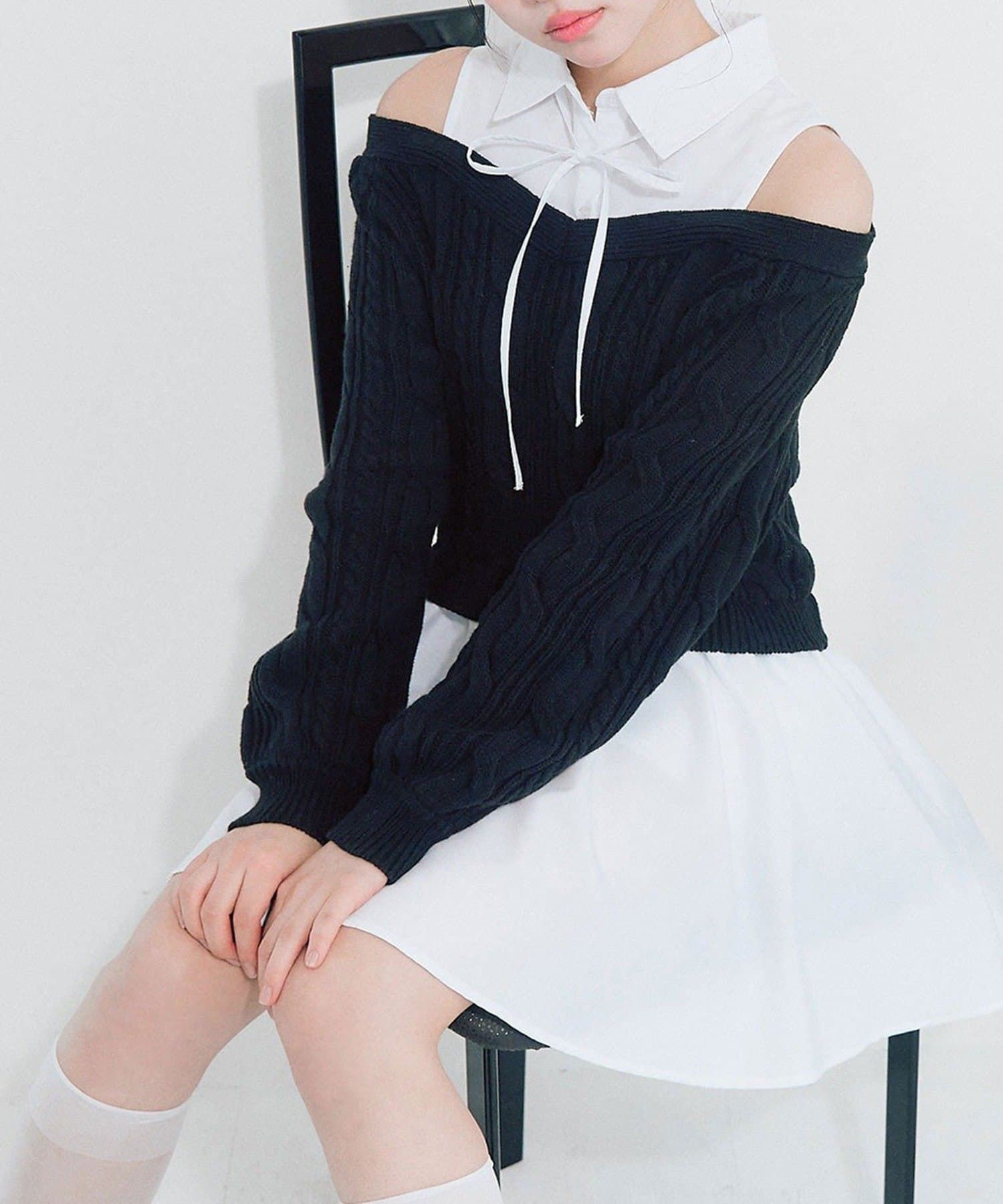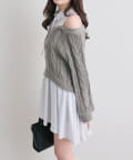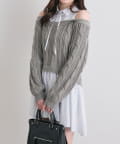 ・ニットの隙間から覗く肩のラインと華奢なリボンが、女性らしさと抜け感をプラスします。