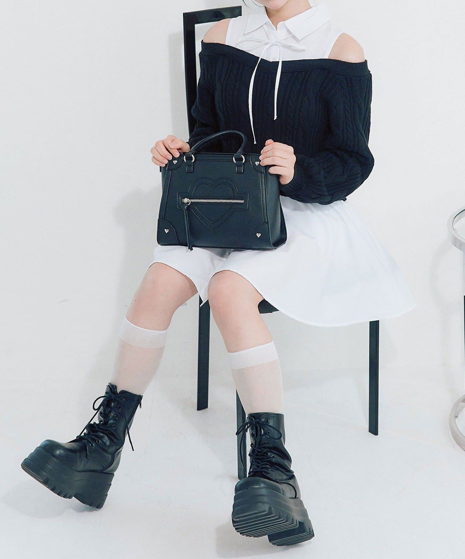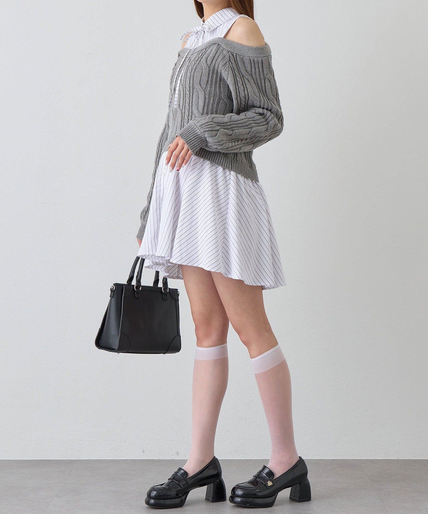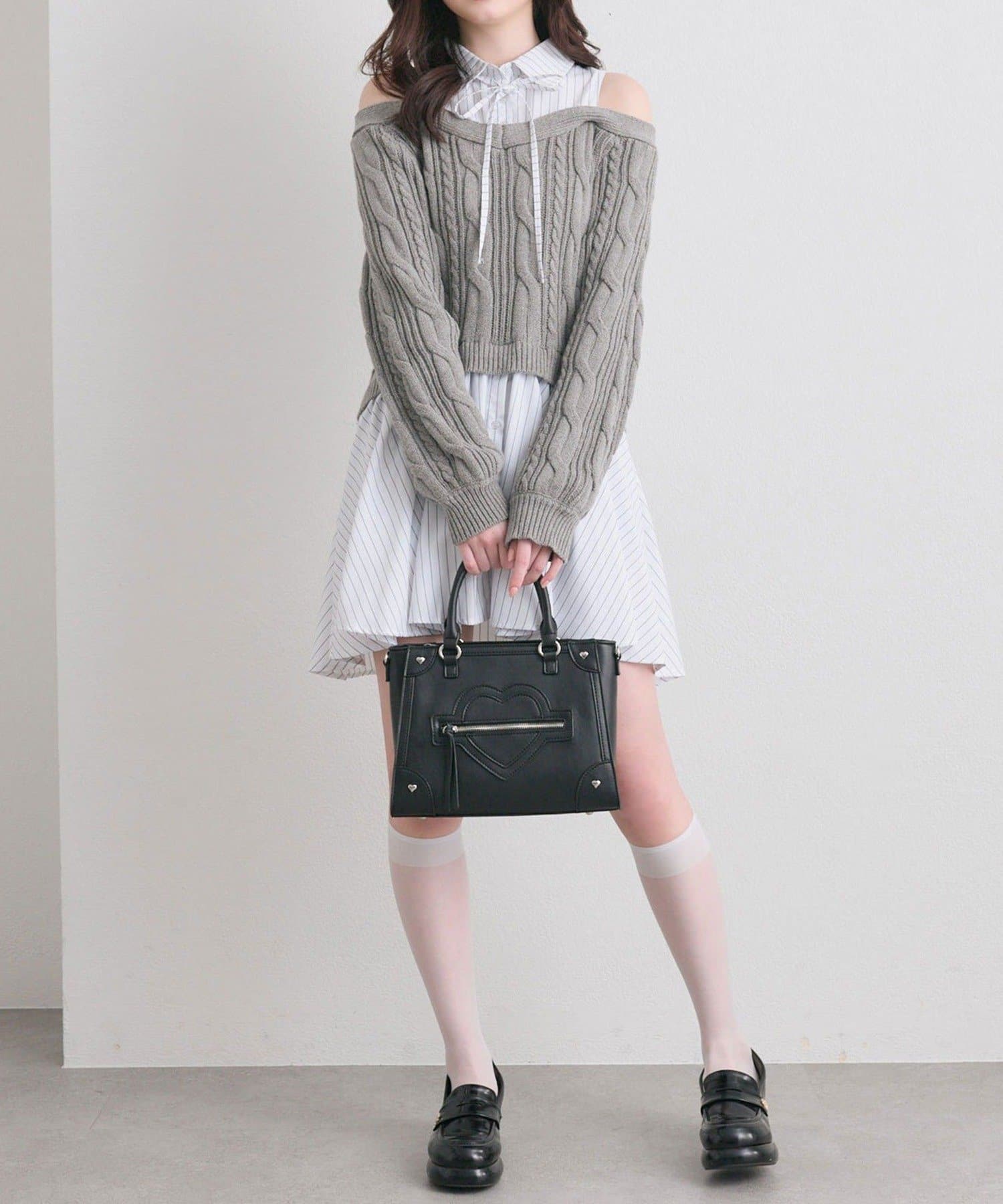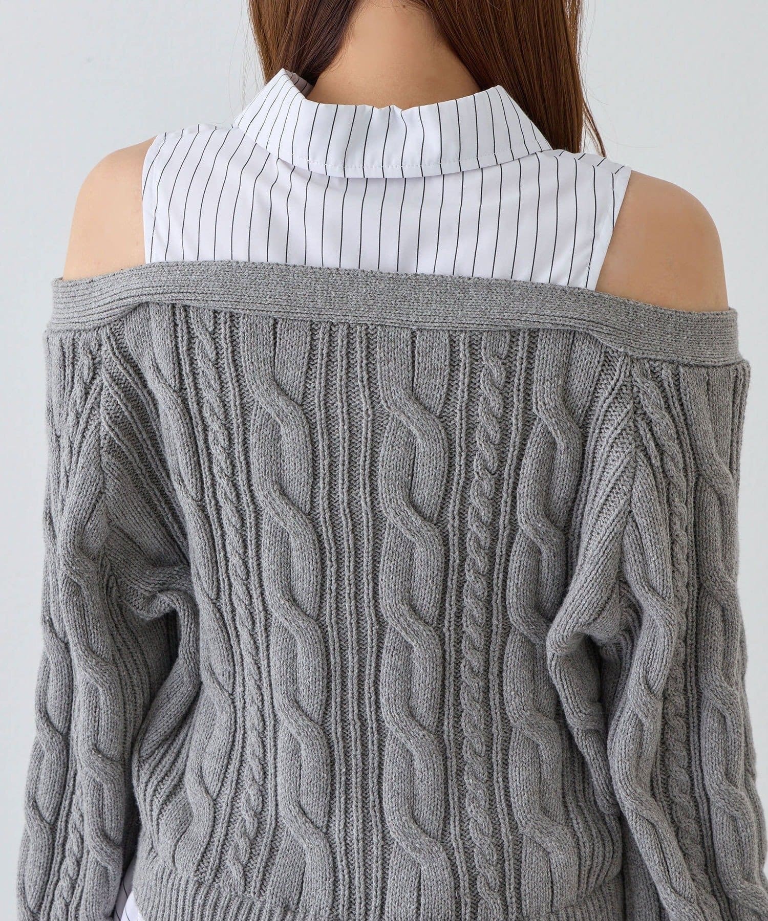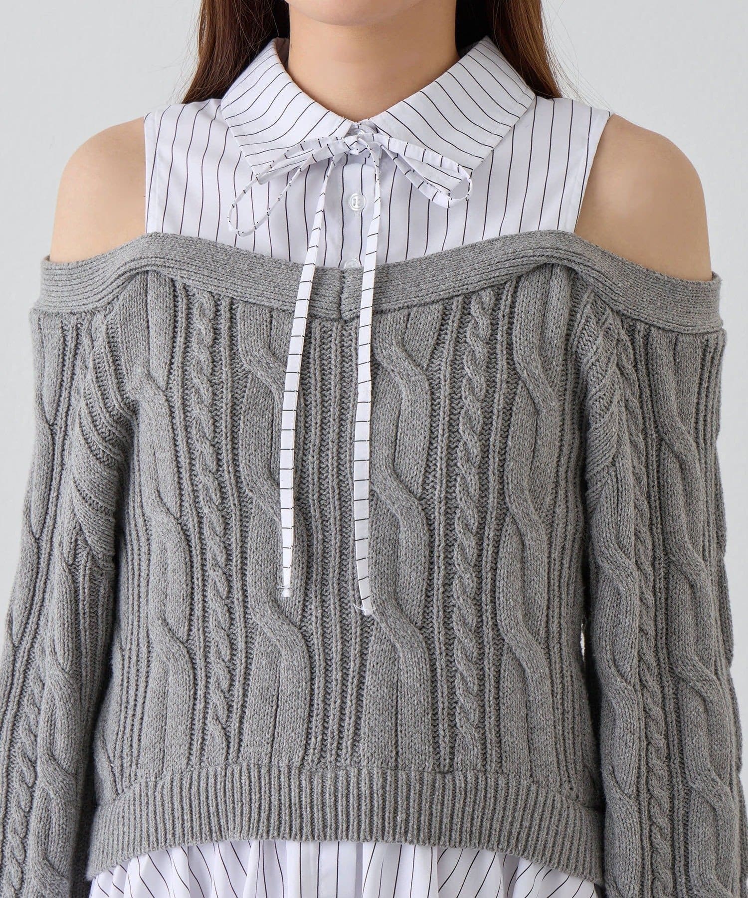 ・ニットの隙間から覗く肩のラインと華奢なリボンが、女性らしさと抜け感をプラスします。