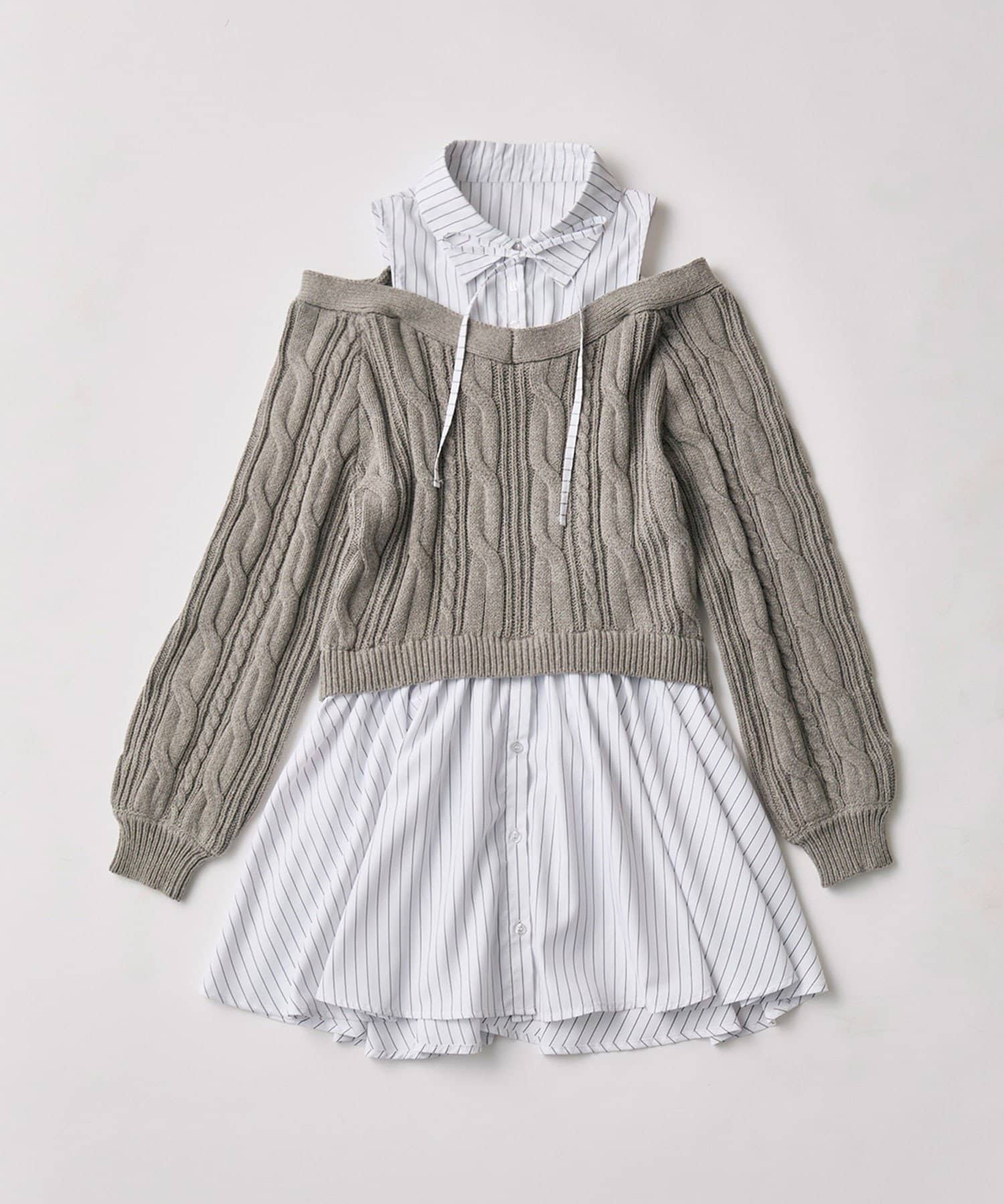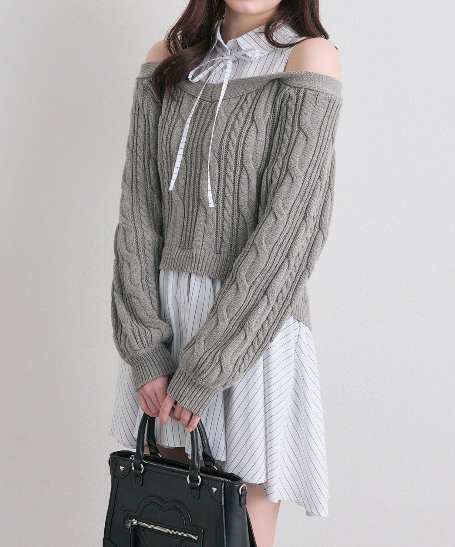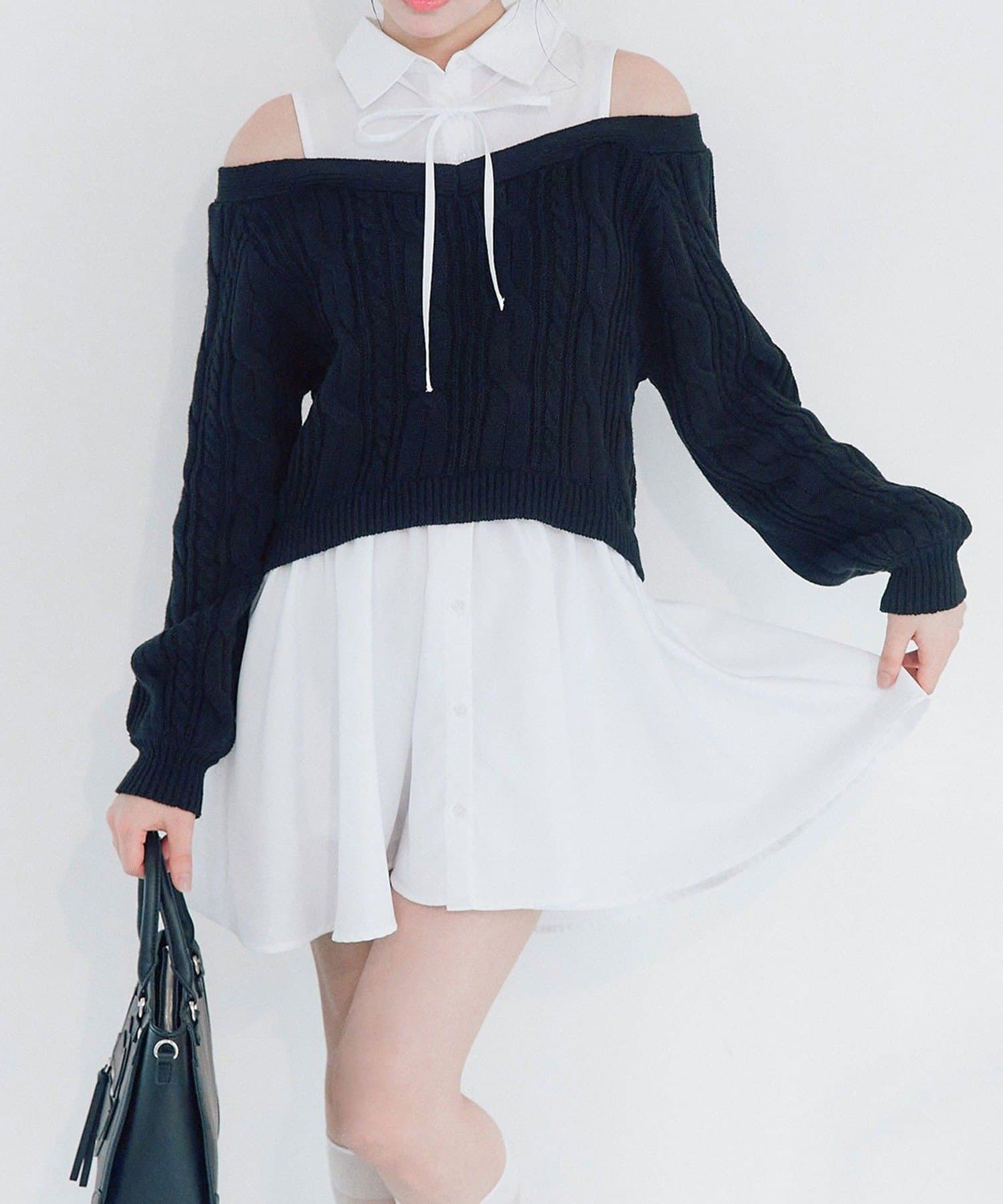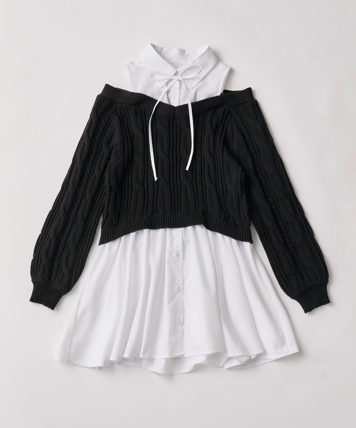 ・シャツワンピにオフショルニットを重ねたような、1枚で着映えするドッキングデザイン。