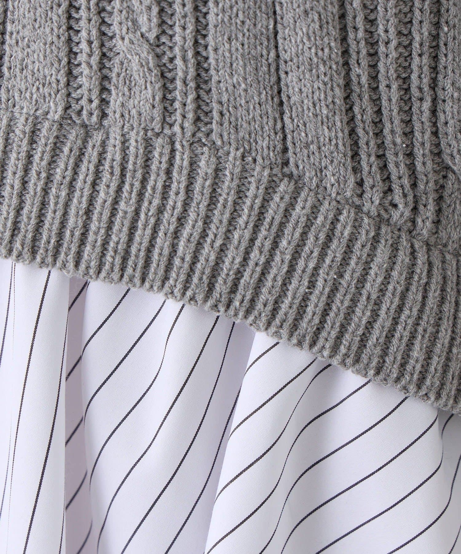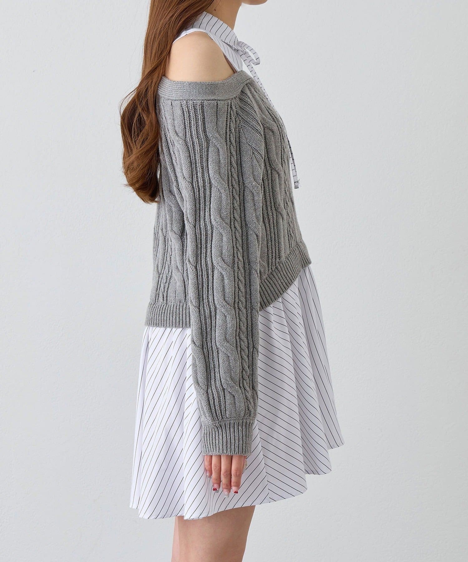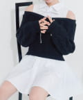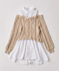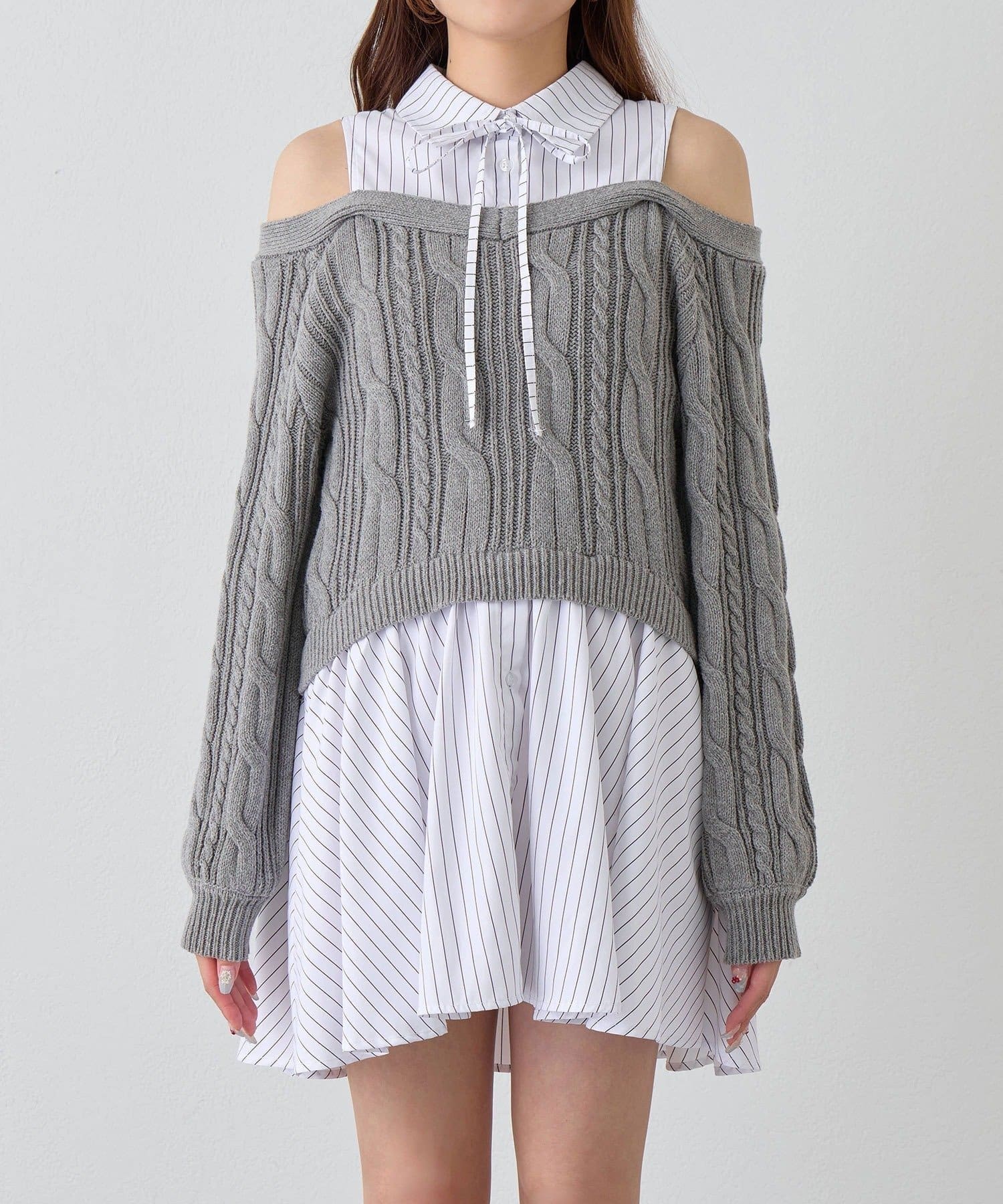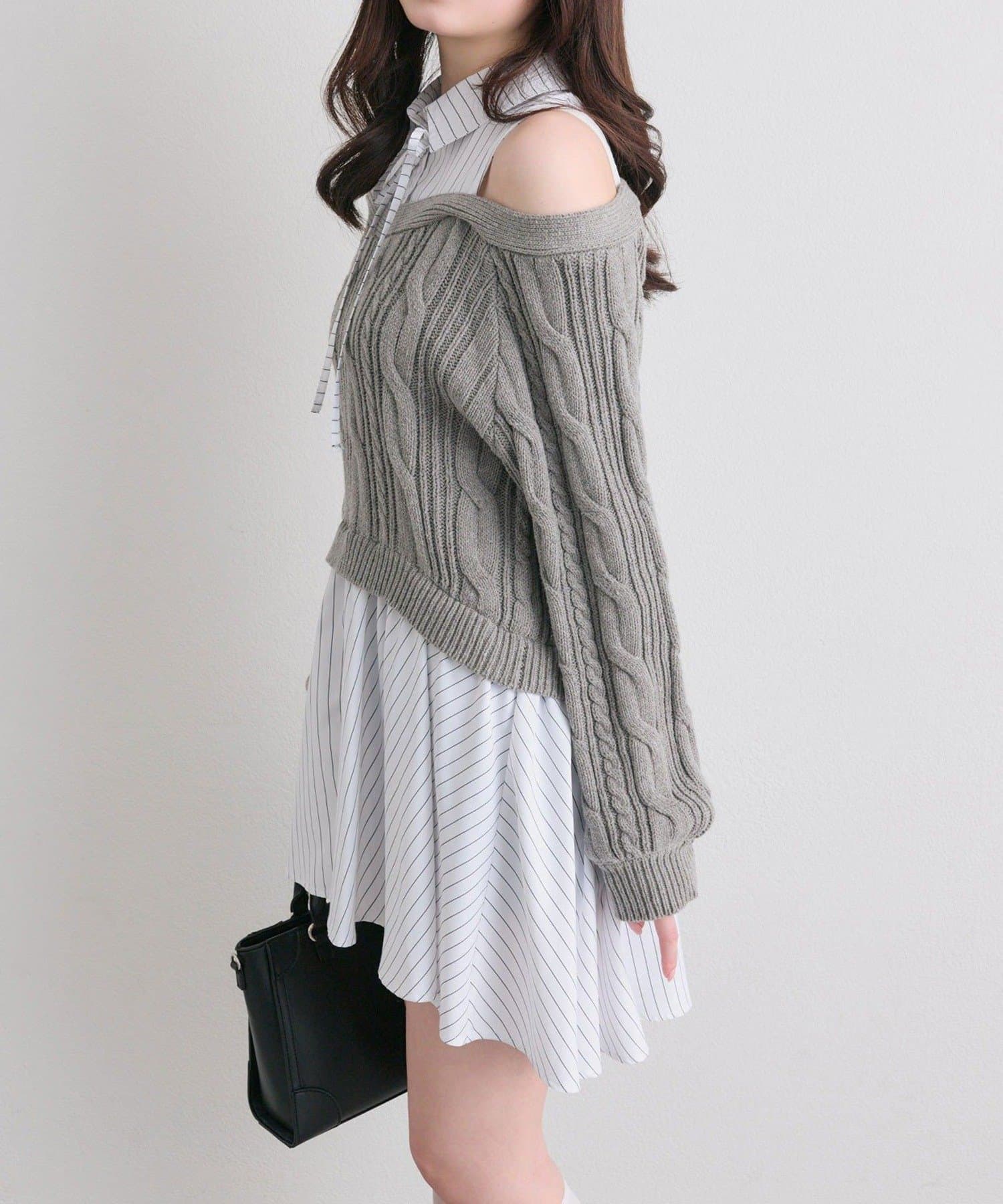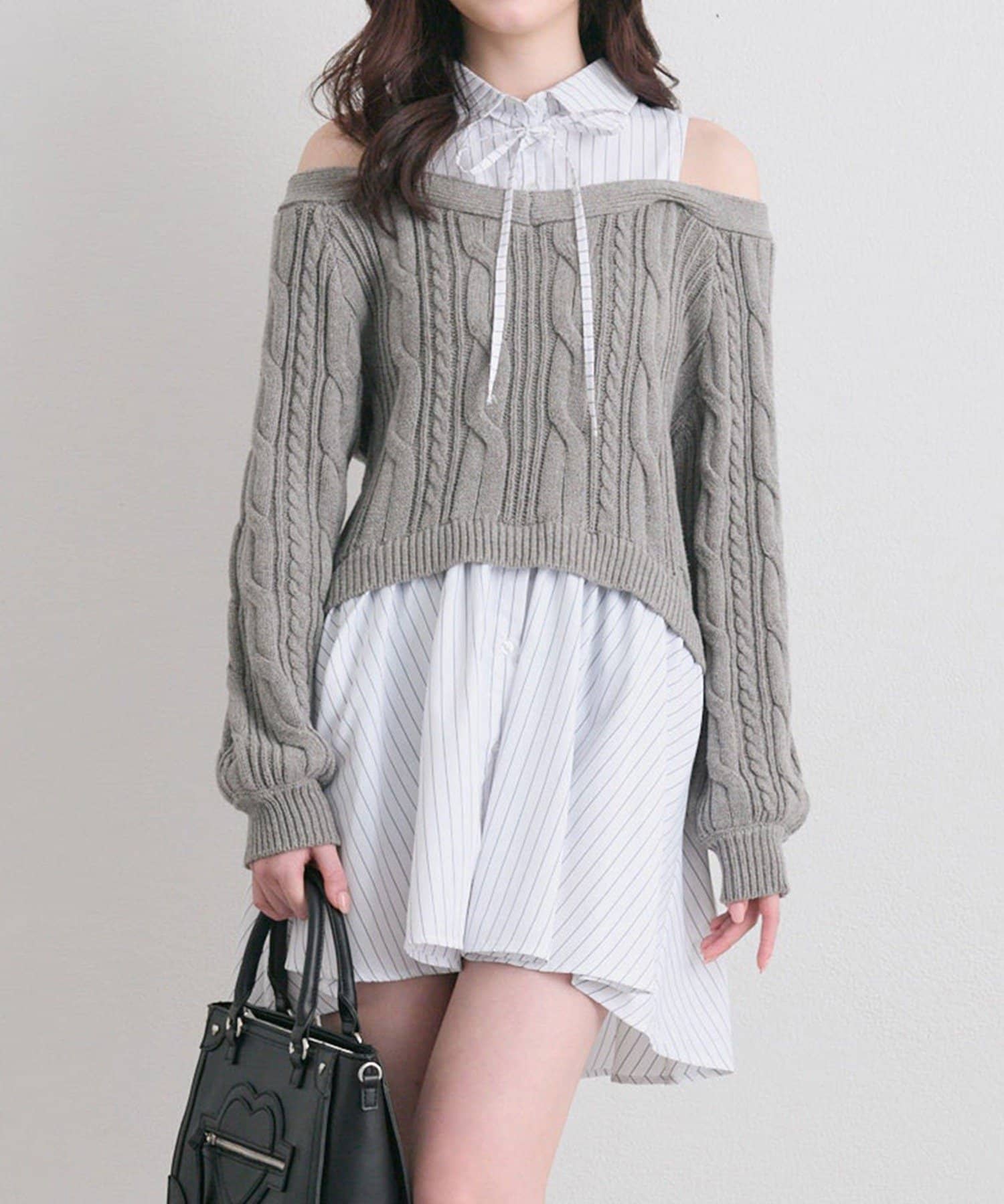 ・シャツワンピにオフショルニットを重ねたような、1枚で着映えするドッキングデザイン。
