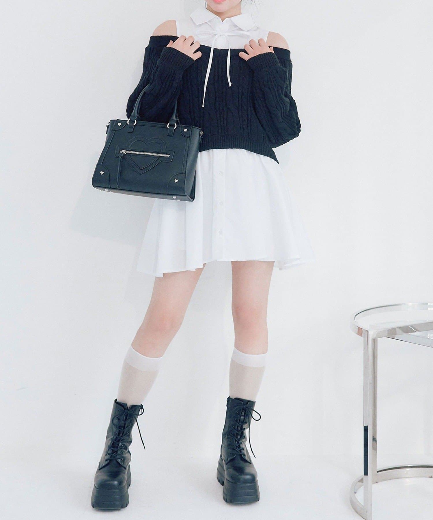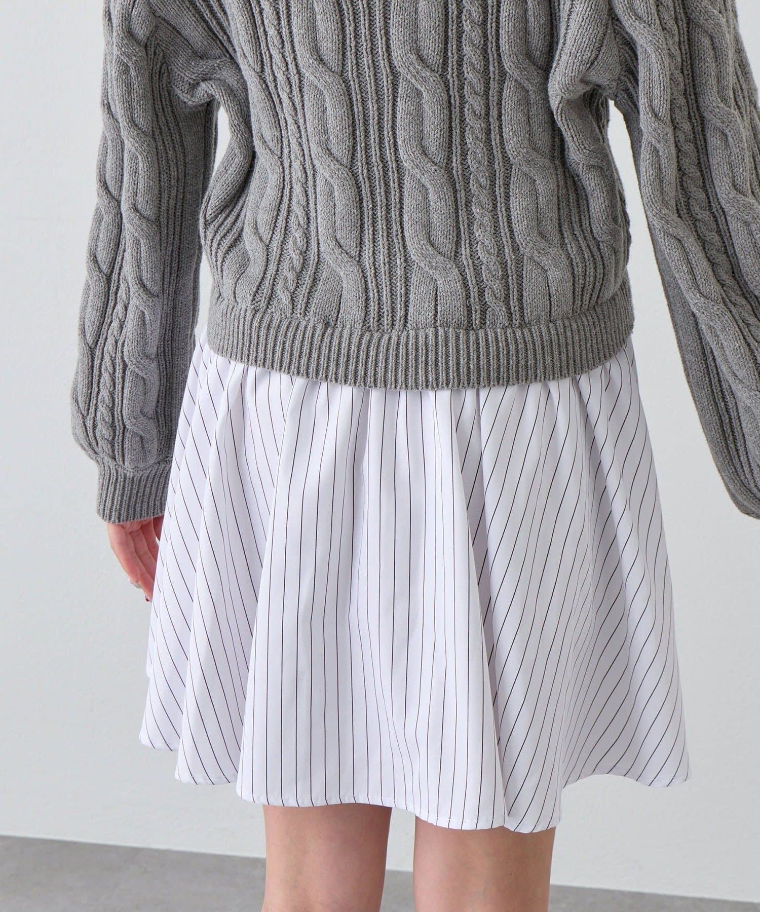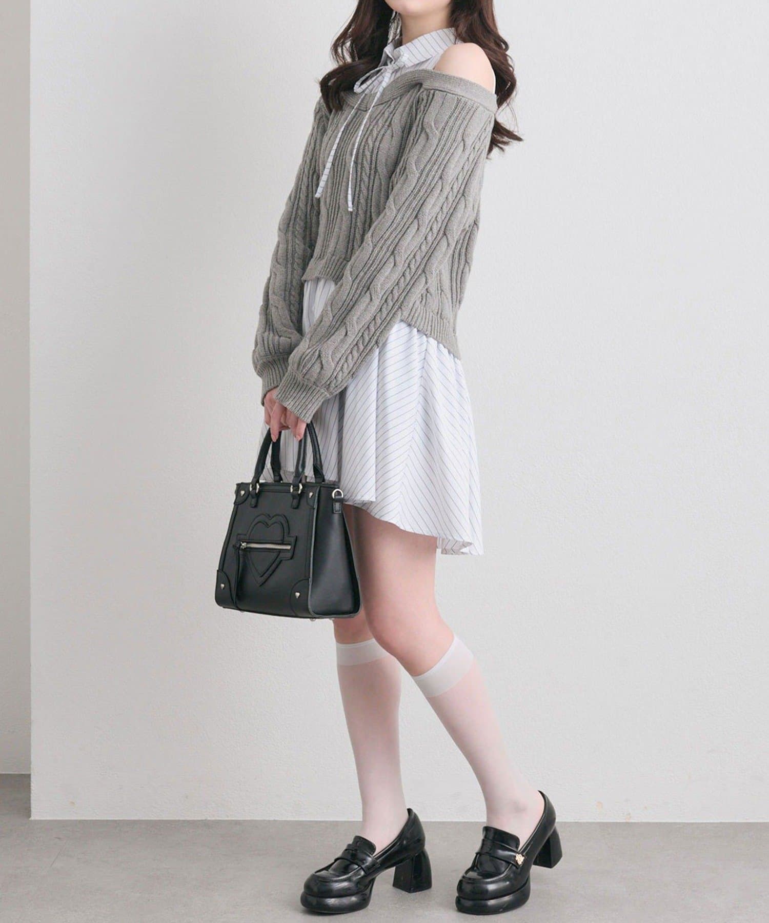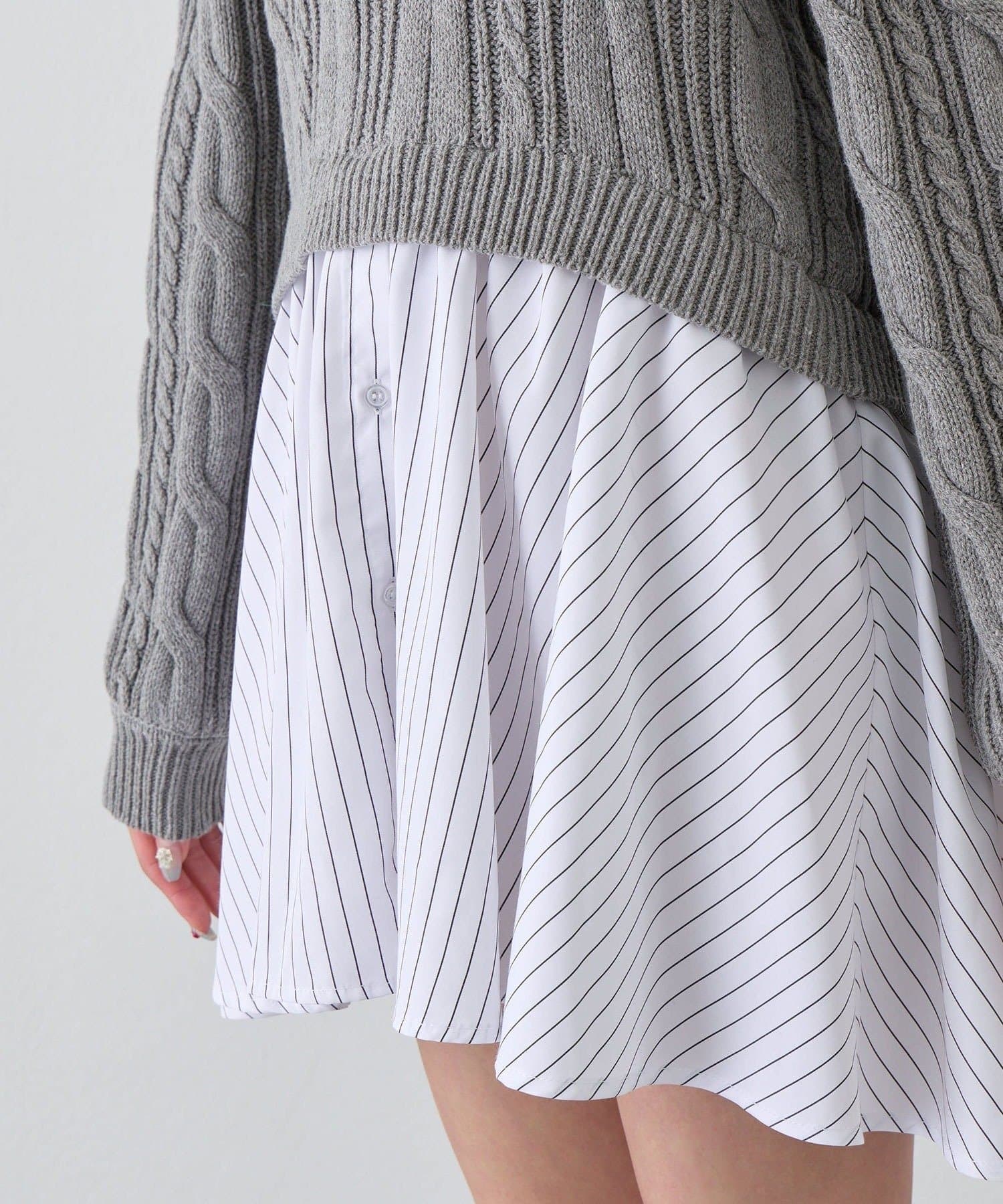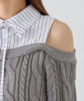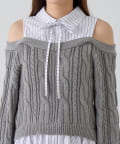 ・シャツワンピにオフショルニットを重ねたような、1枚で着映えするドッキングデザイン。