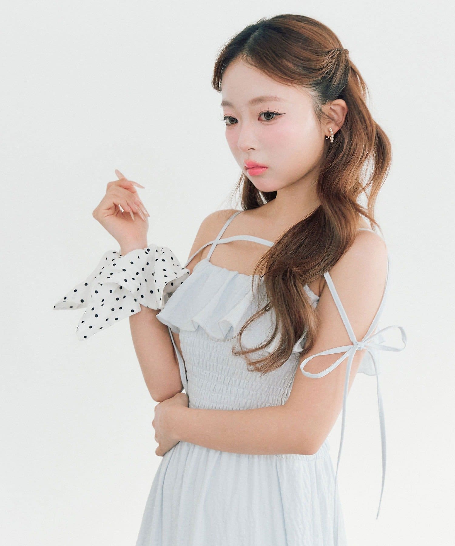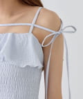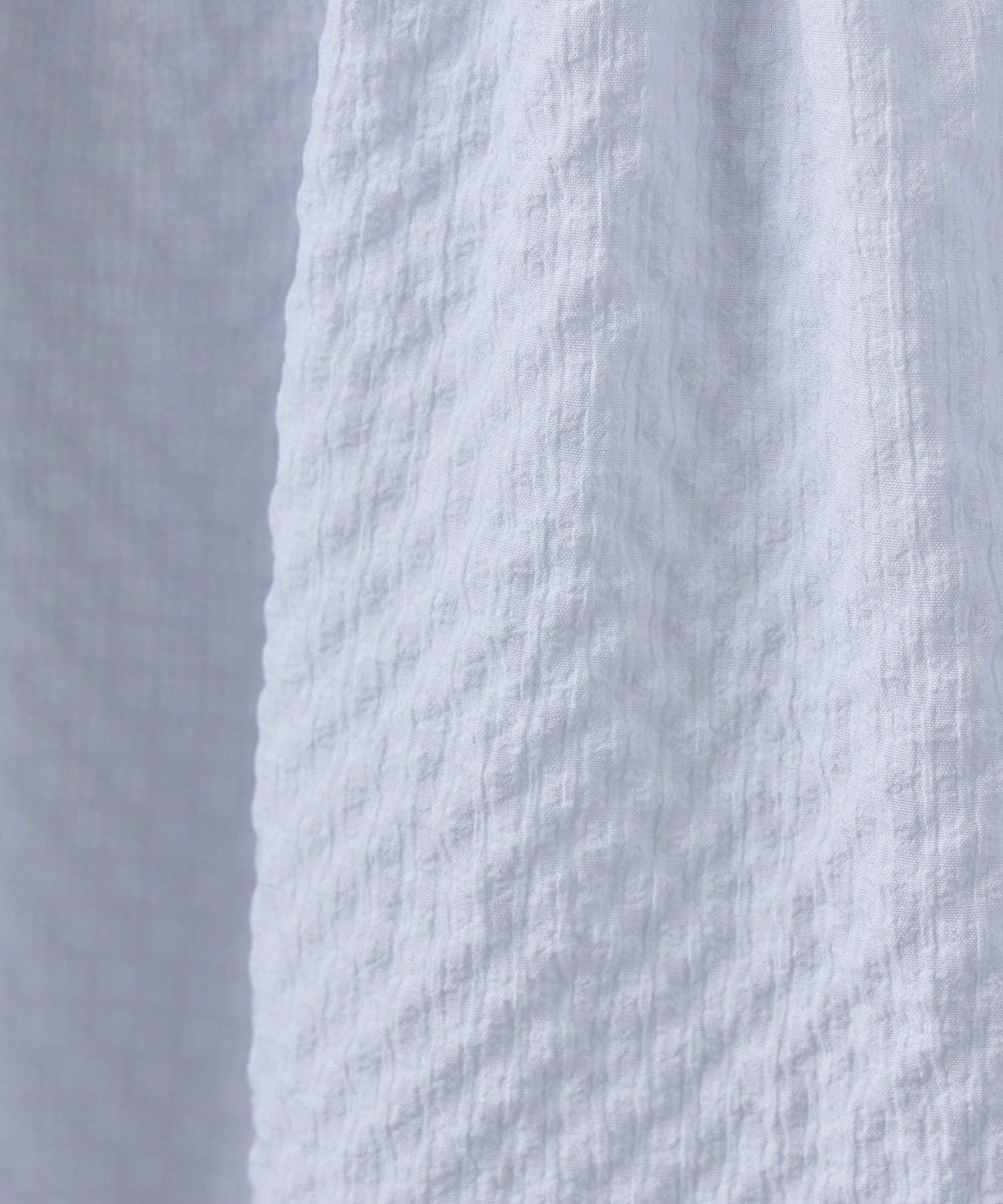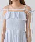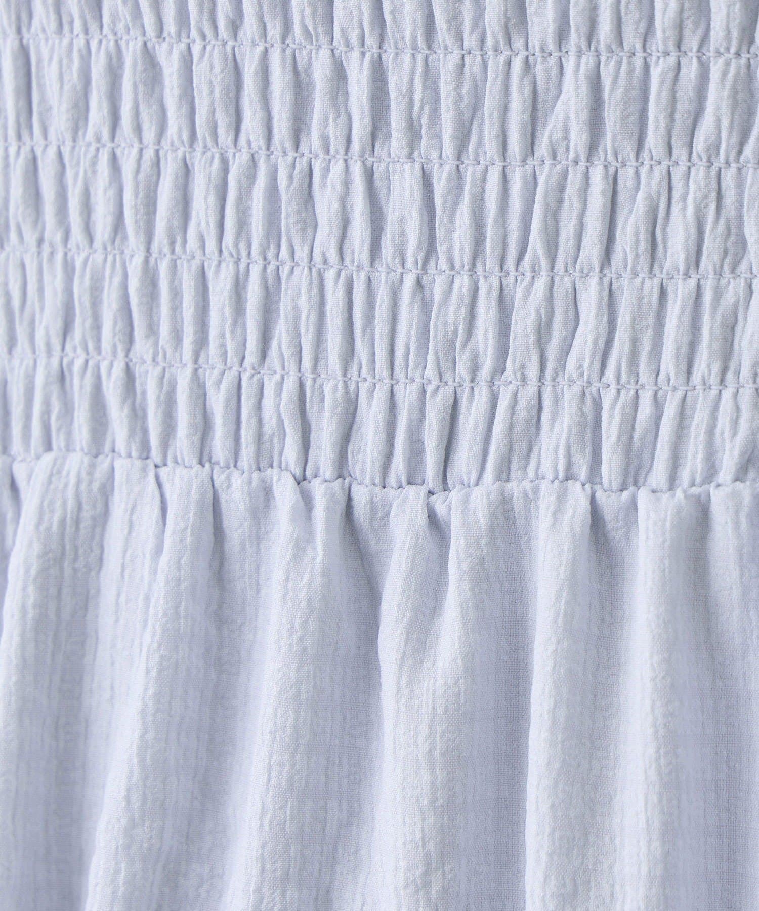 ・胸元は伸縮性のあるシャーリング仕様で程よくフィットし、上半身をすっきり華奢に見せてくれます。