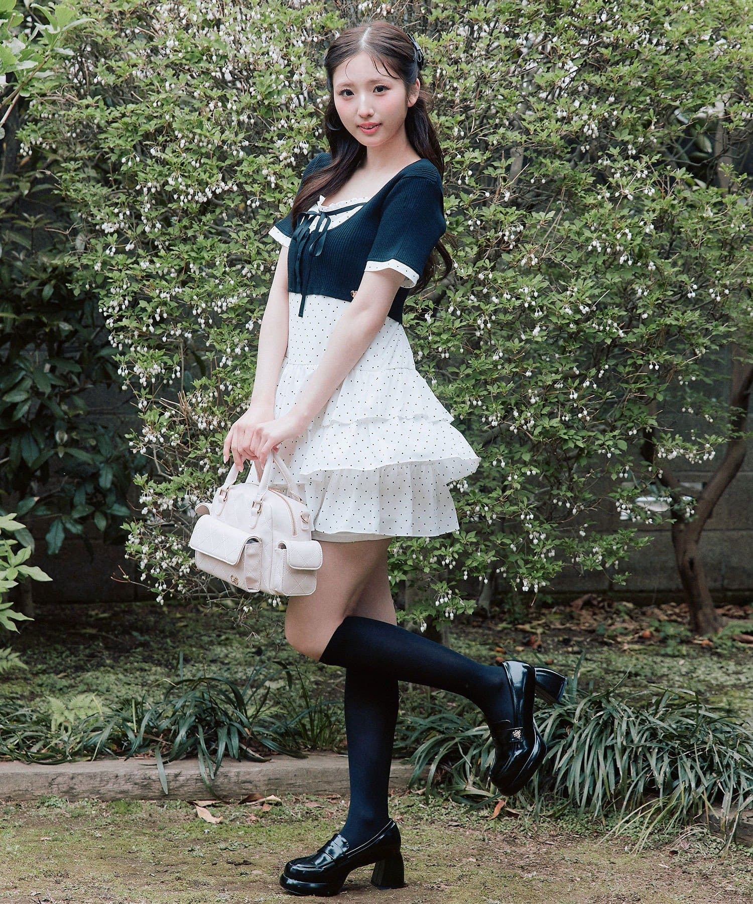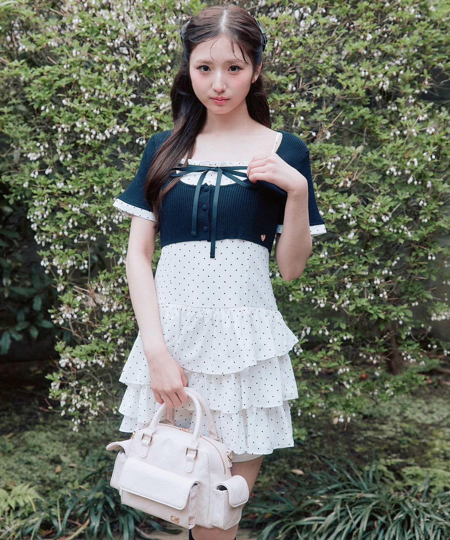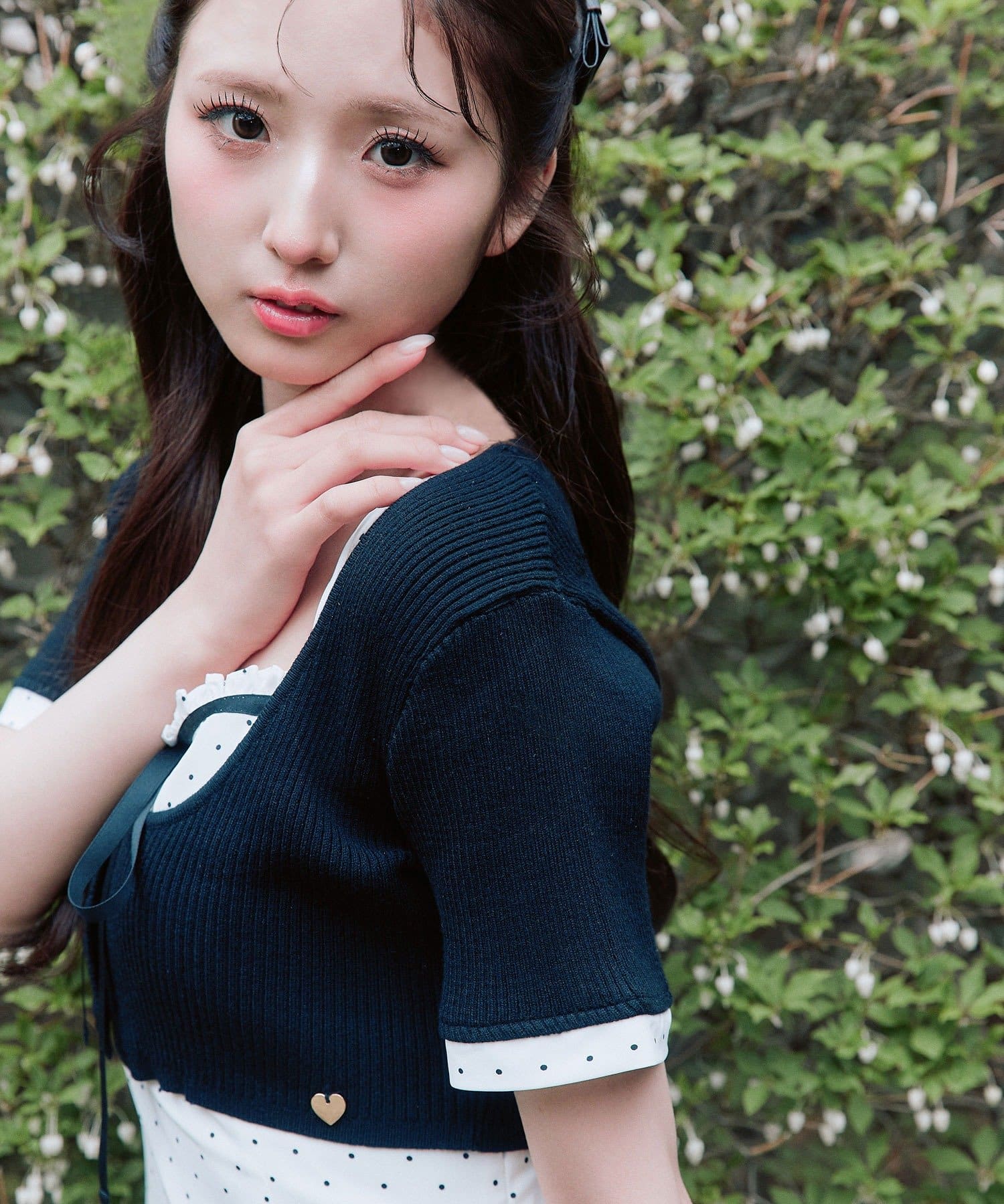 ・胸元のリボンとハートチャームが、さりげない甘さをプラスしてくれます。