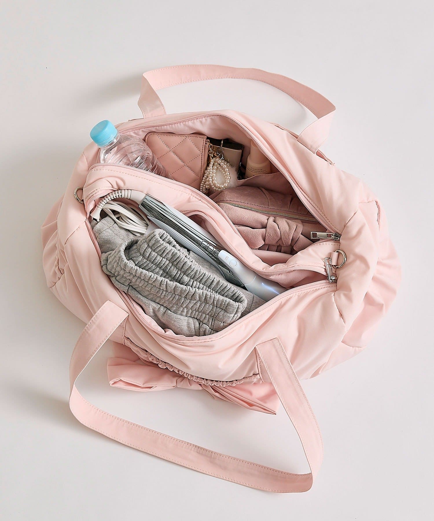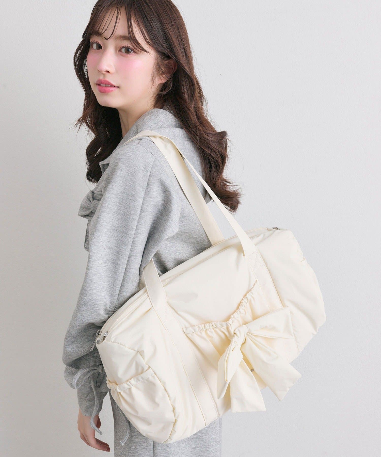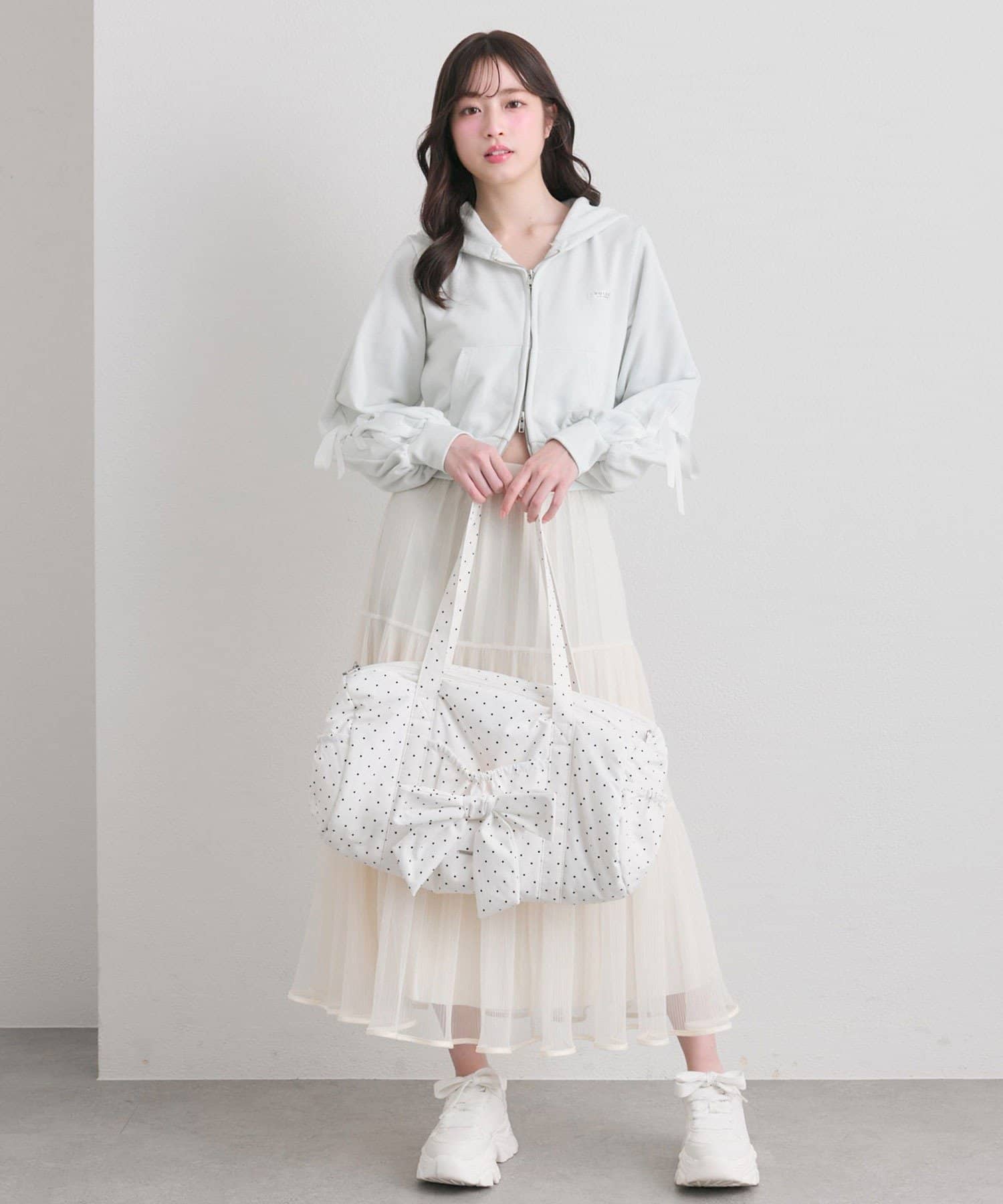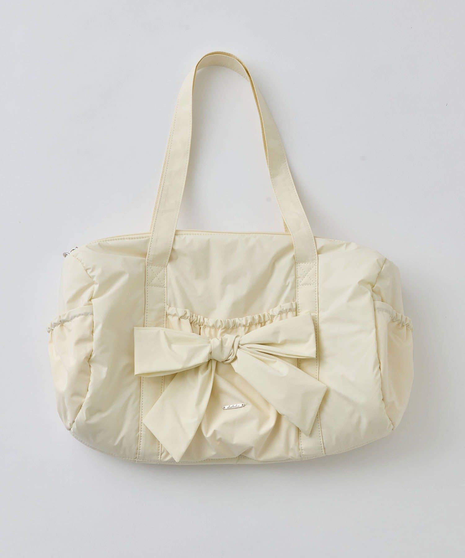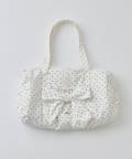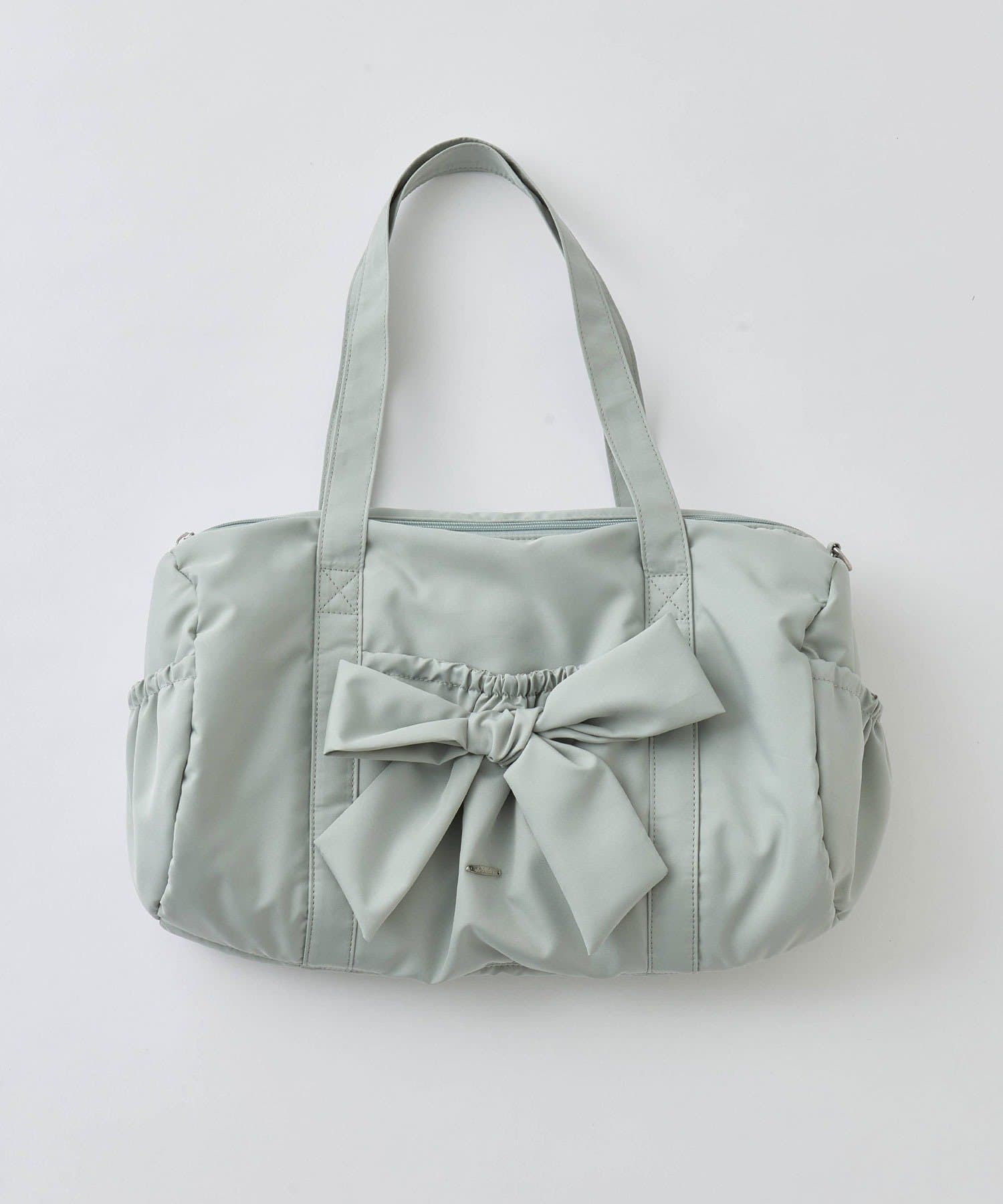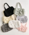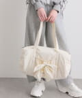 ・カジュアルなナイロン素材に、立体的なリボンと丸みのある形で甘さをプラスしたデザイン。