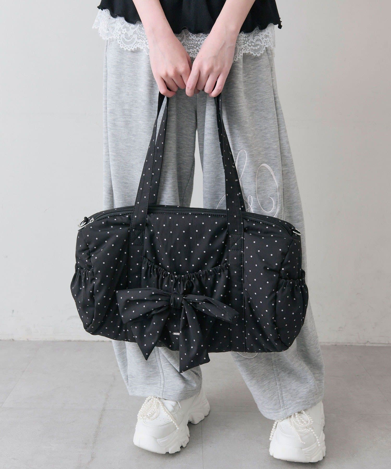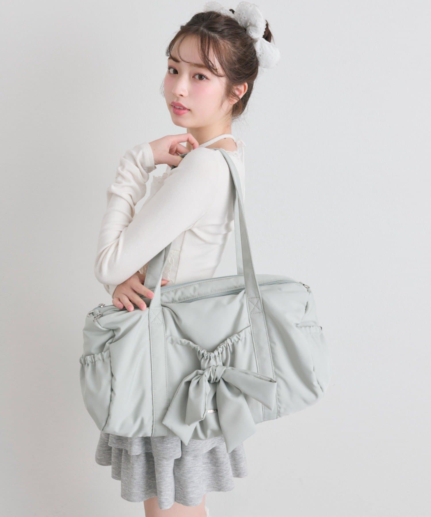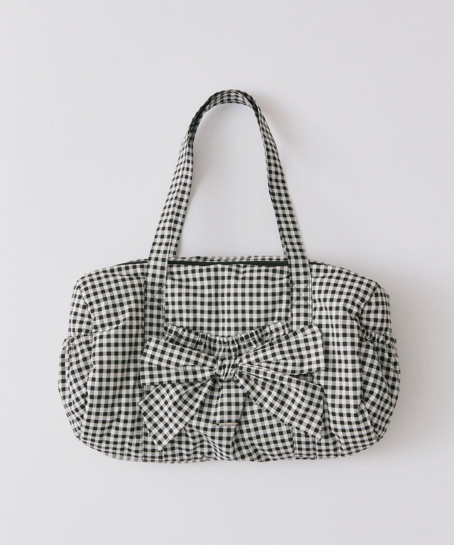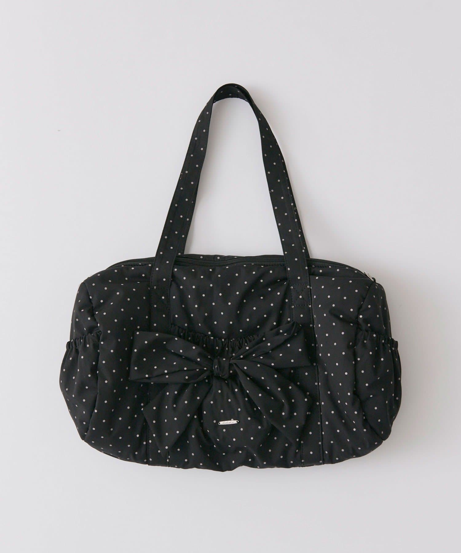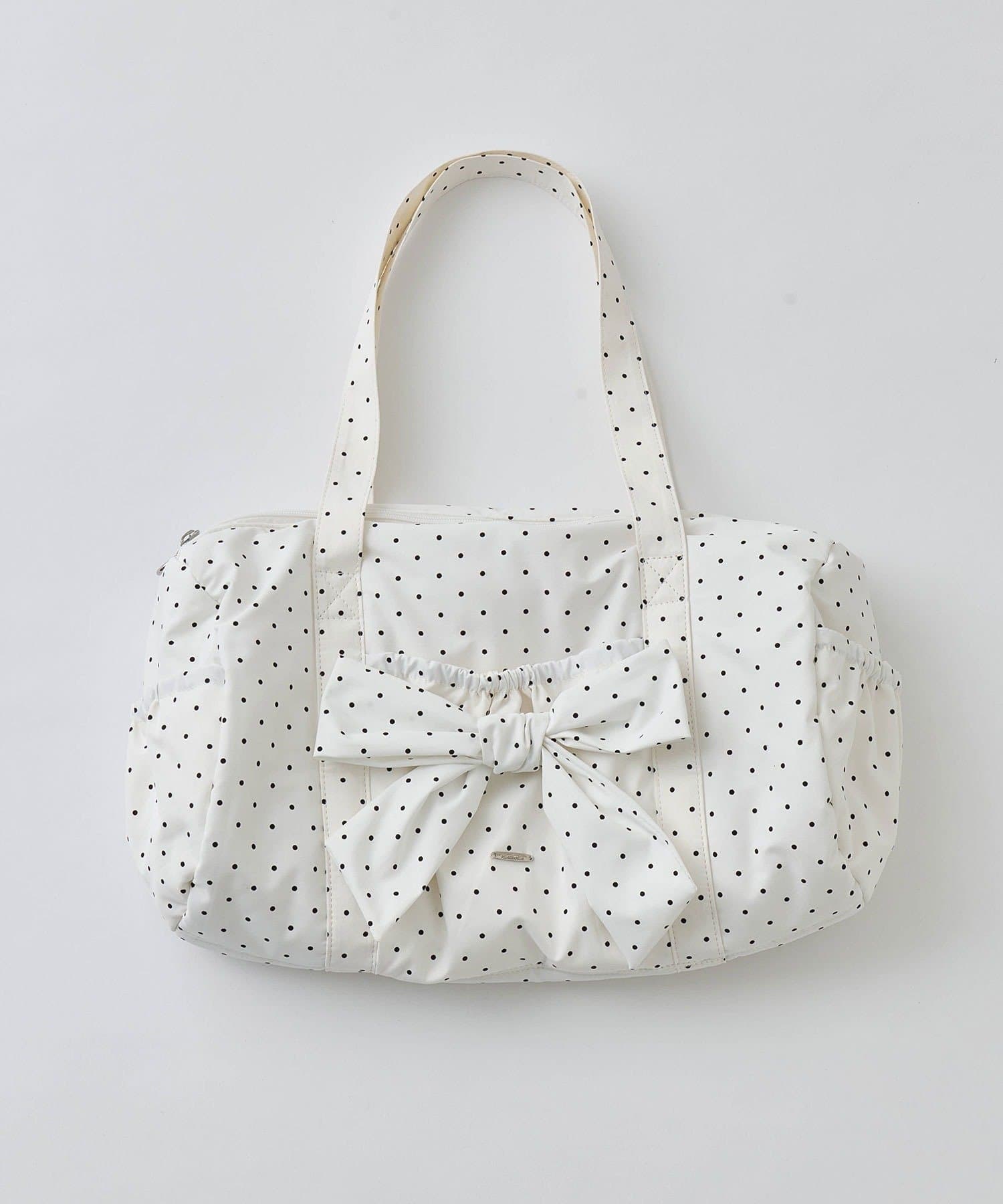 ・カジュアルなナイロン素材に、立体的なリボンと丸みのある形で甘さをプラスしたデザイン。