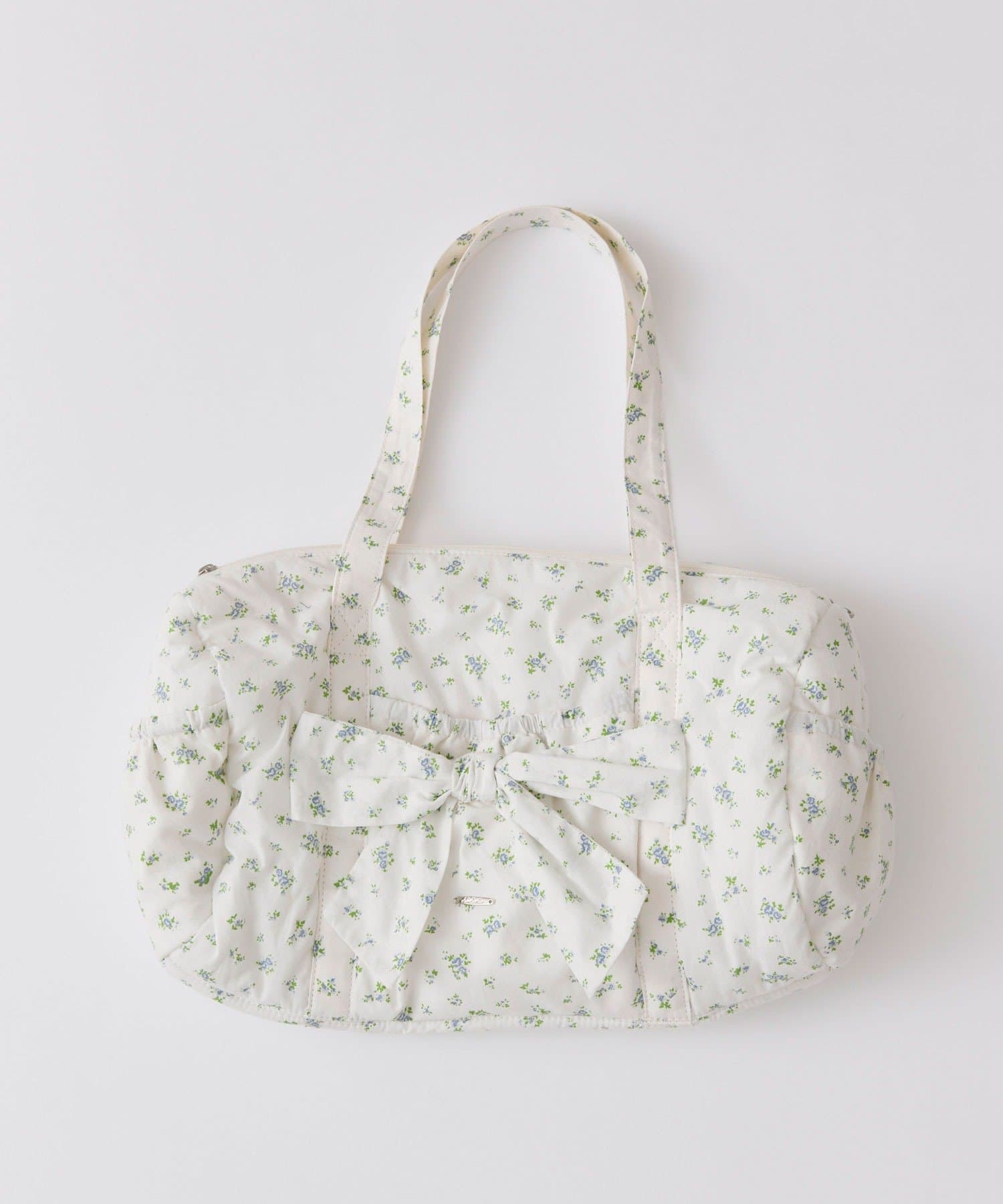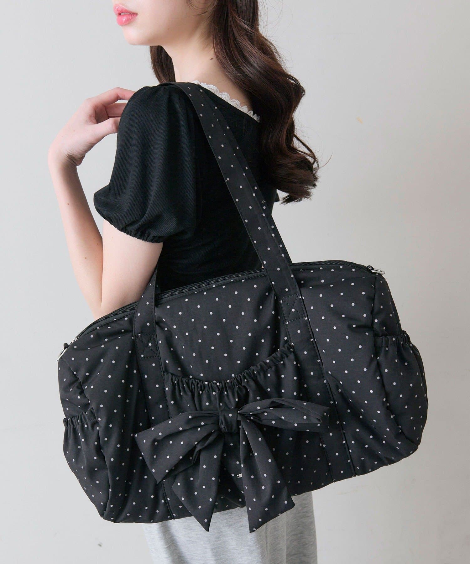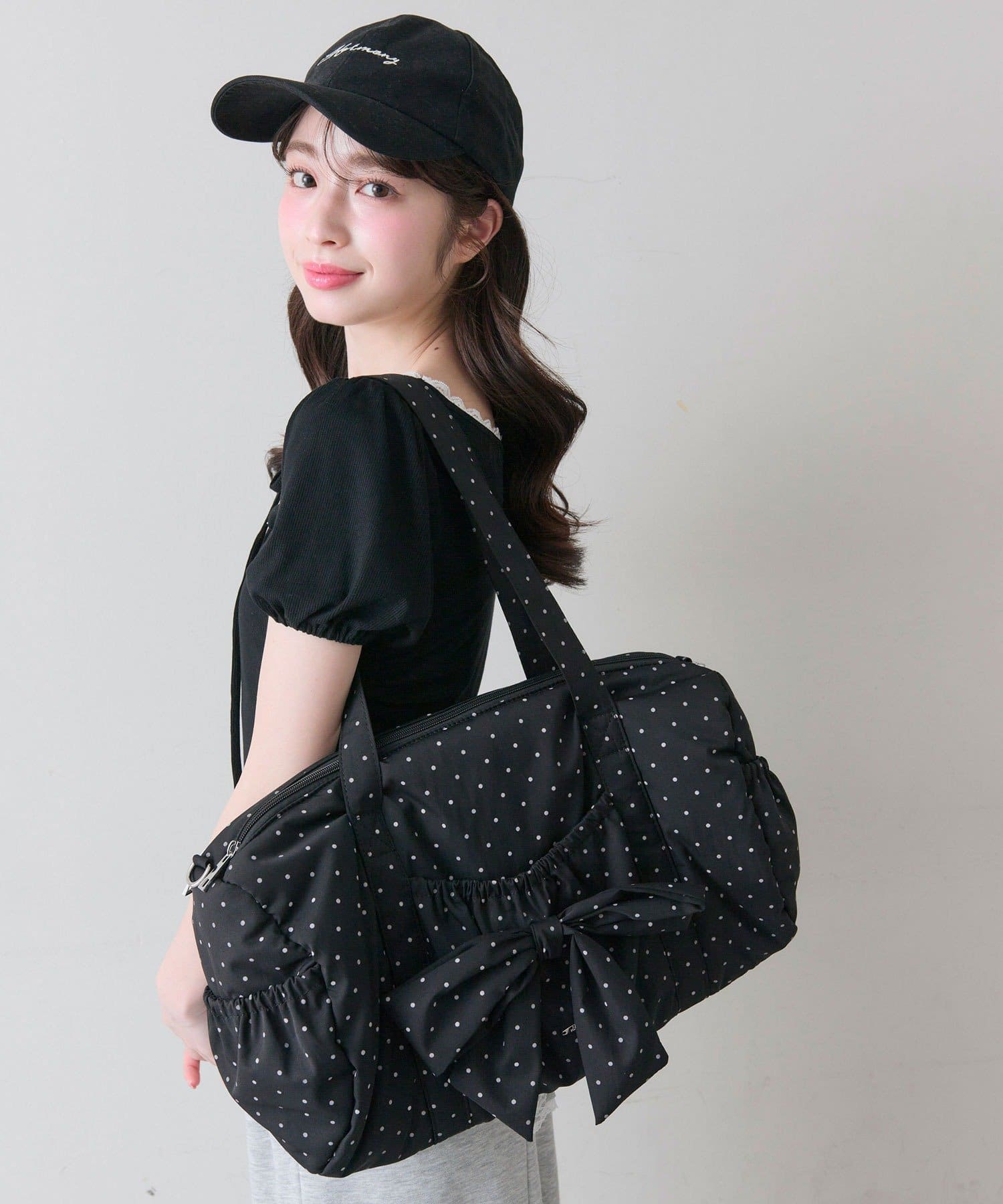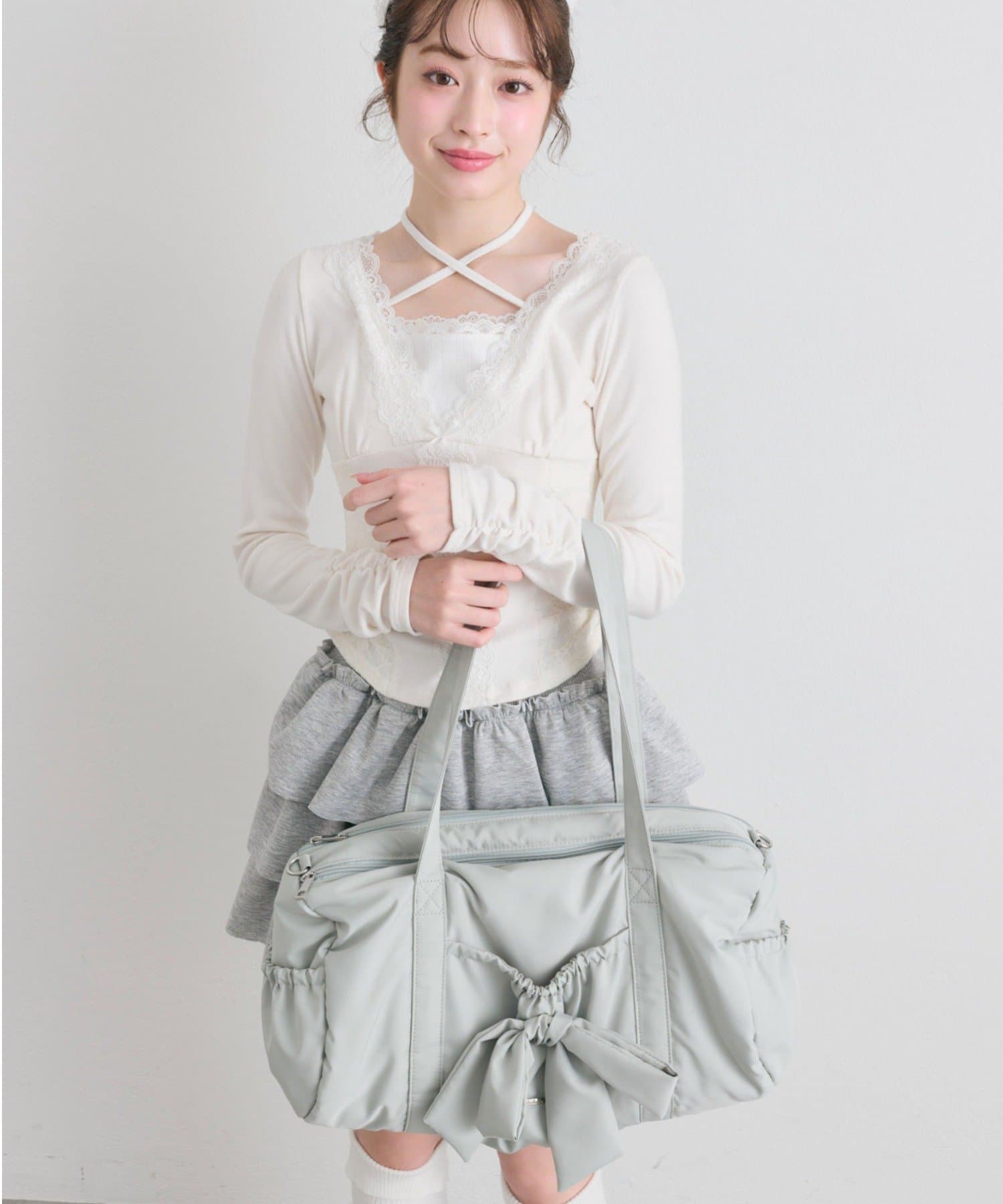 ・カジュアルなナイロン素材に、立体的なリボンと丸みのある形で甘さをプラスしたデザイン。