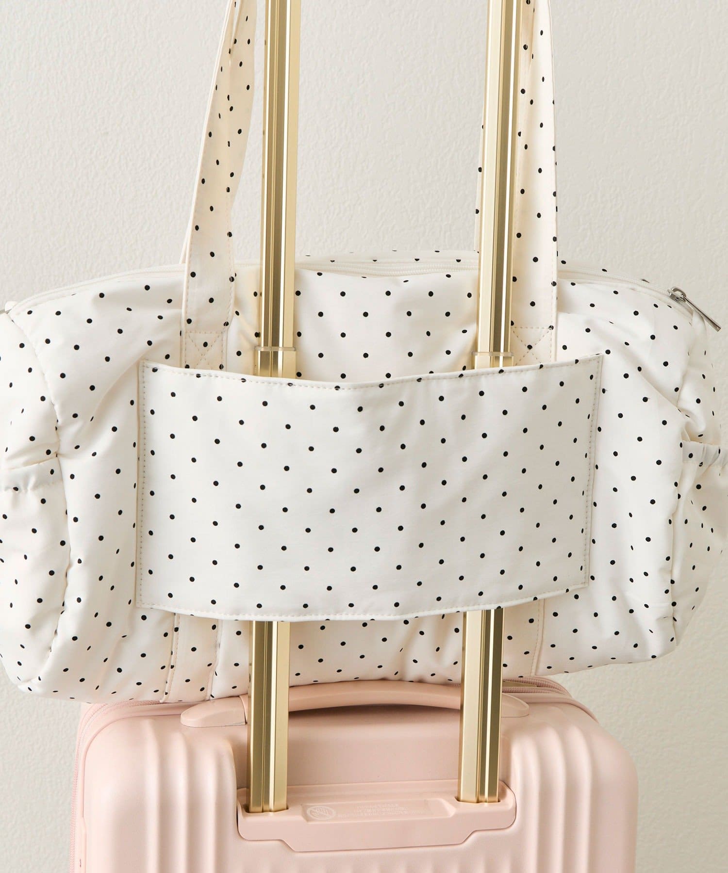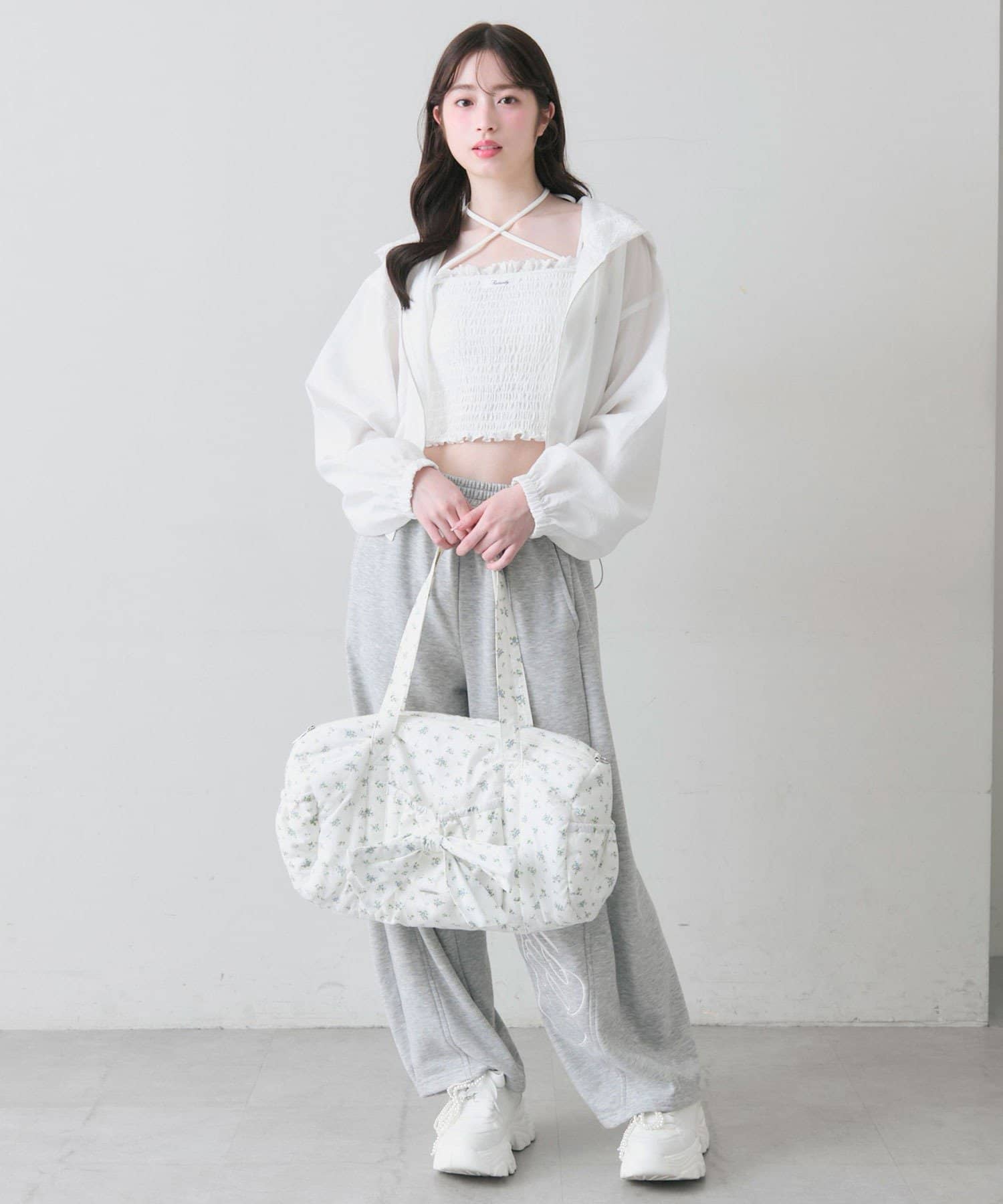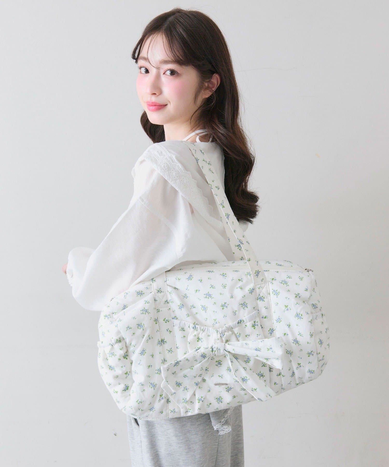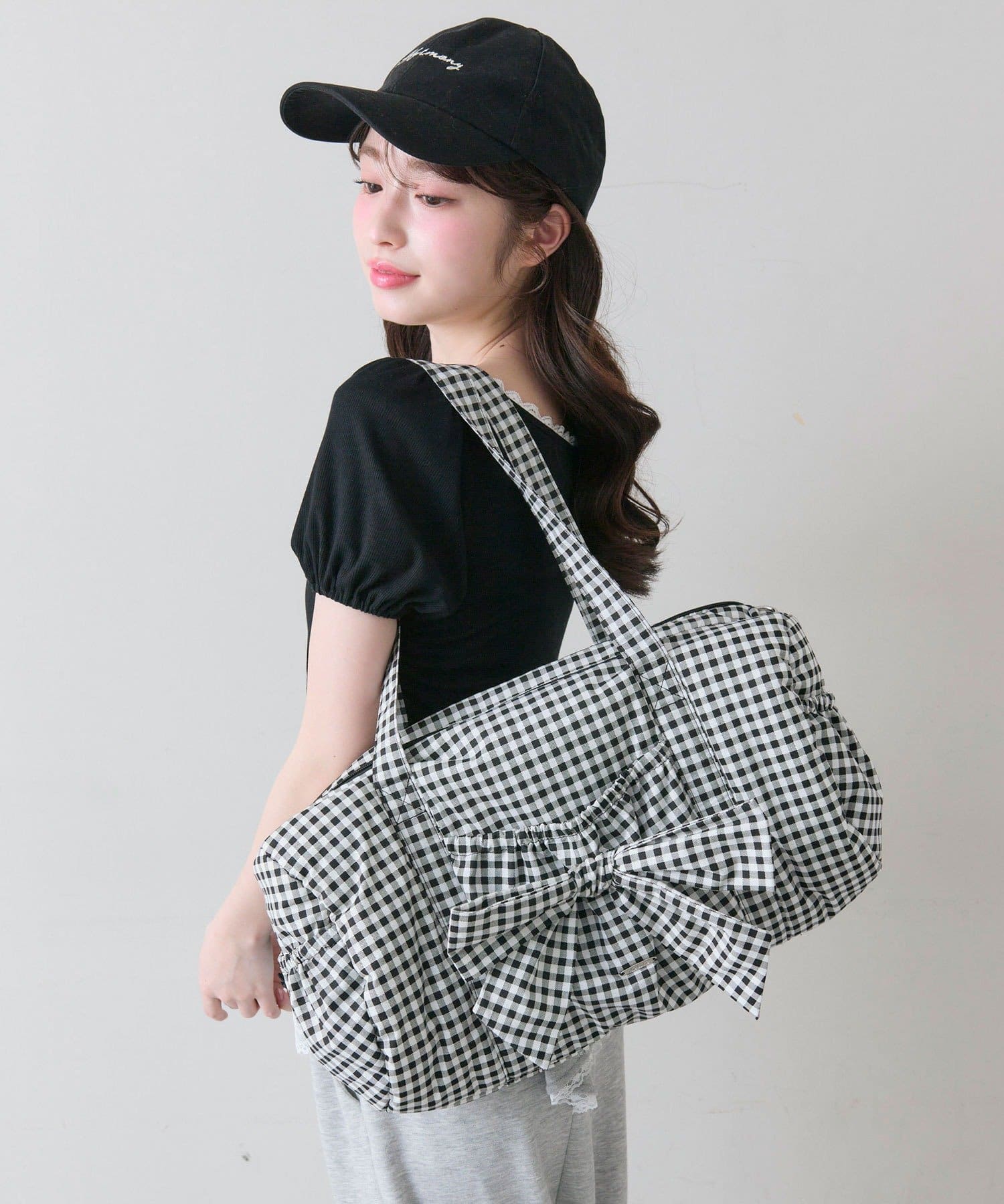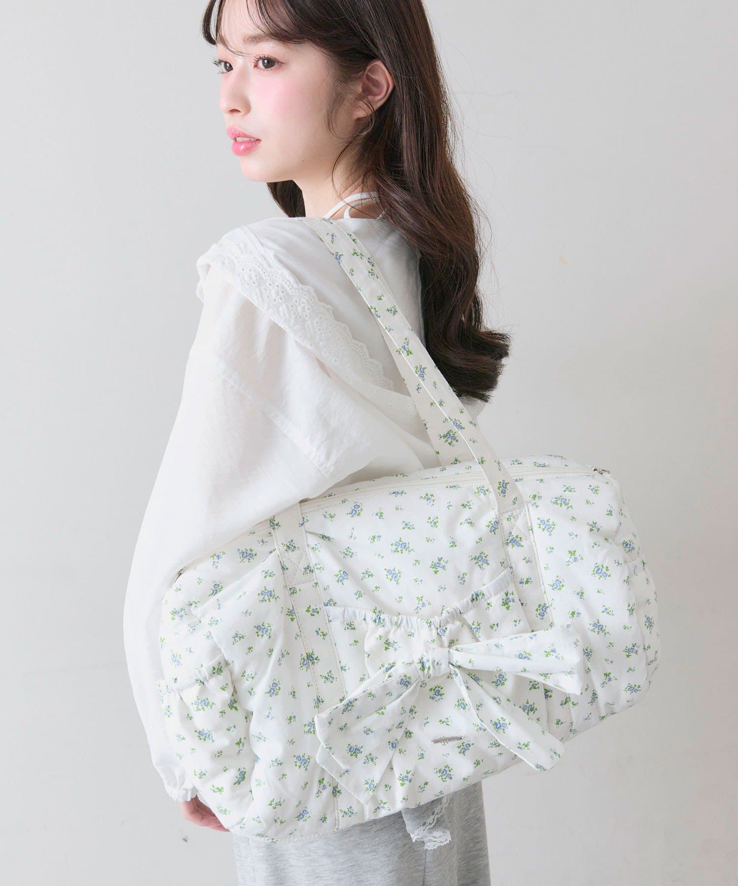 ・カジュアルなナイロン素材に、立体的なリボンと丸みのある形で甘さをプラスしたデザイン。