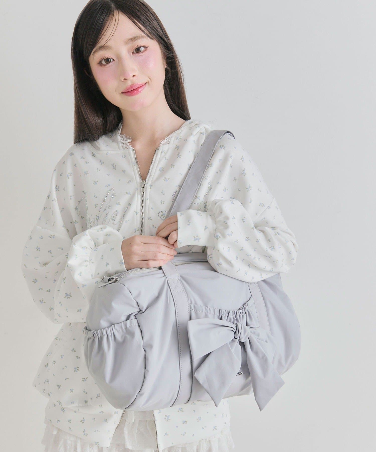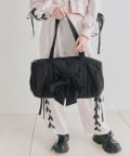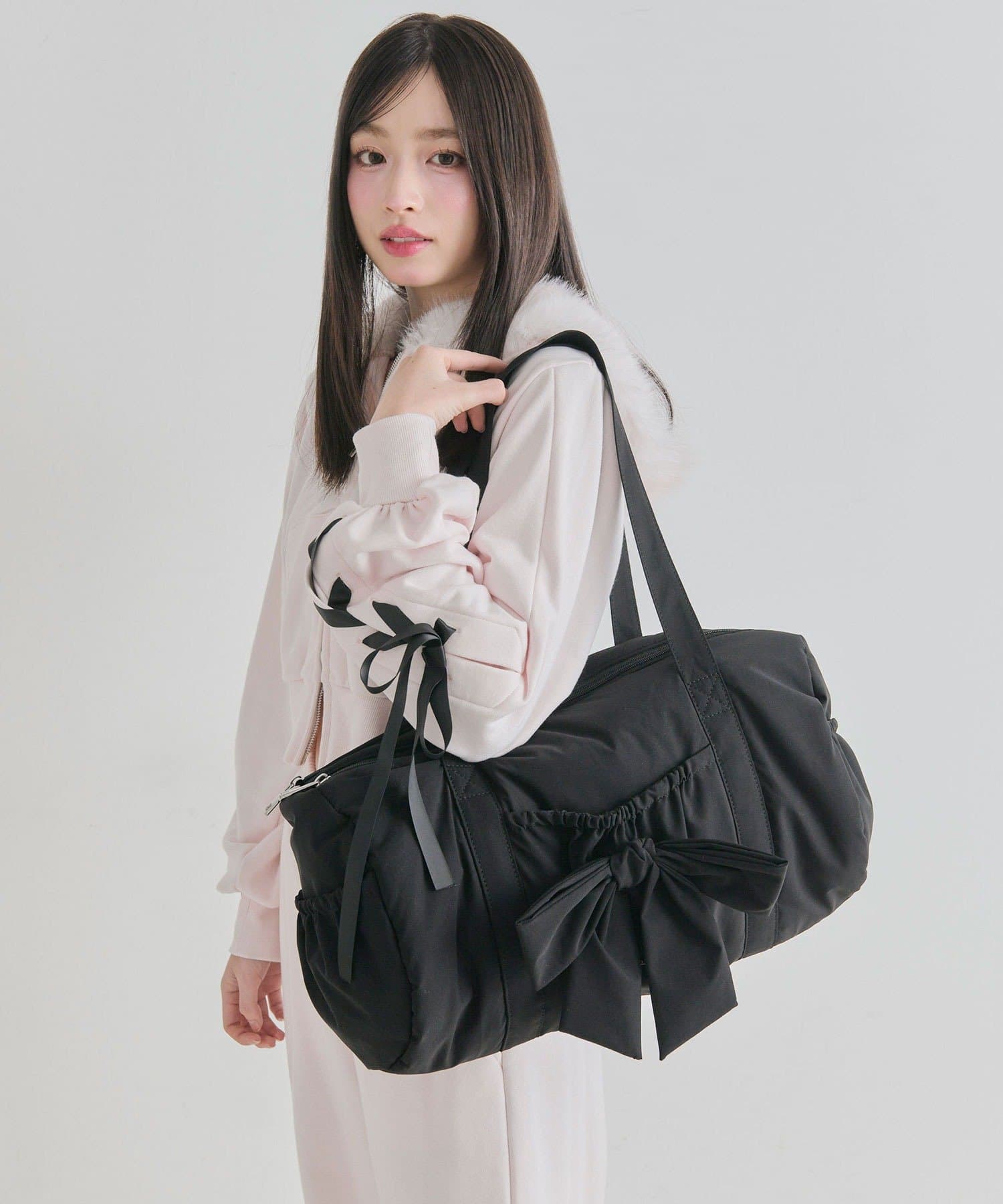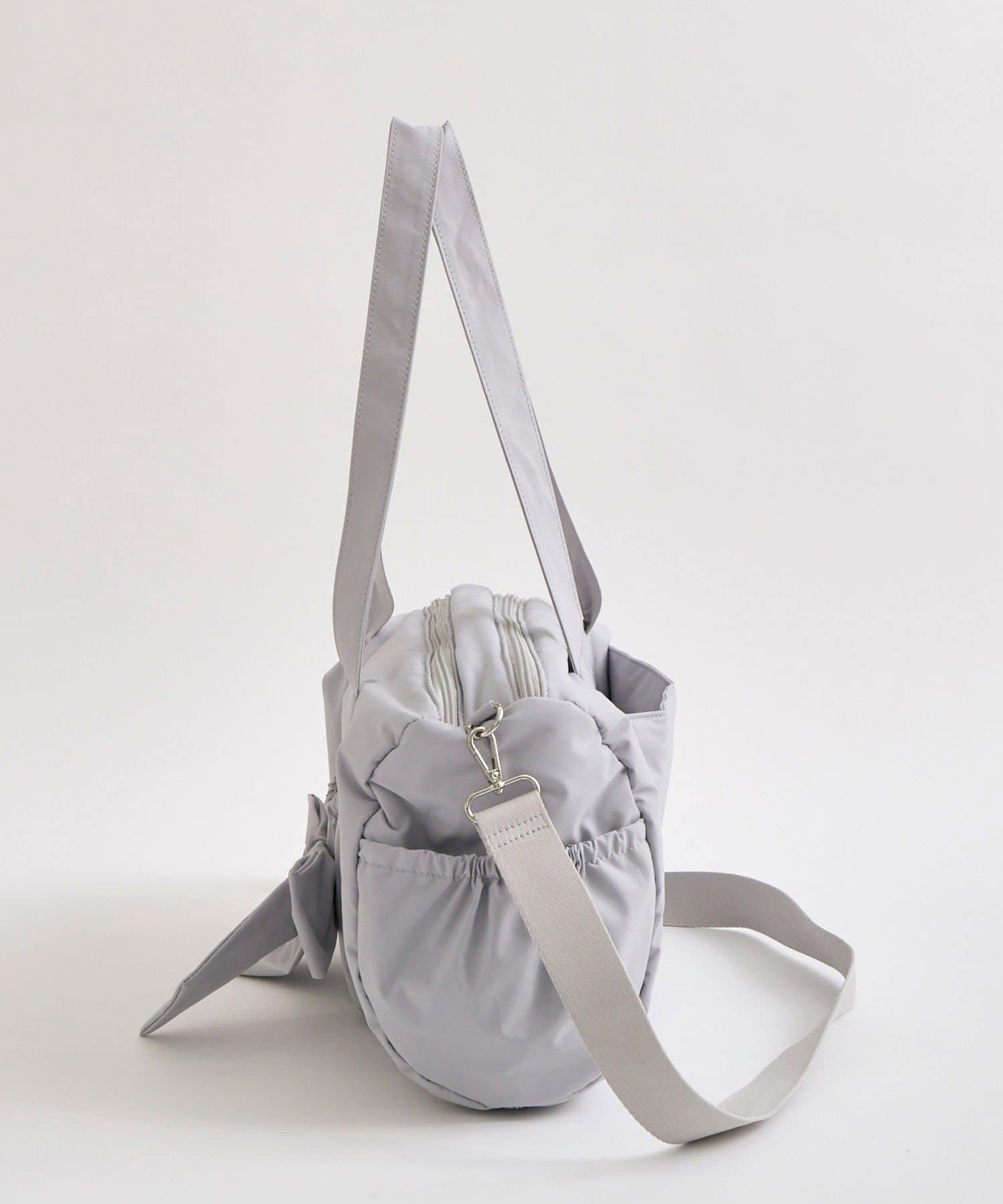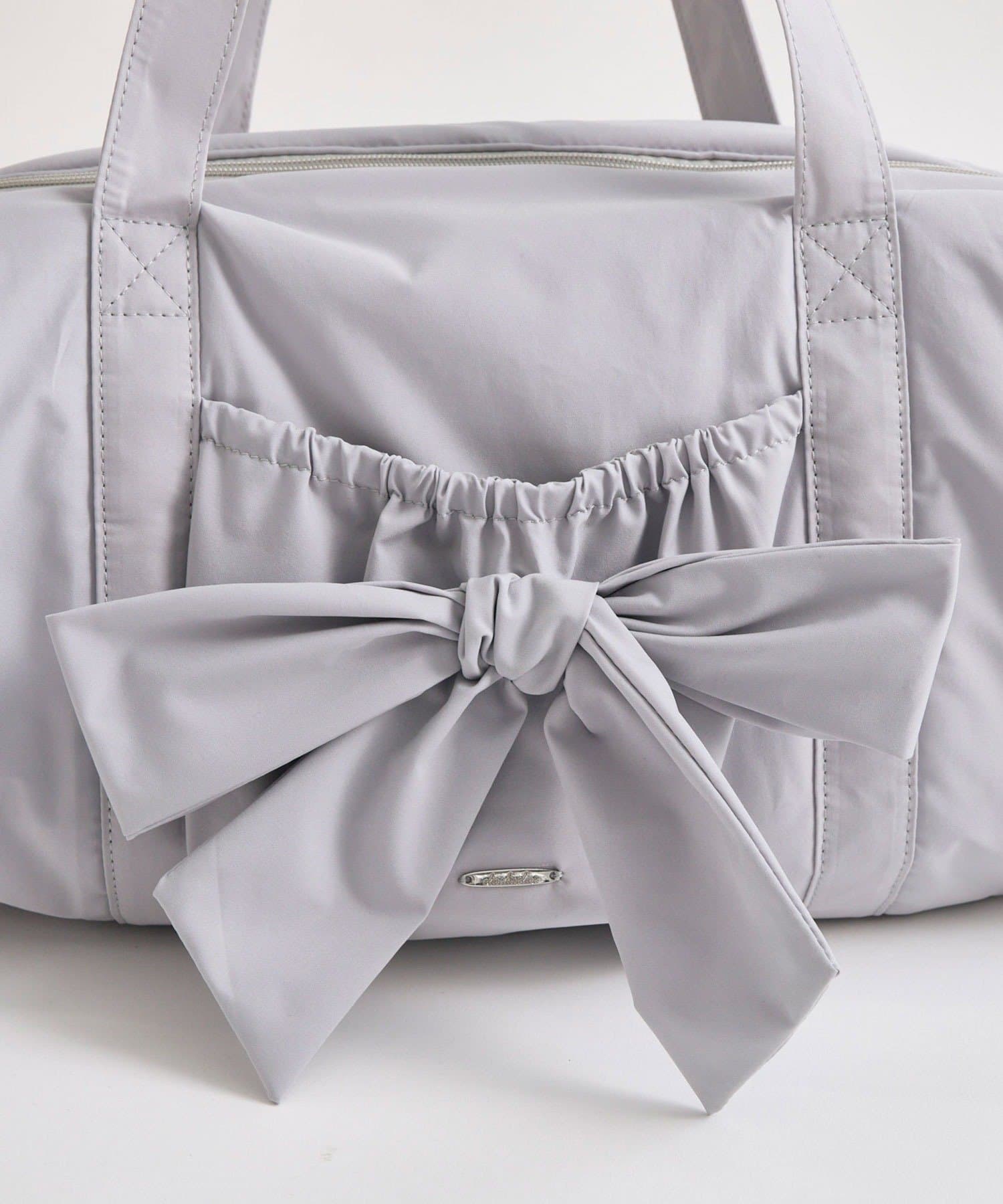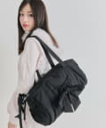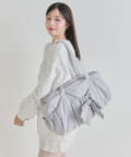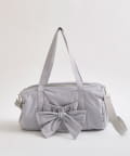 ・カジュアルなナイロン素材に、立体的なリボンと丸みのある形で甘さをプラスしたデザイン。