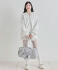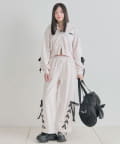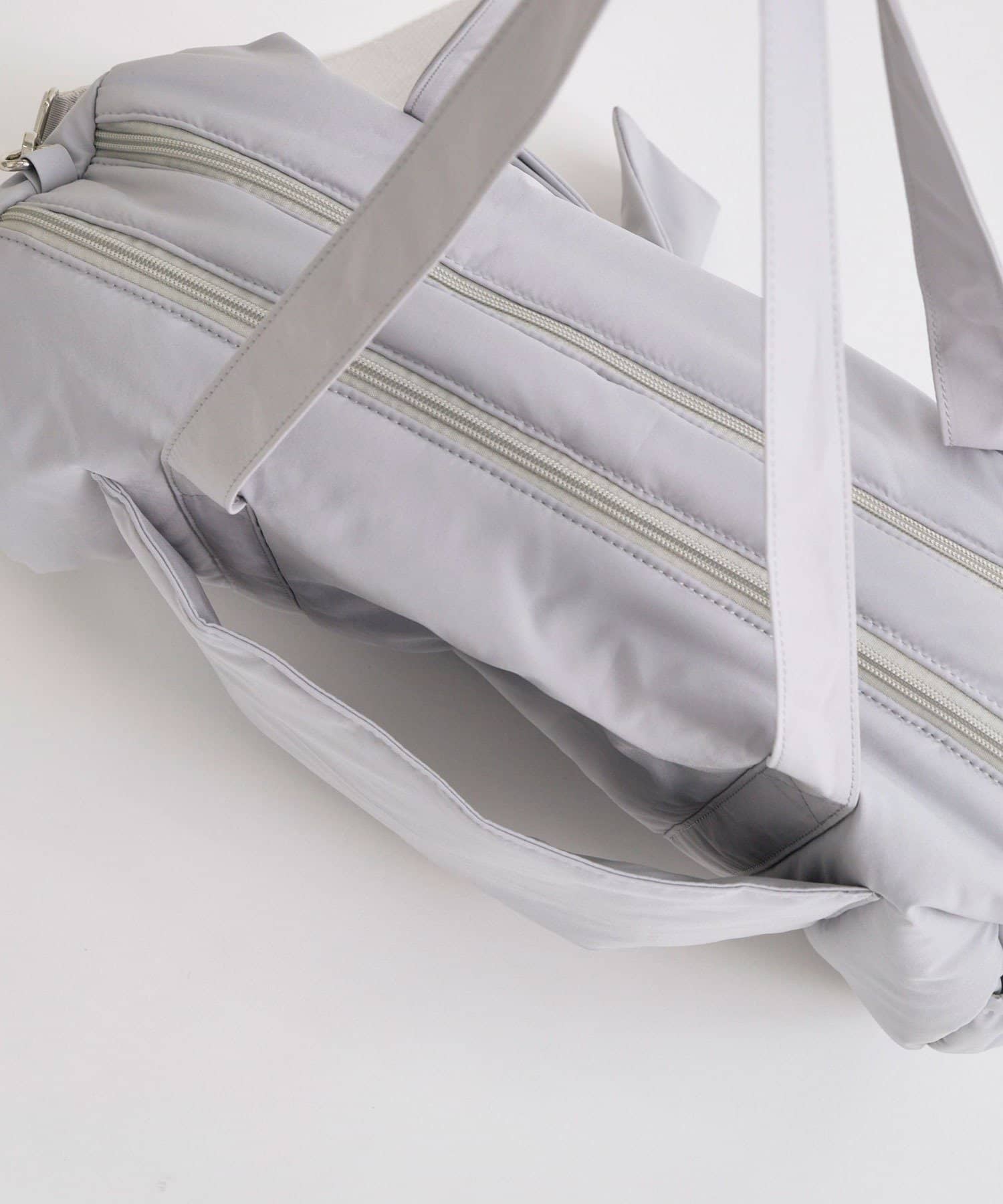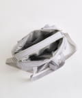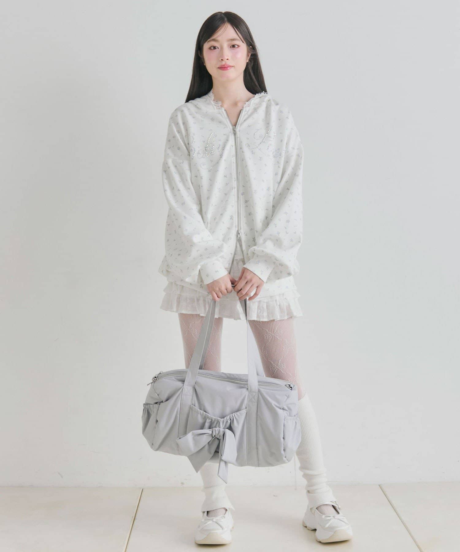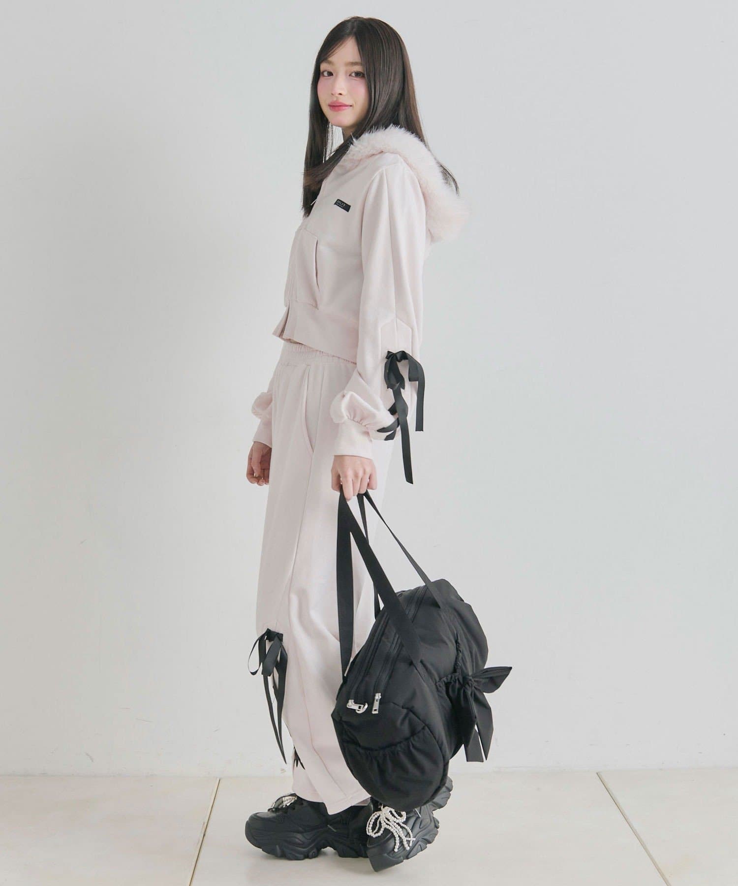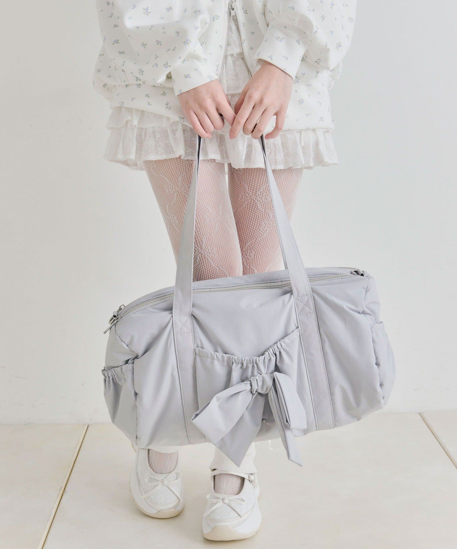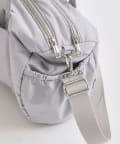 ・カジュアルなナイロン素材に、立体的なリボンと丸みのある形で甘さをプラスしたデザイン。