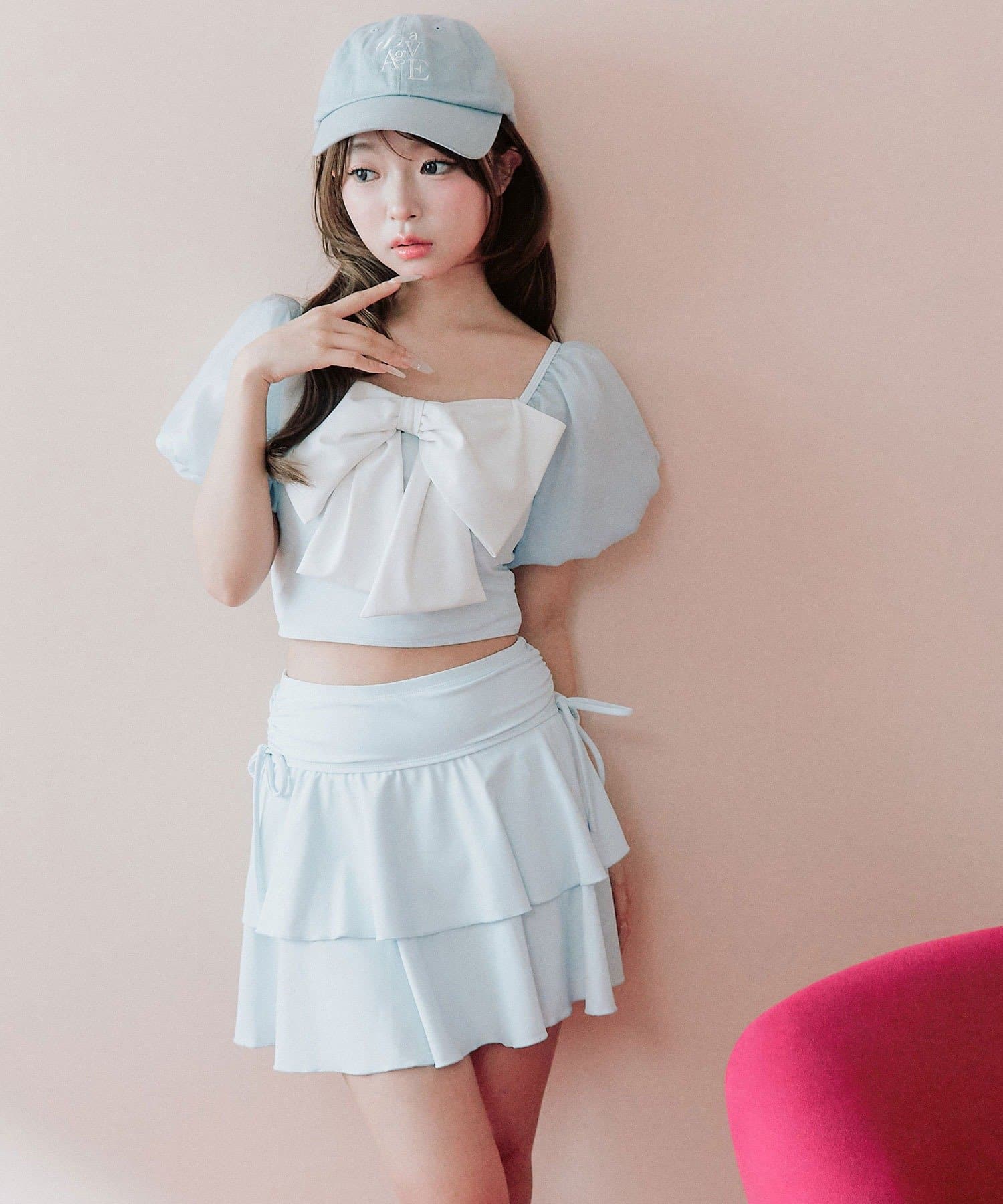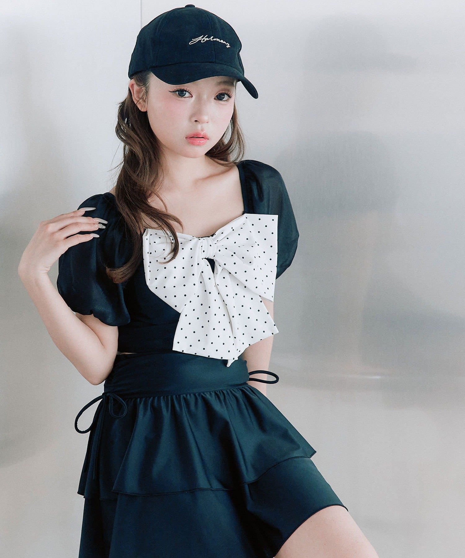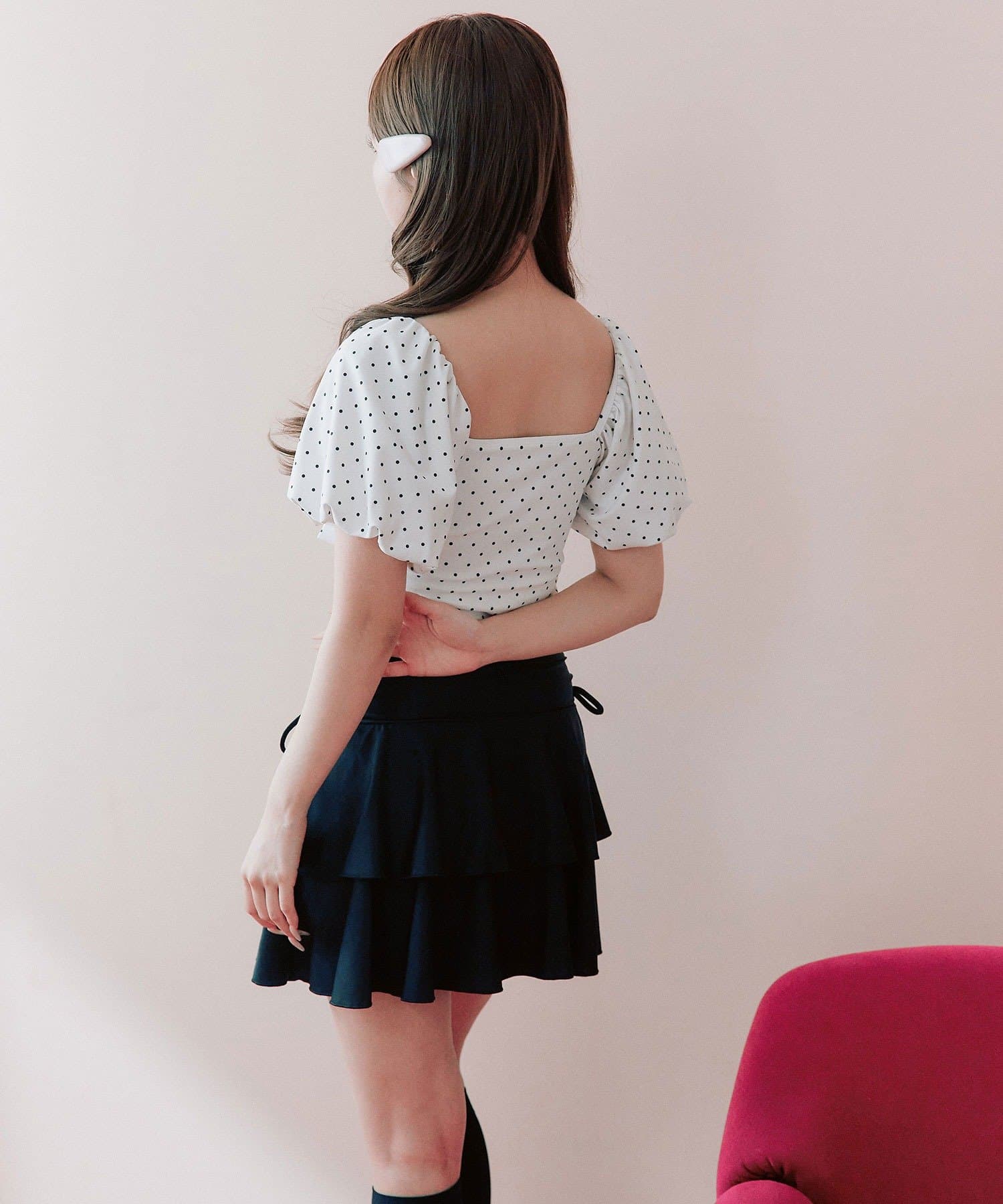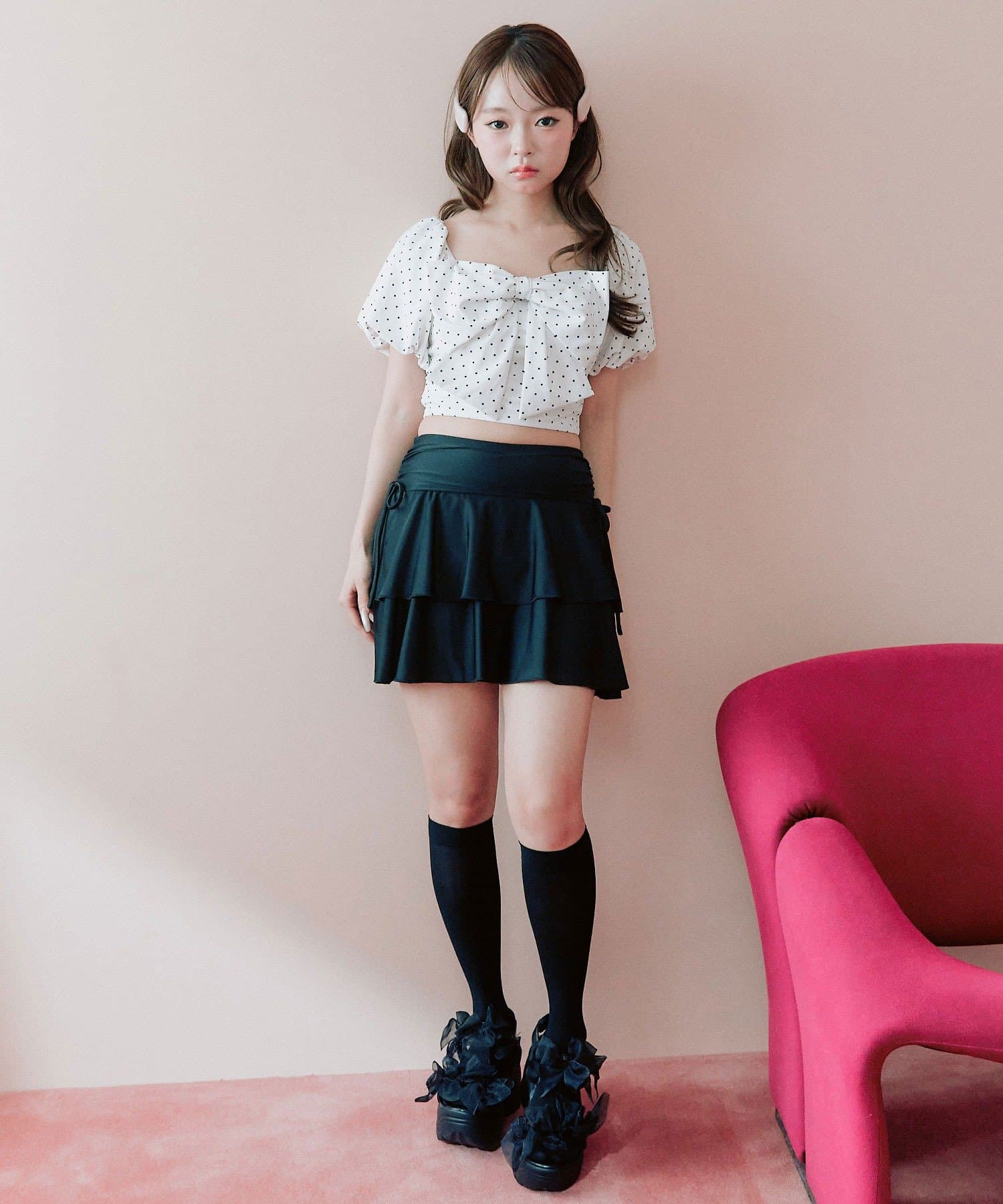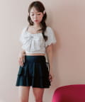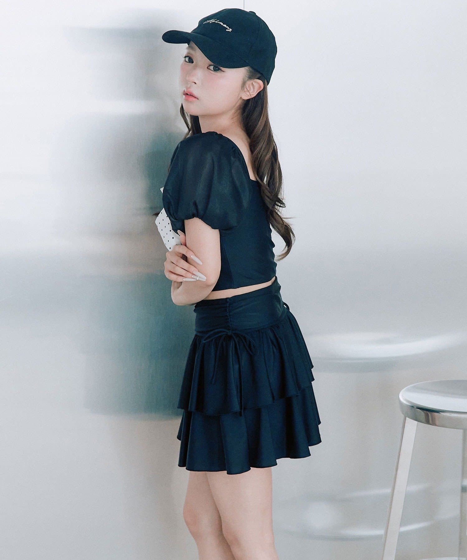 ・サイドにリボン付きのティアードスカートで、トレンド感と体型カバーを両立。