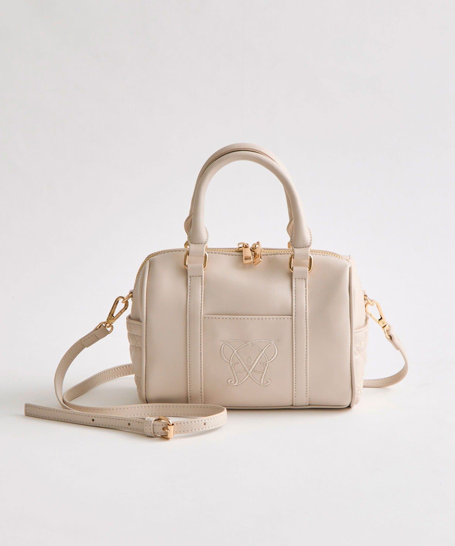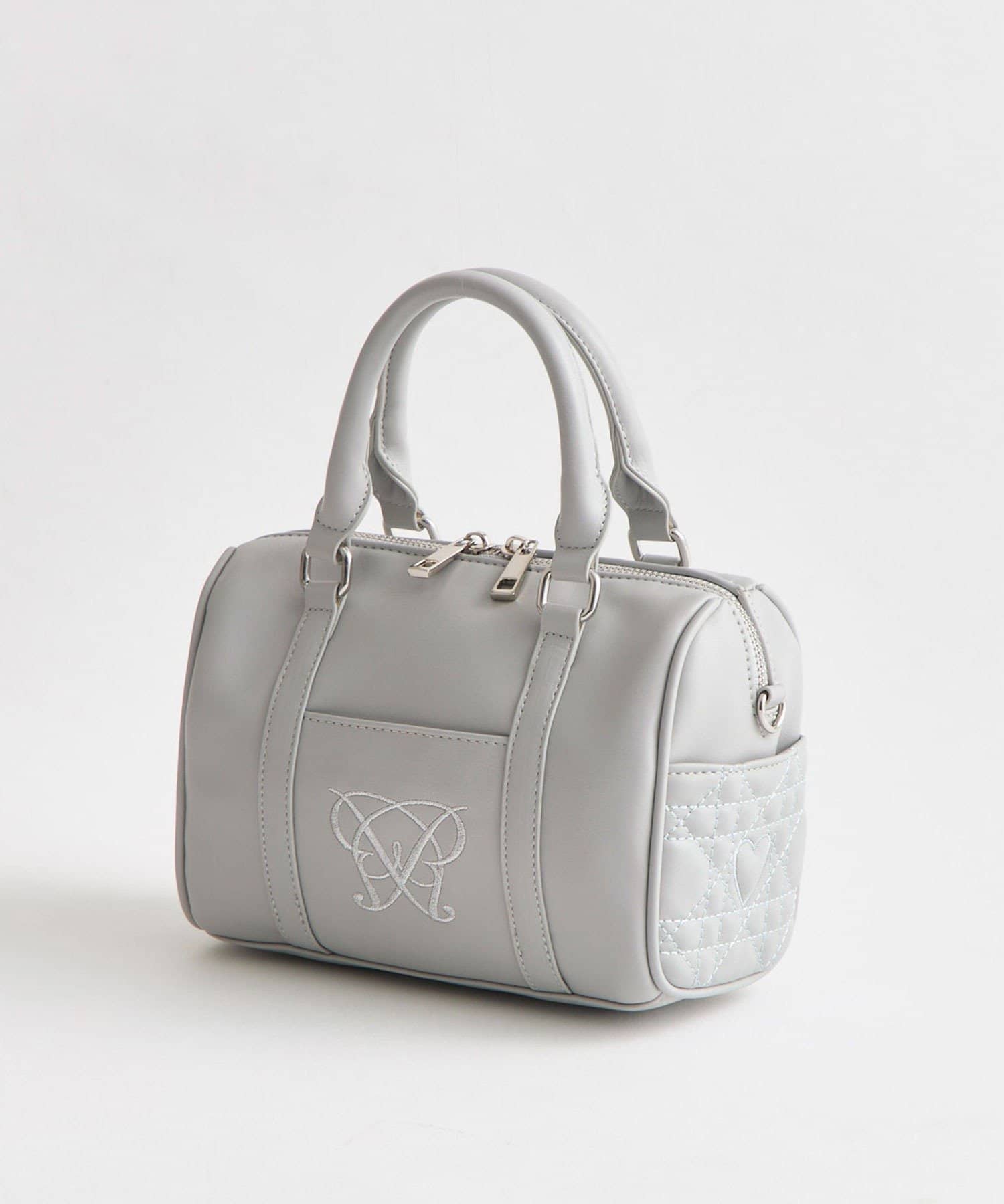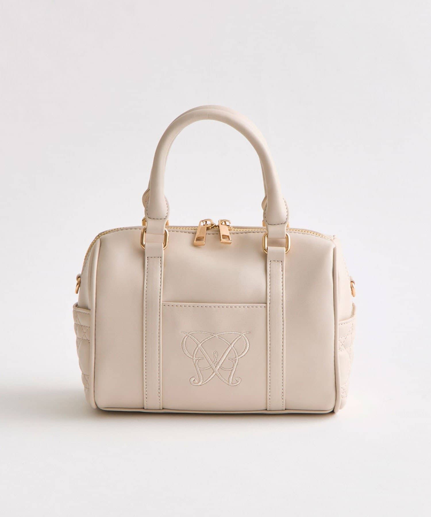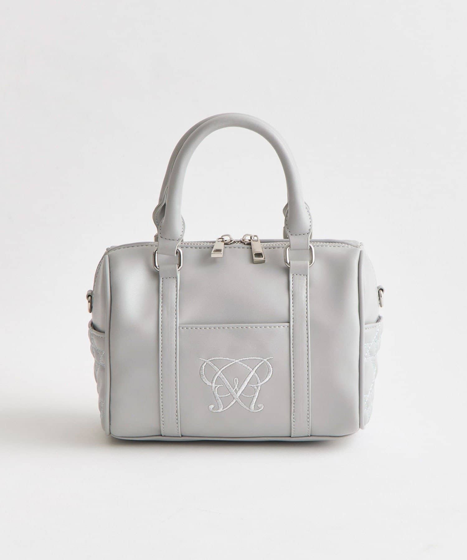 ・高見えする合皮素材にオリジナルのロゴ刺繍とキルティングポケットを施したミニボストンバッグ。