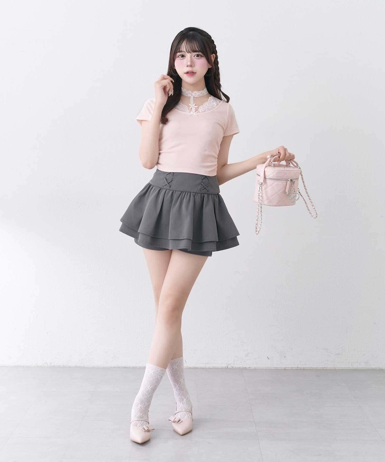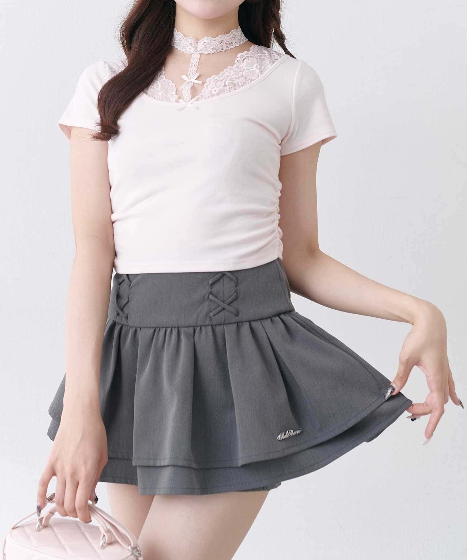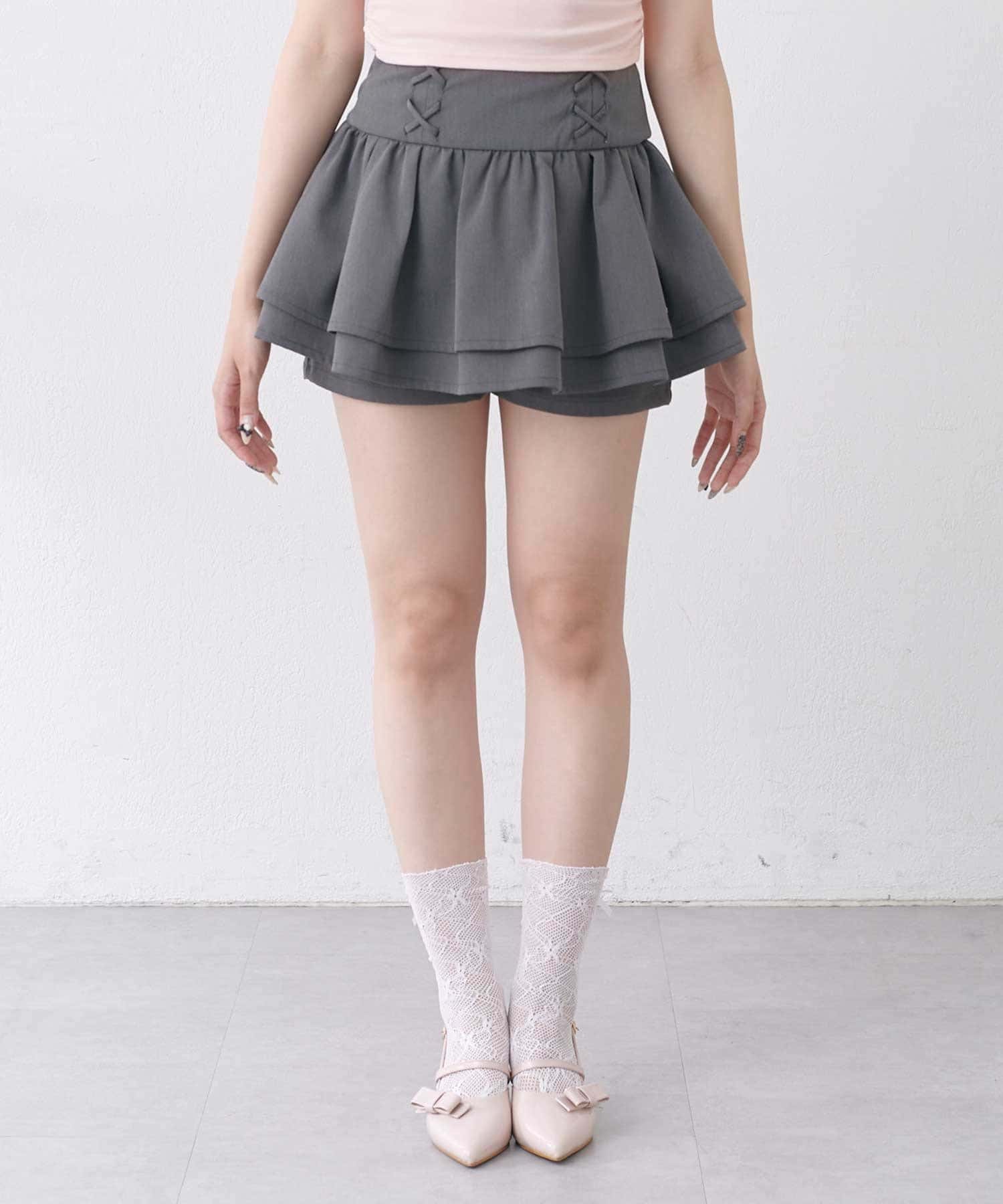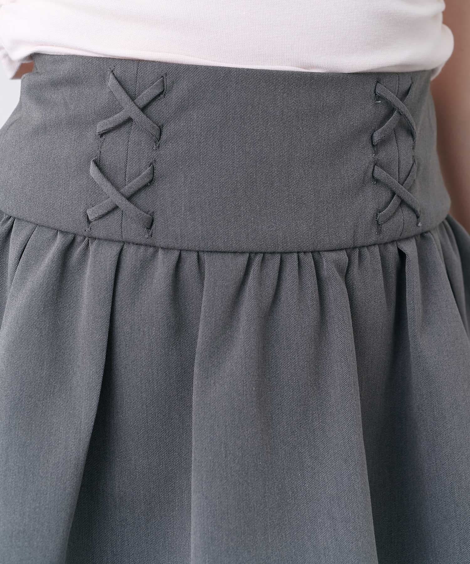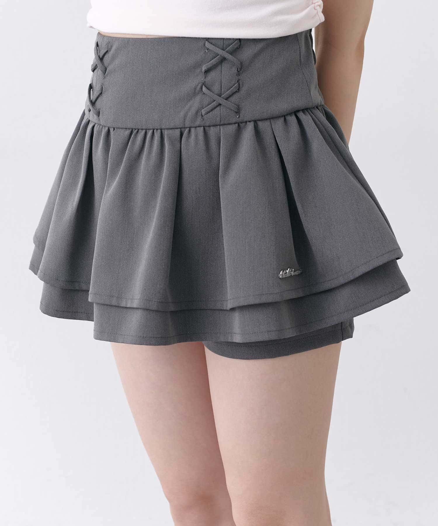 レースアップとティアードデザインが目を惹く、華やかなフレアスカート。