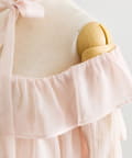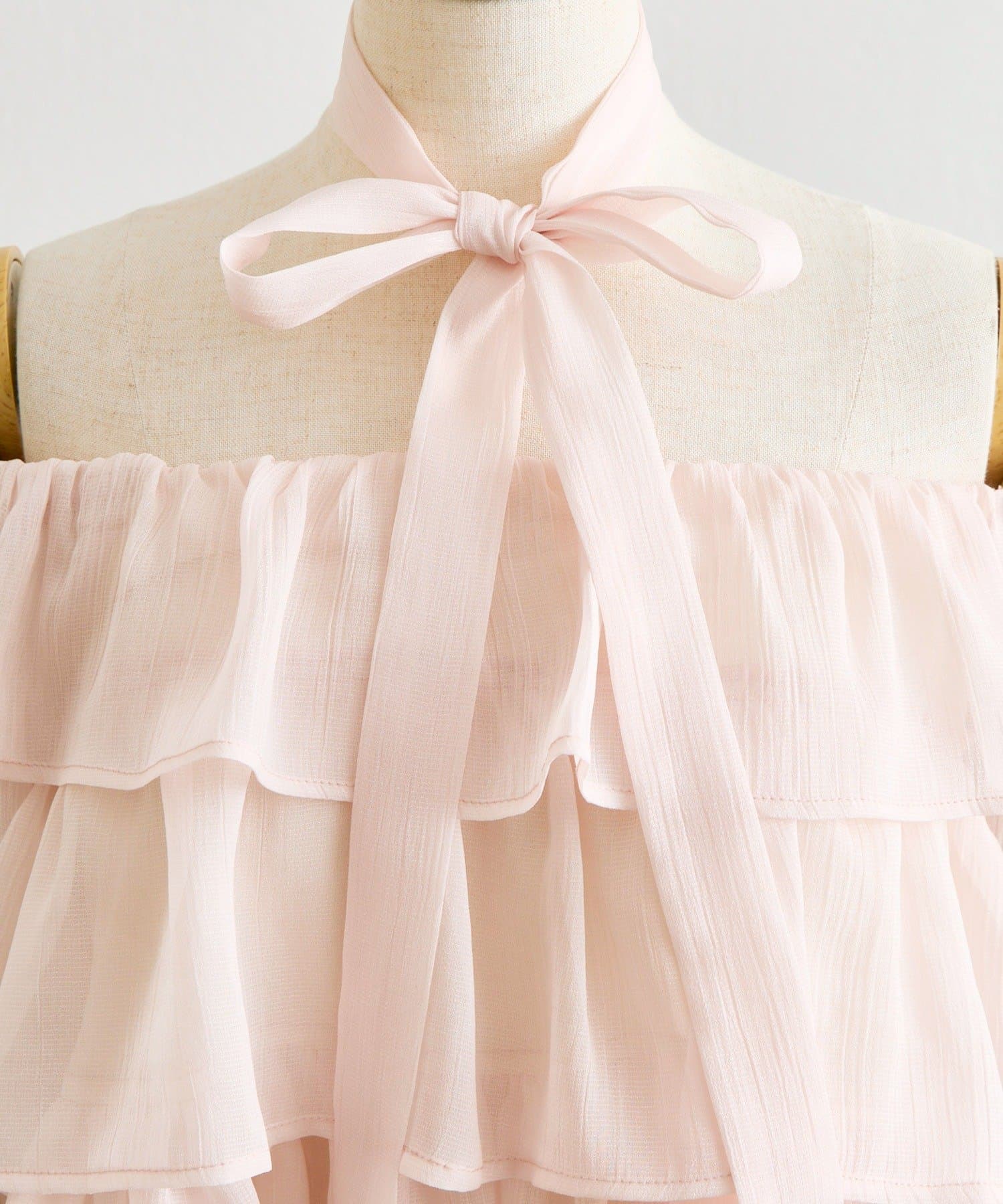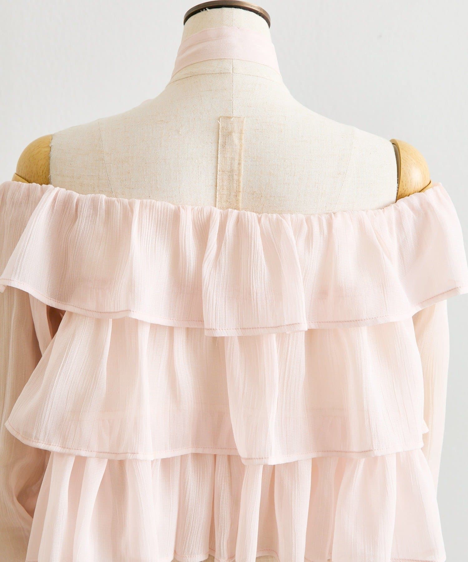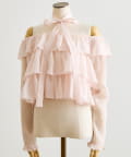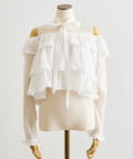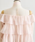 ふんわり揺れるフリルで、デコルテから甘さを纏うシアーオフショル。