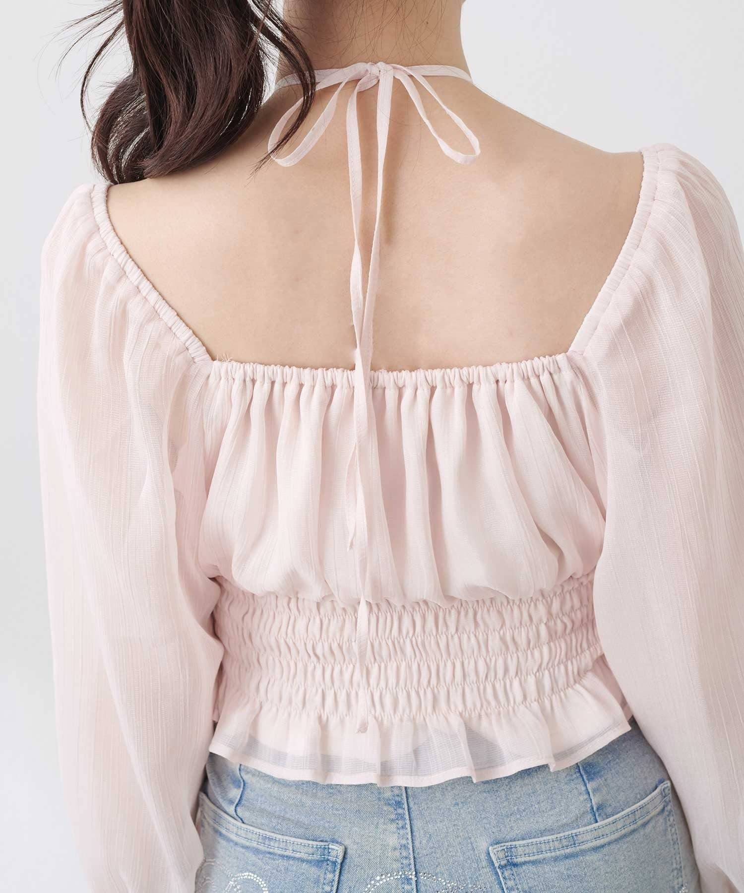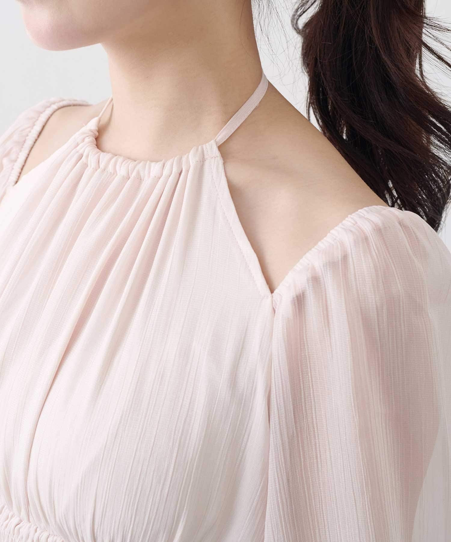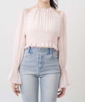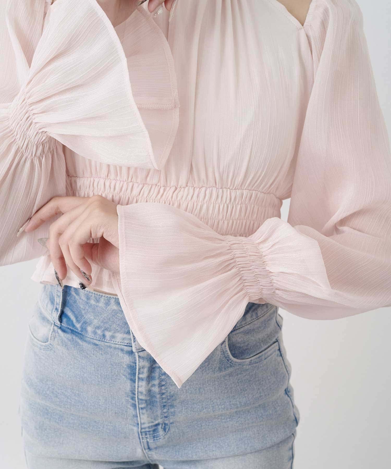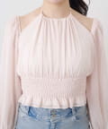 ・軽やかなシフォン素材とギャザーをたっぷり寄せたデザインで、柔らかく女性らしいシルエットに。