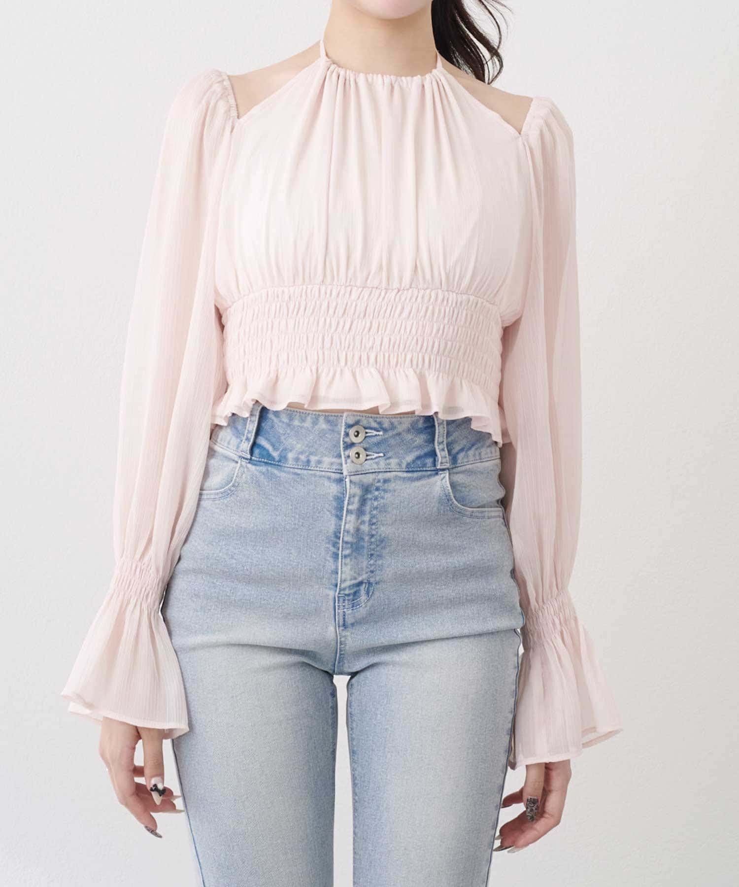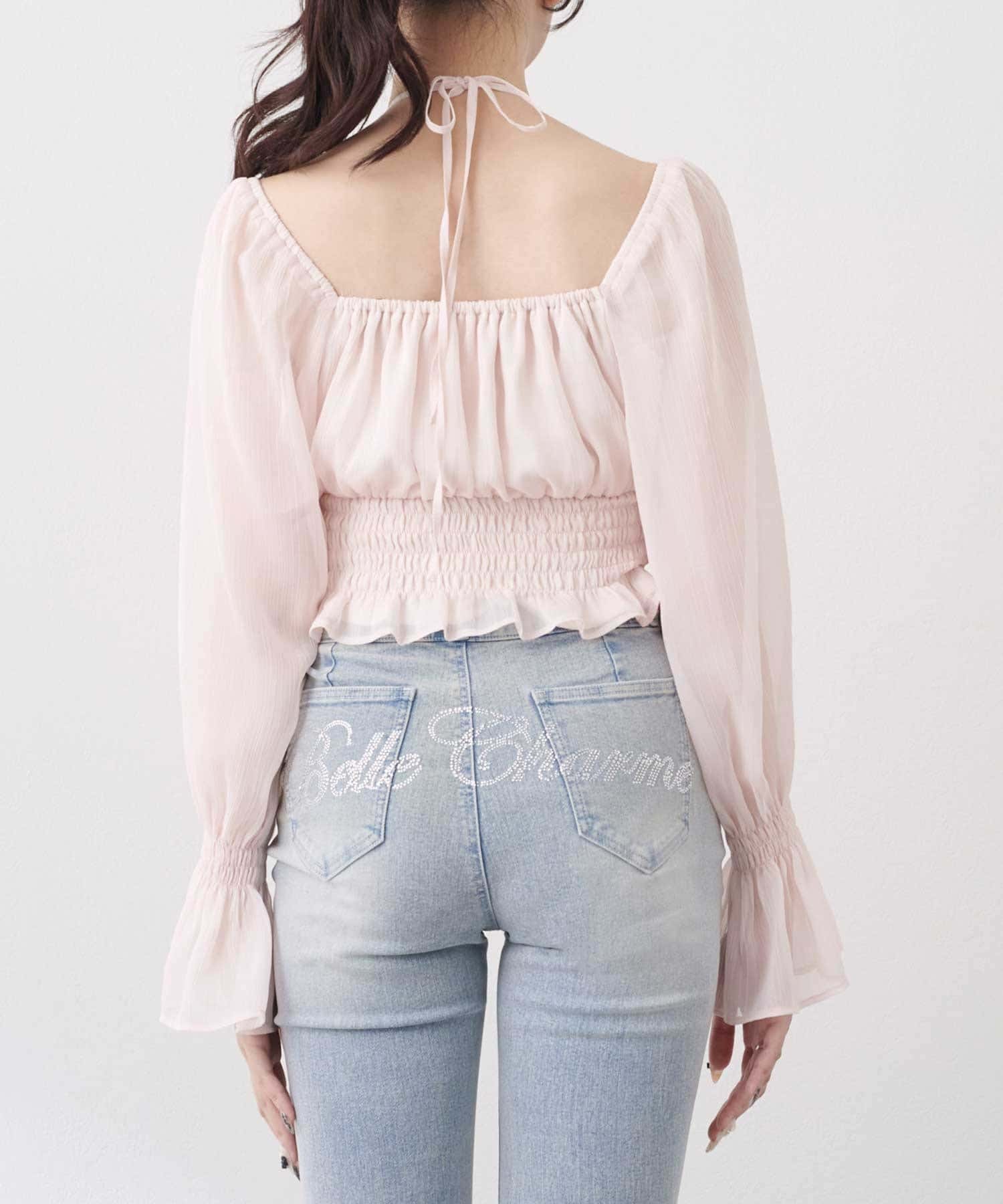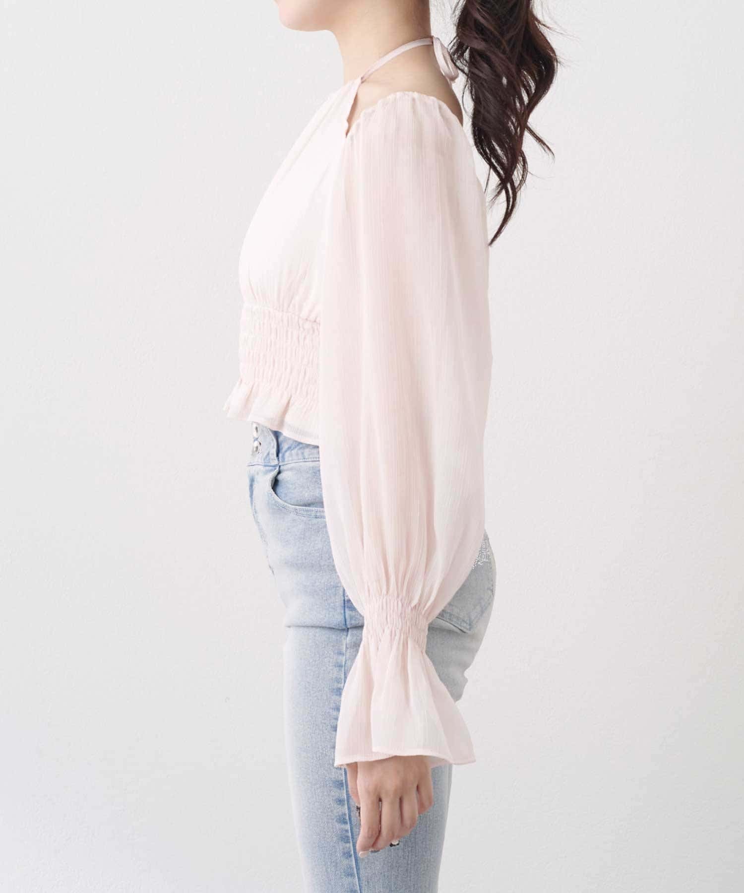 ・軽やかなシフォン素材とギャザーをたっぷり寄せたデザインで、柔らかく女性らしいシルエットに。