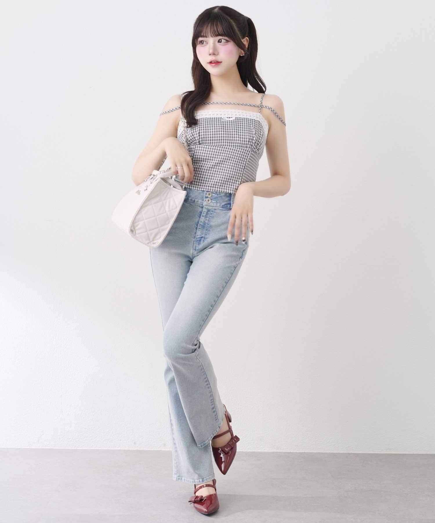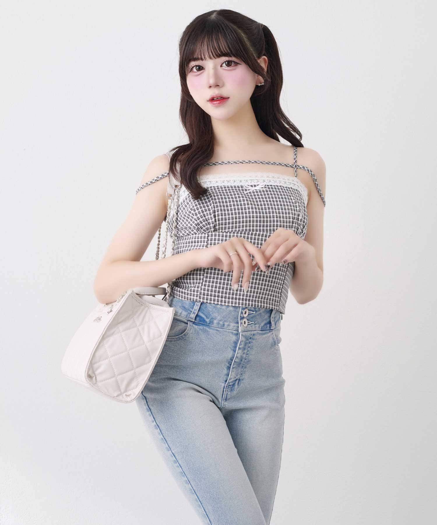 ・キャミソールは二の腕をさりげなくカバーするストラップ付きで、華奢見えと安心感を両立。