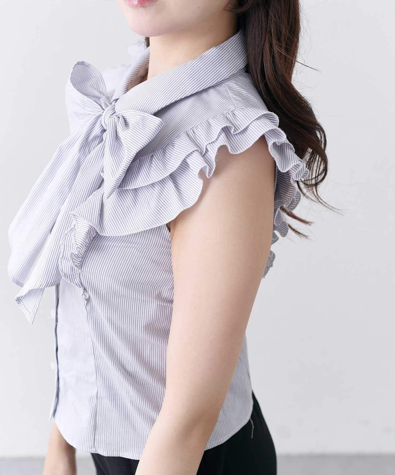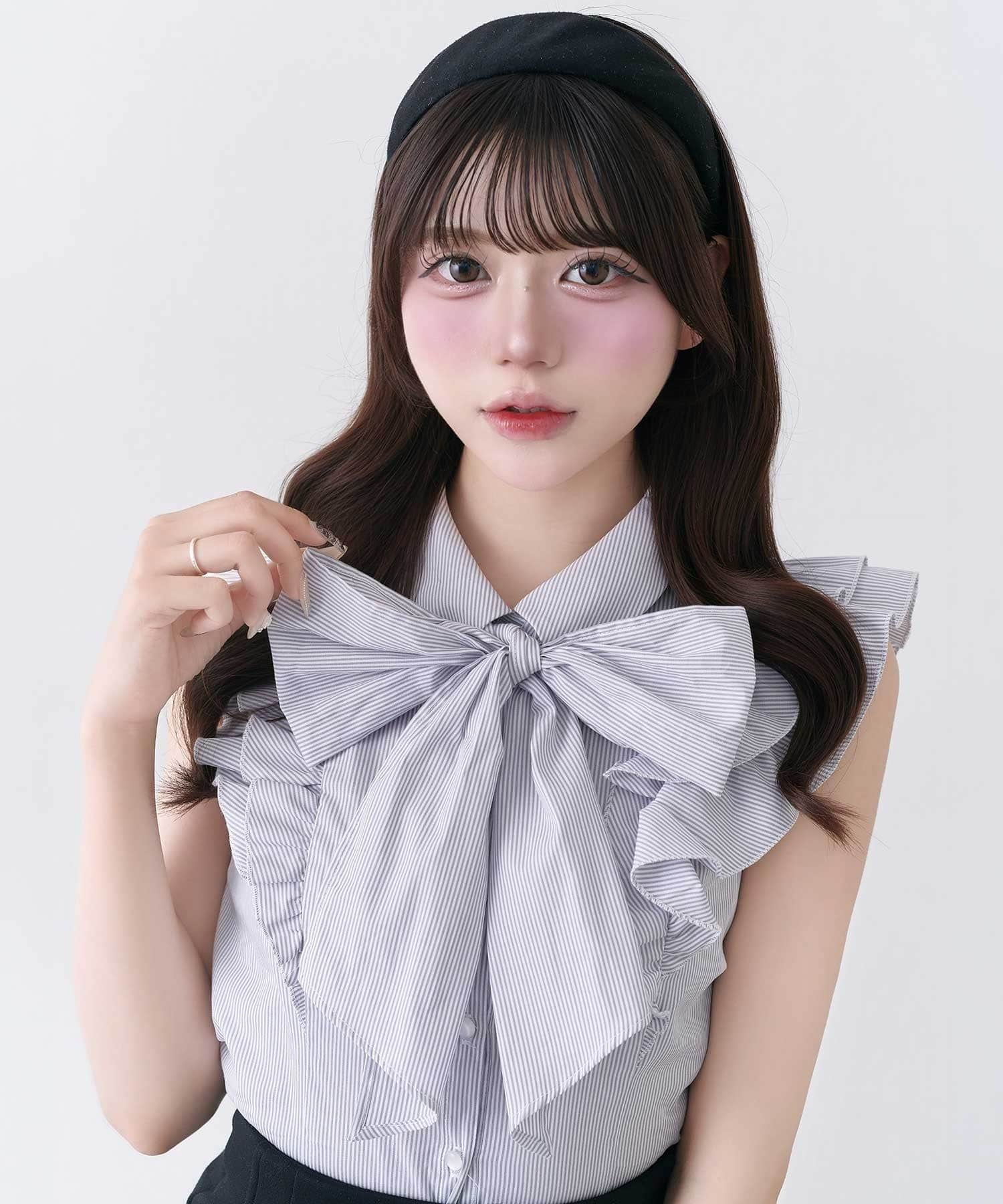 ・存在感のあるリボンタイデザインが、顔周りを華やかに演出。