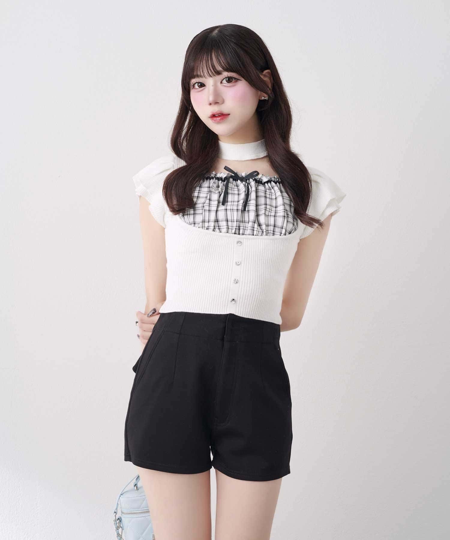 チョーカーデザインが目を惹く、ガーリーなフリルリブニットトップス。