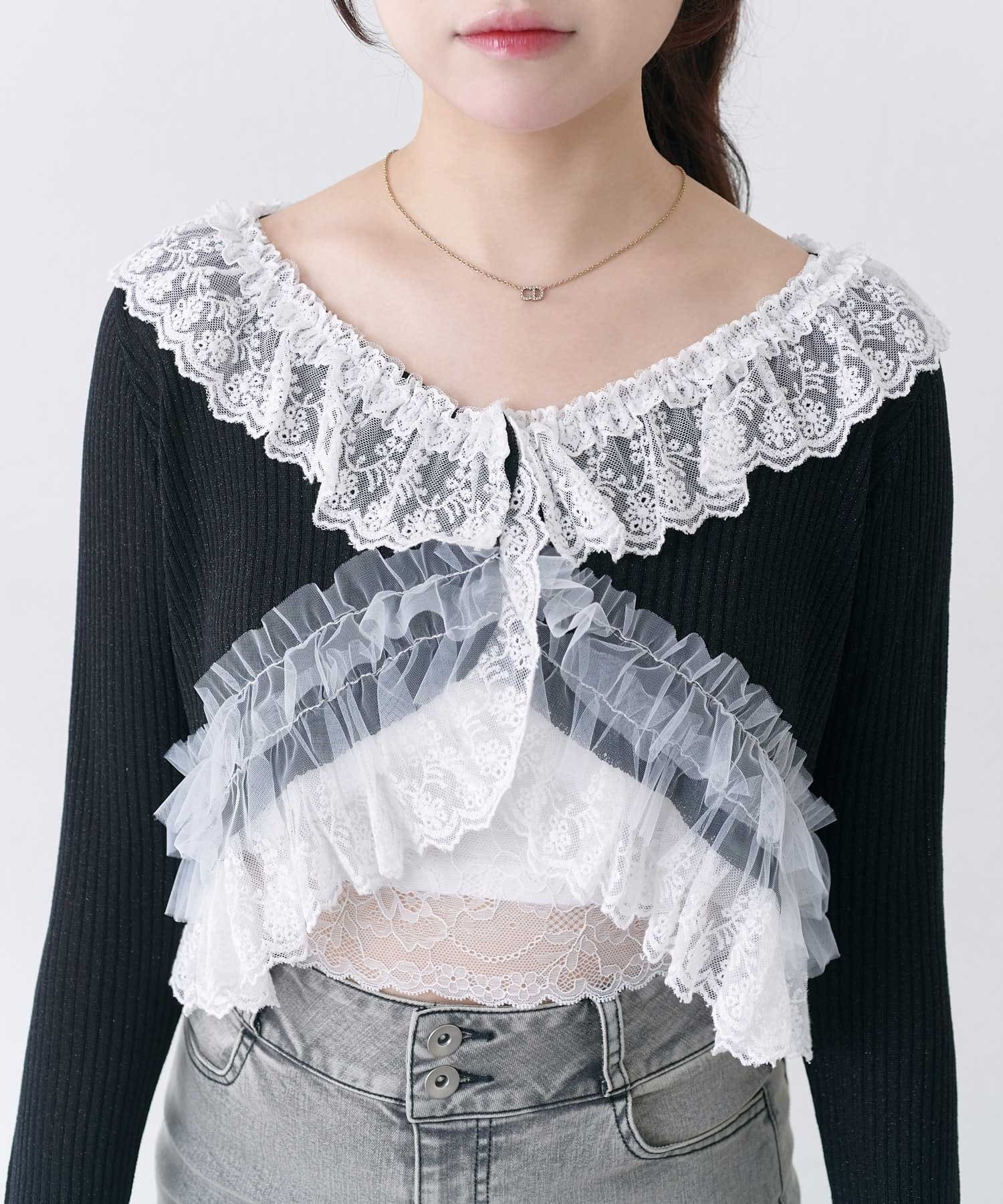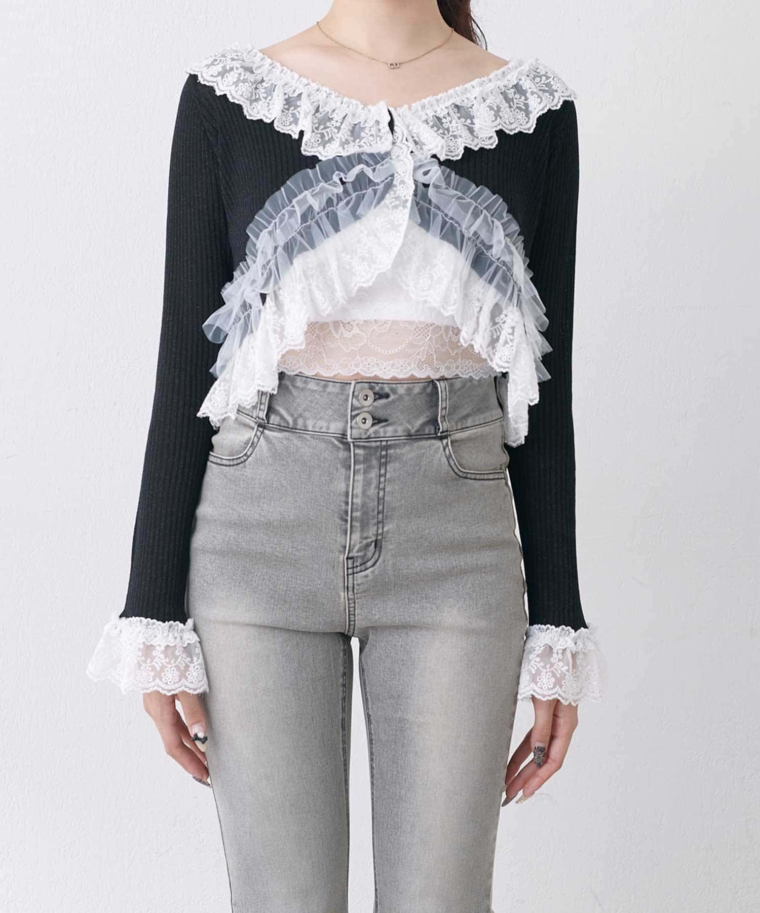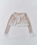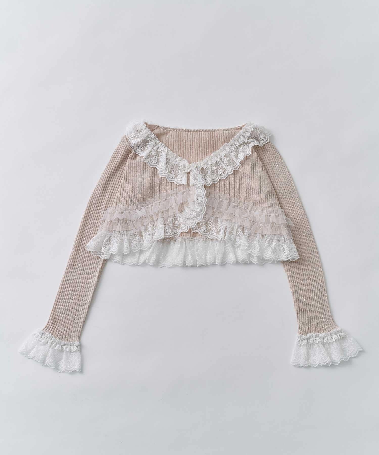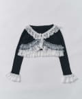 さりげないラメと華やかなフリルの、フェミニンカーディガン。