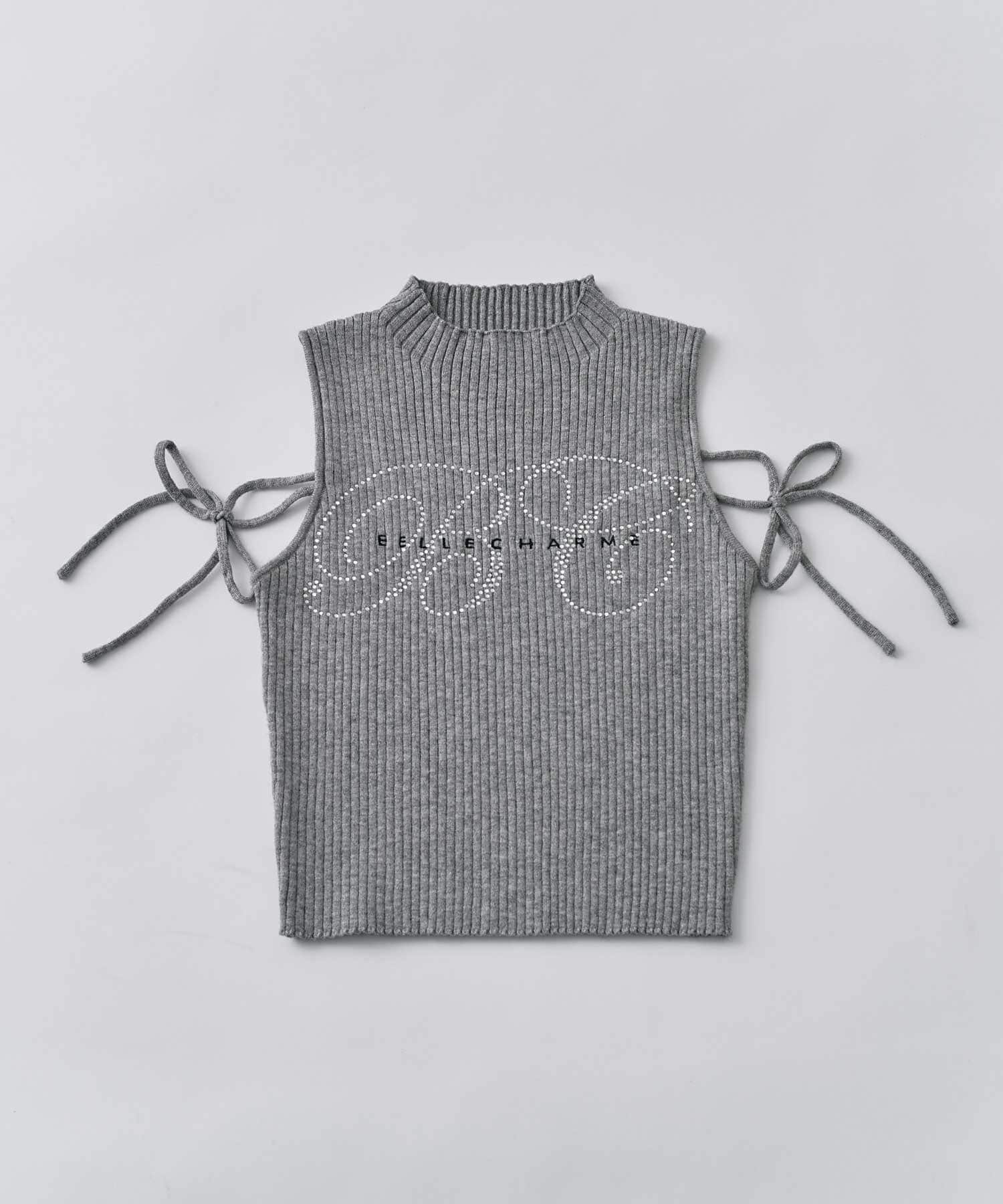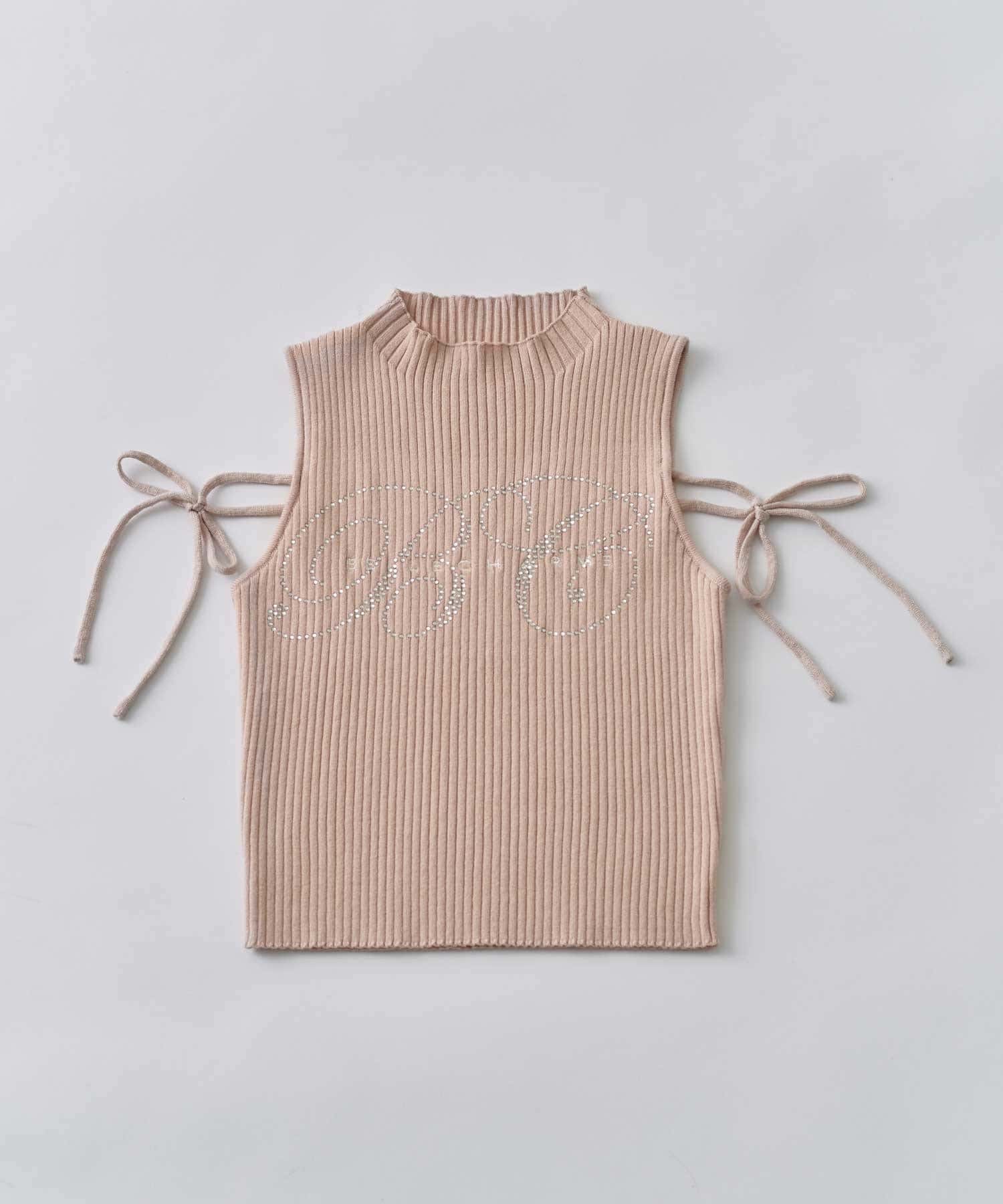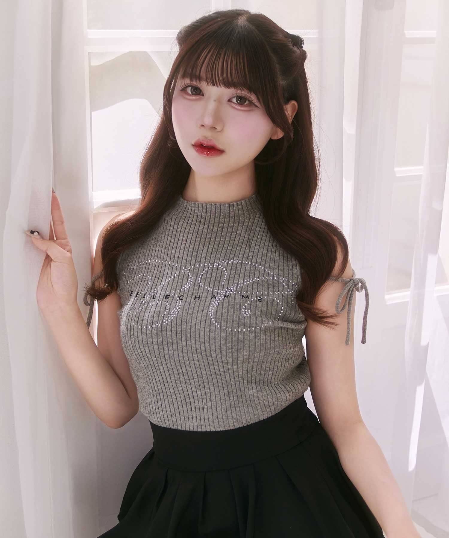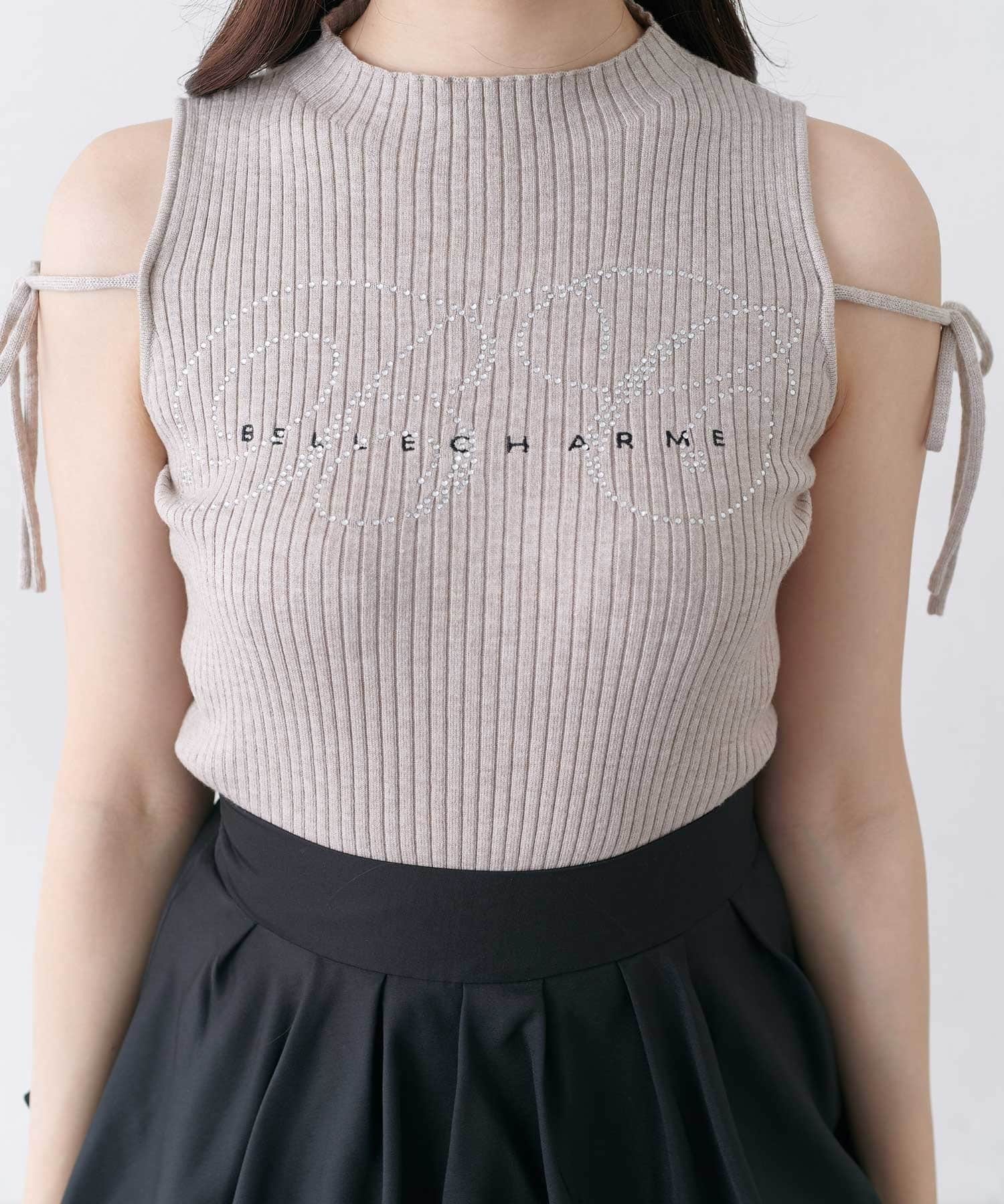 きらめくロゴデザインが目を惹く、着回し力抜群なノースリリブニットトップス。