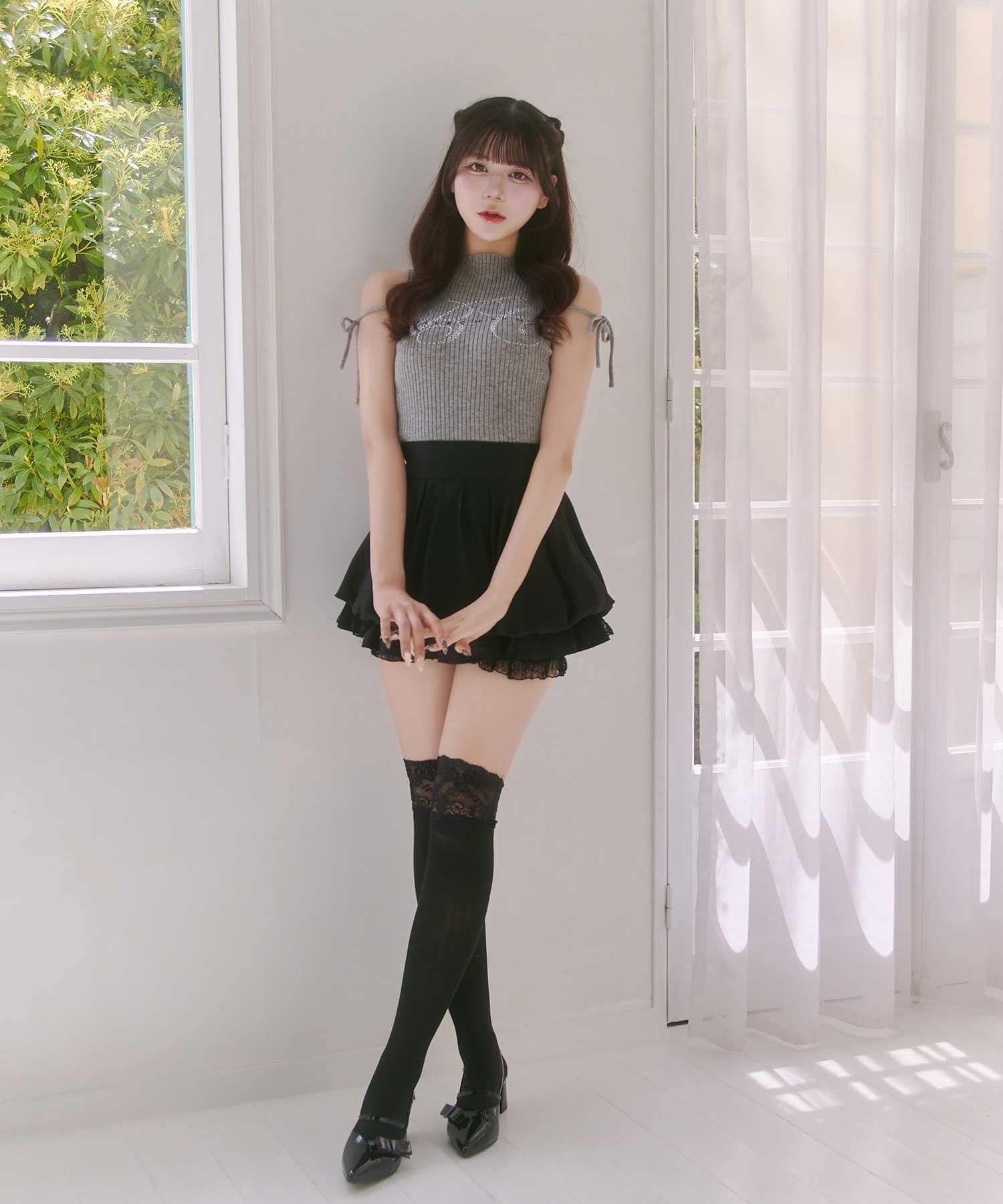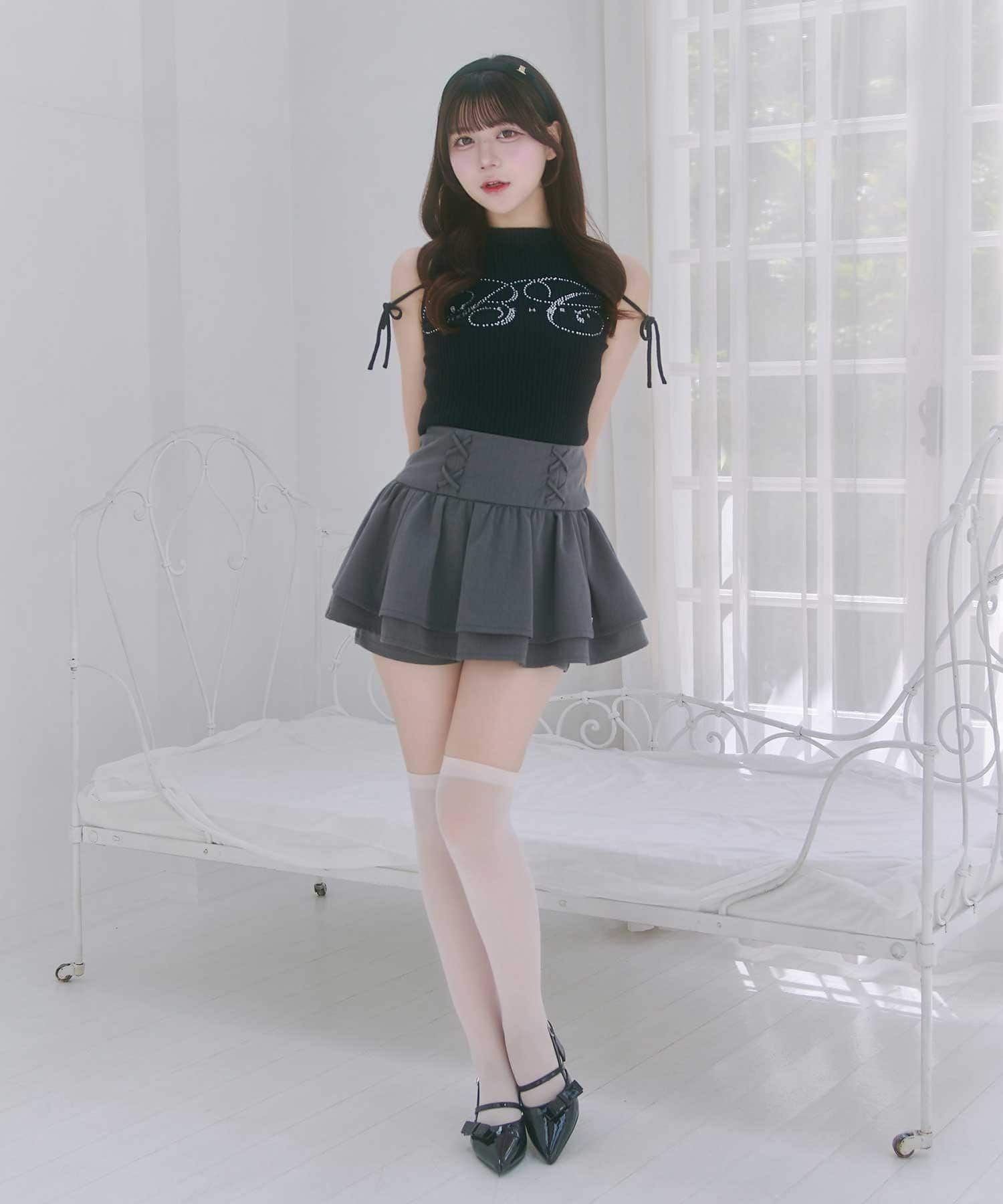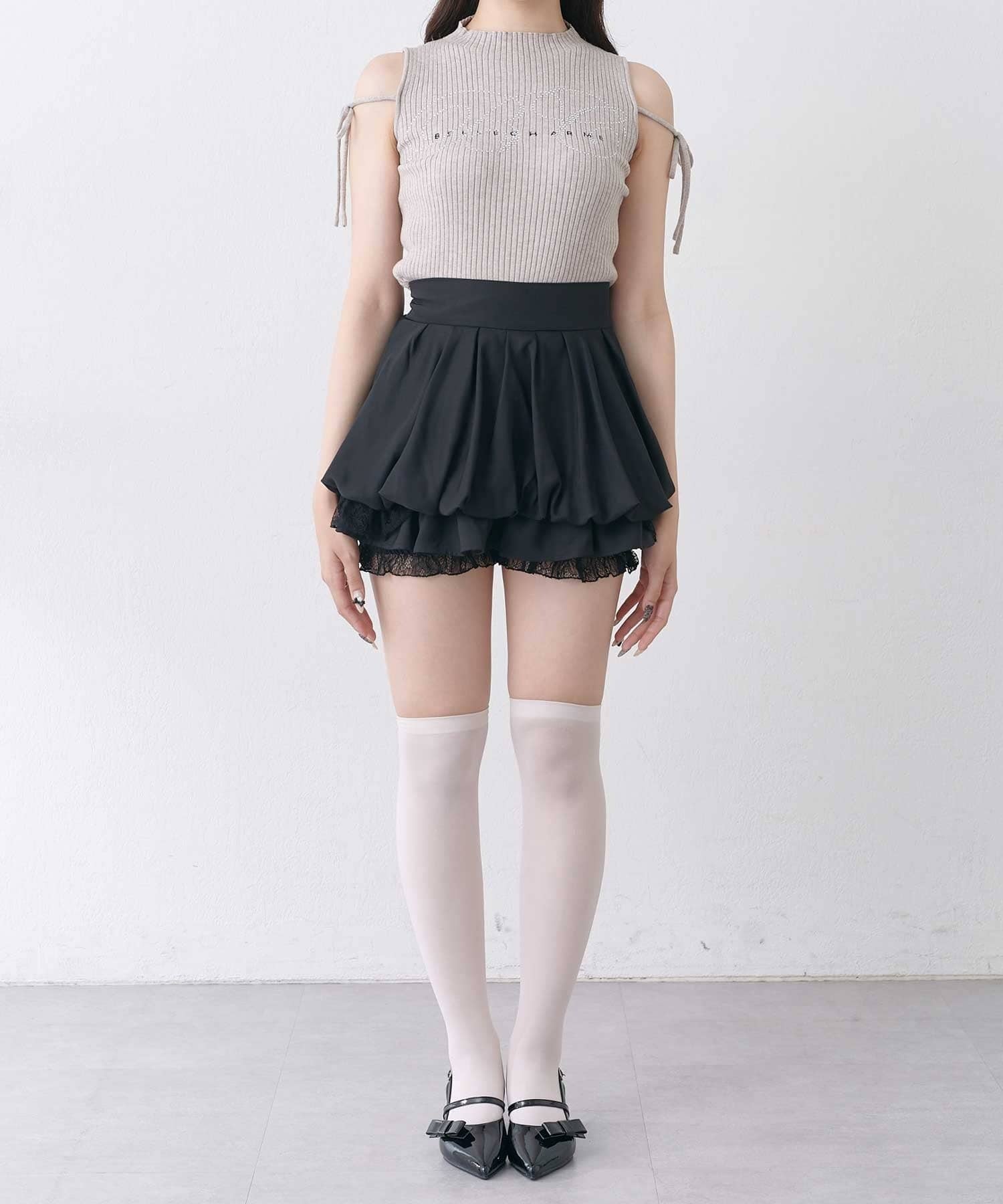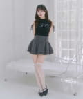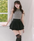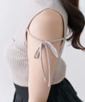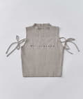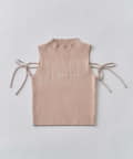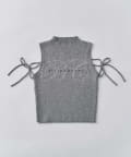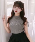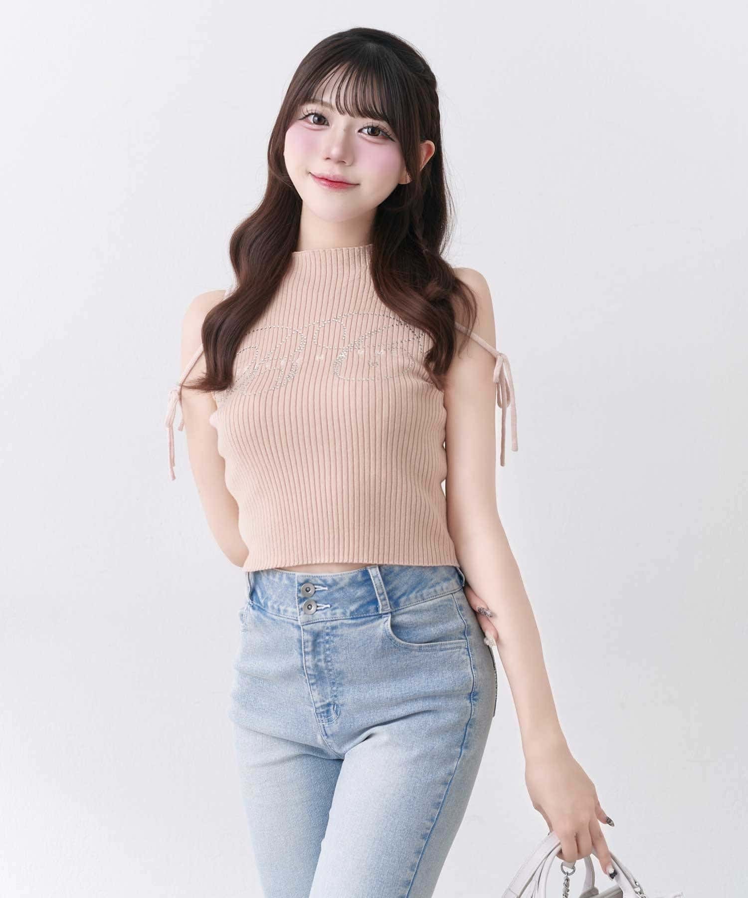 きらめくロゴデザインが目を惹く、着回し力抜群なノースリリブニットトップス。