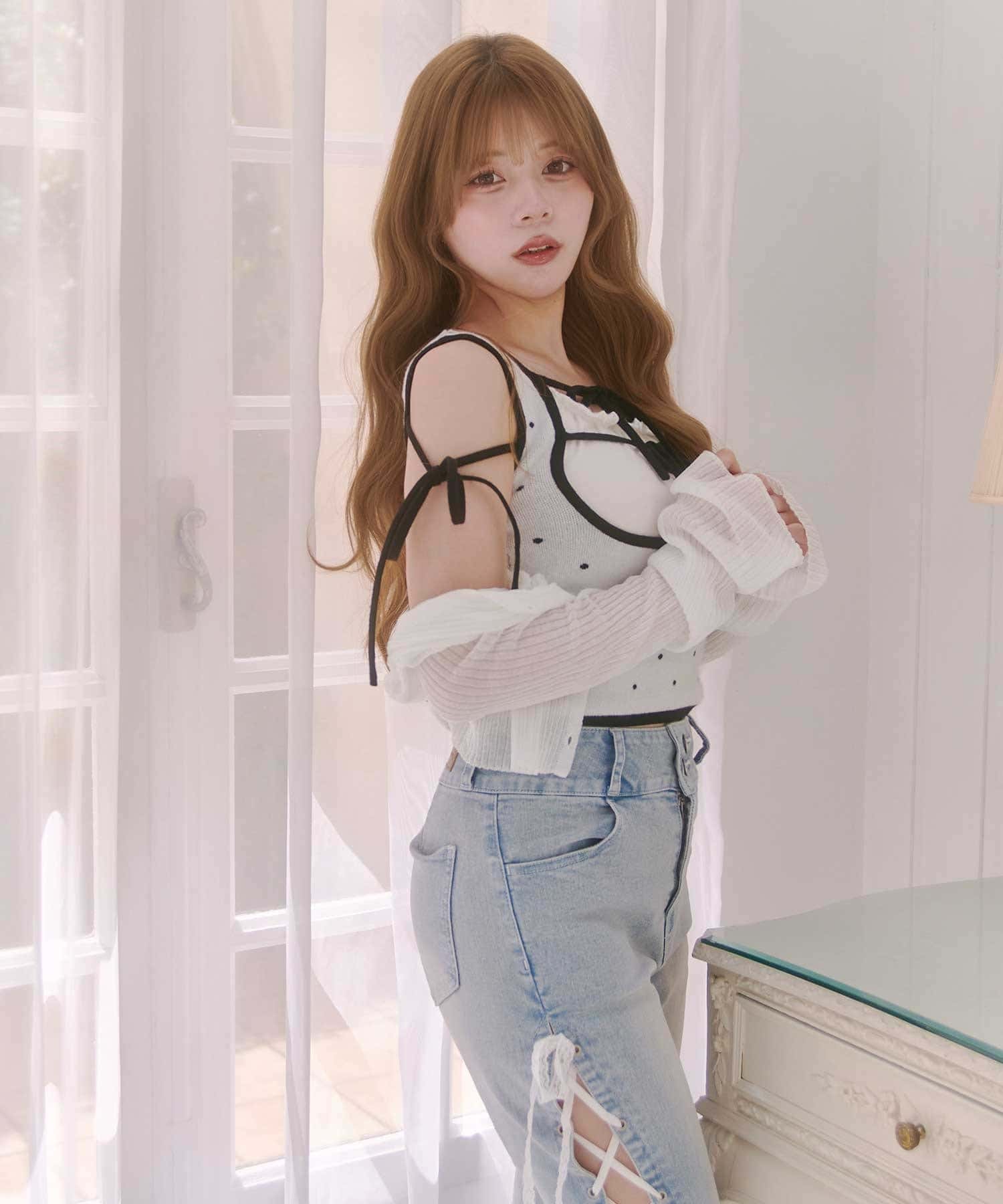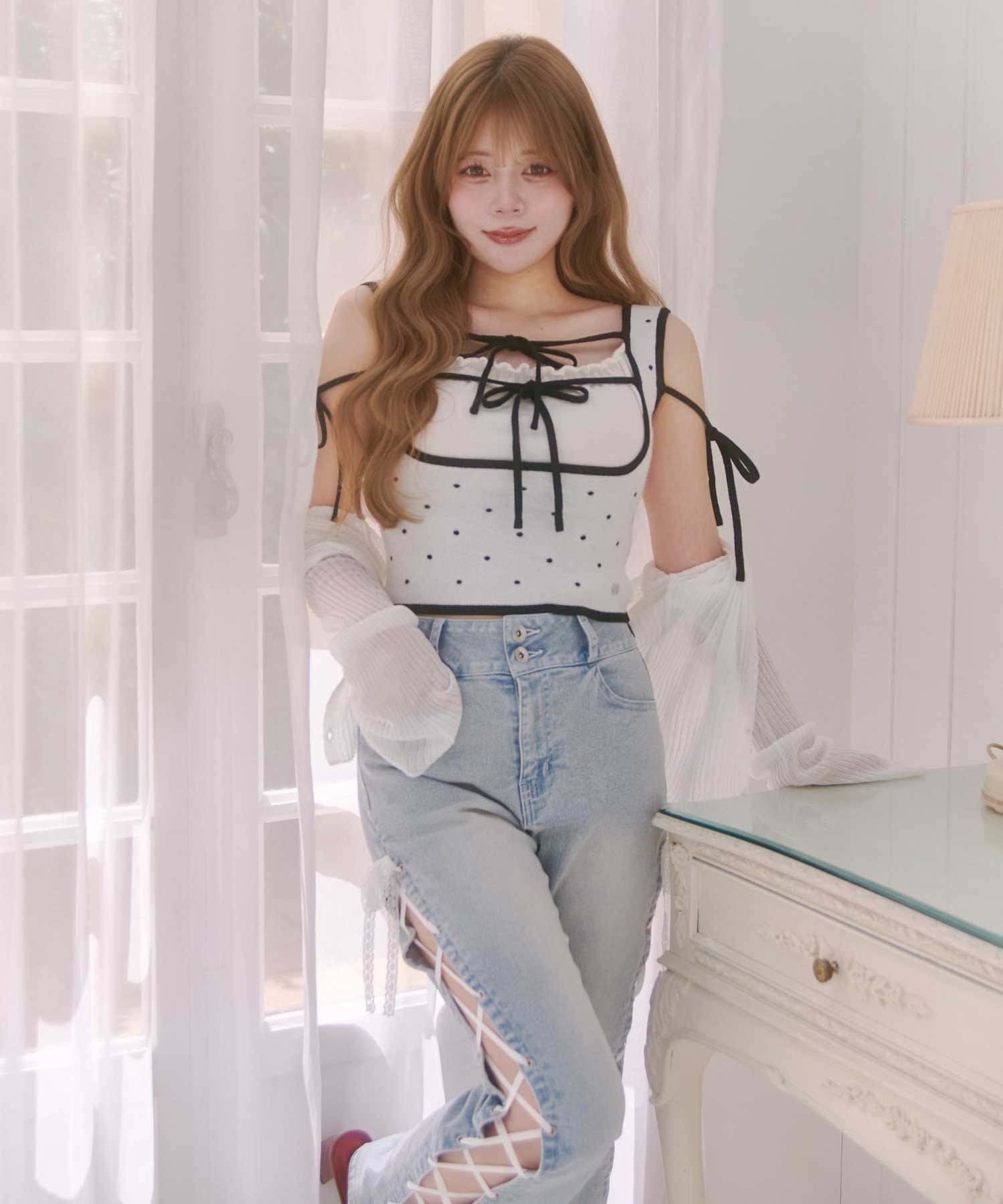 ・1161050120のシアーカーディガンを羽織るのもおすすめ。