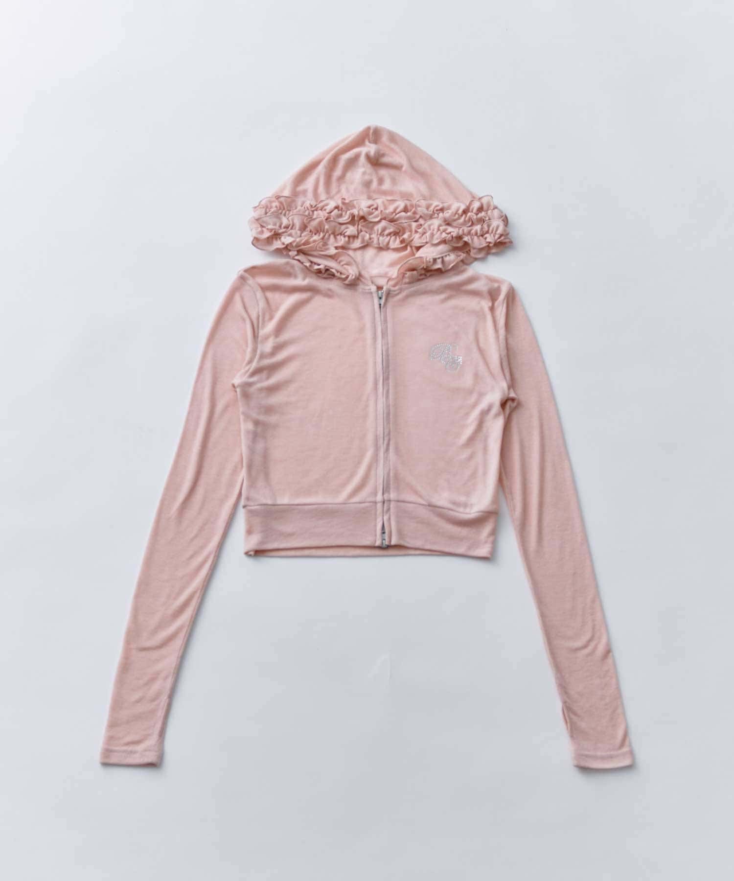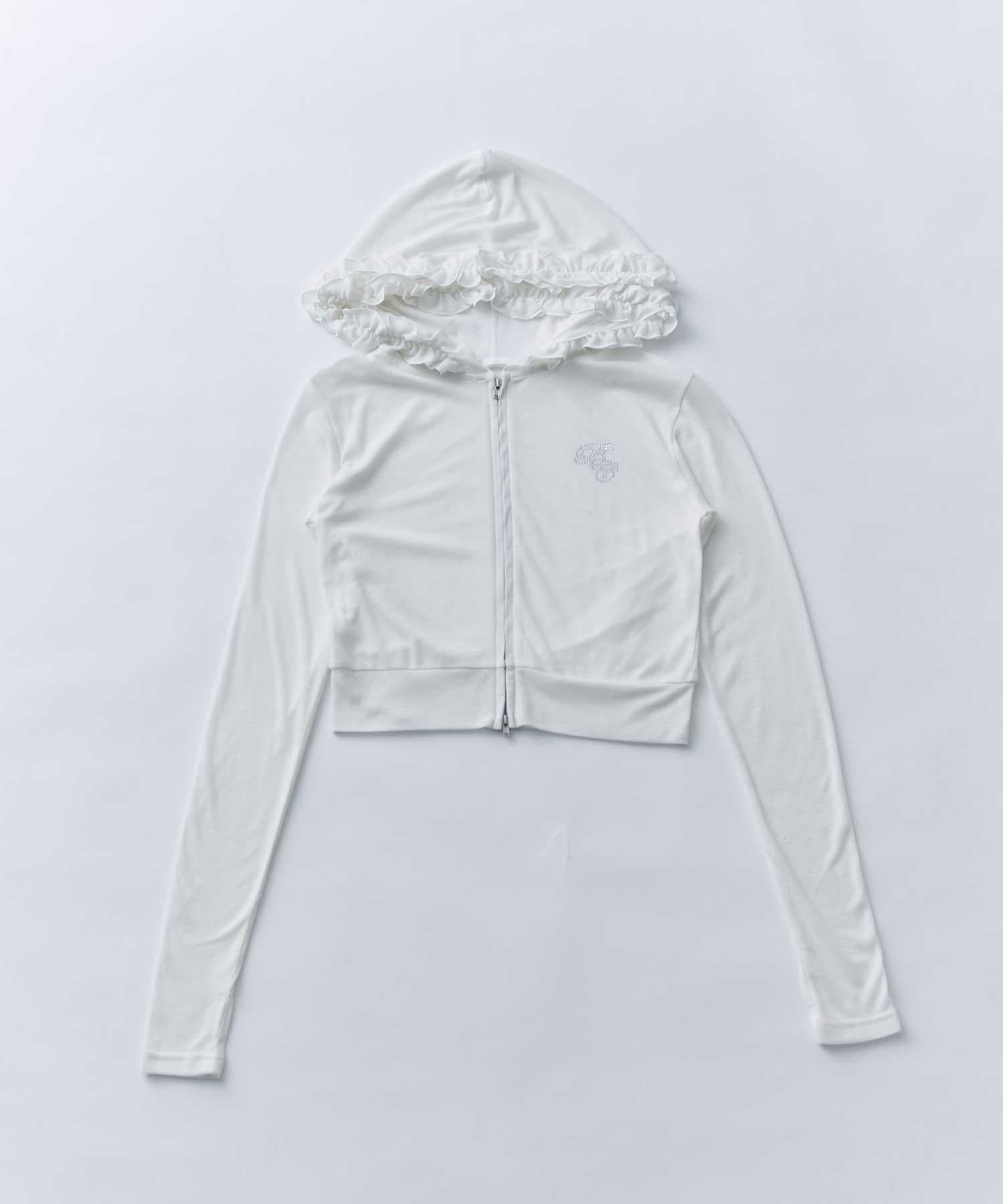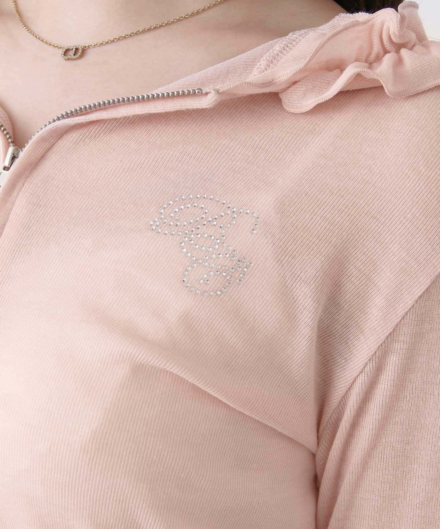フリルディテールと胸元のキラキラロゴがポイントの、UVカットパーカー。