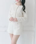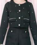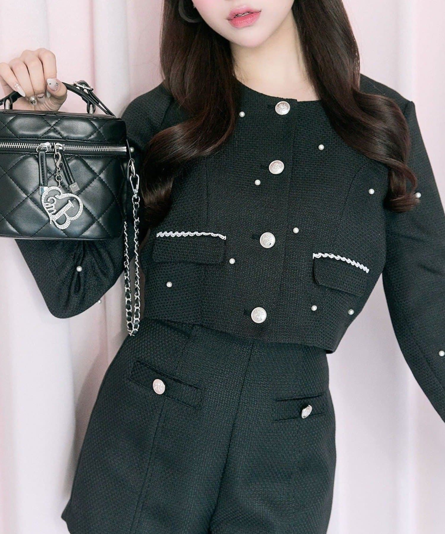 ・表情のあるツイード素材に、パール調パーツを散りばめた華やかなデザイン。