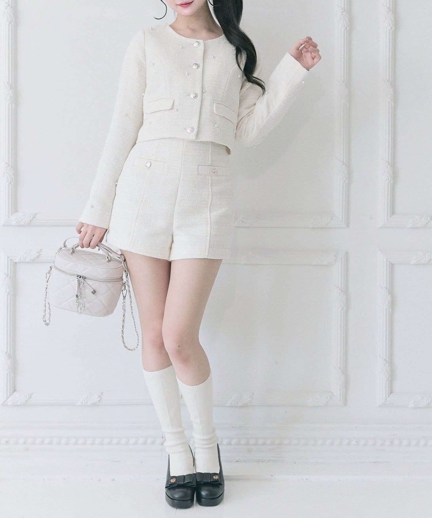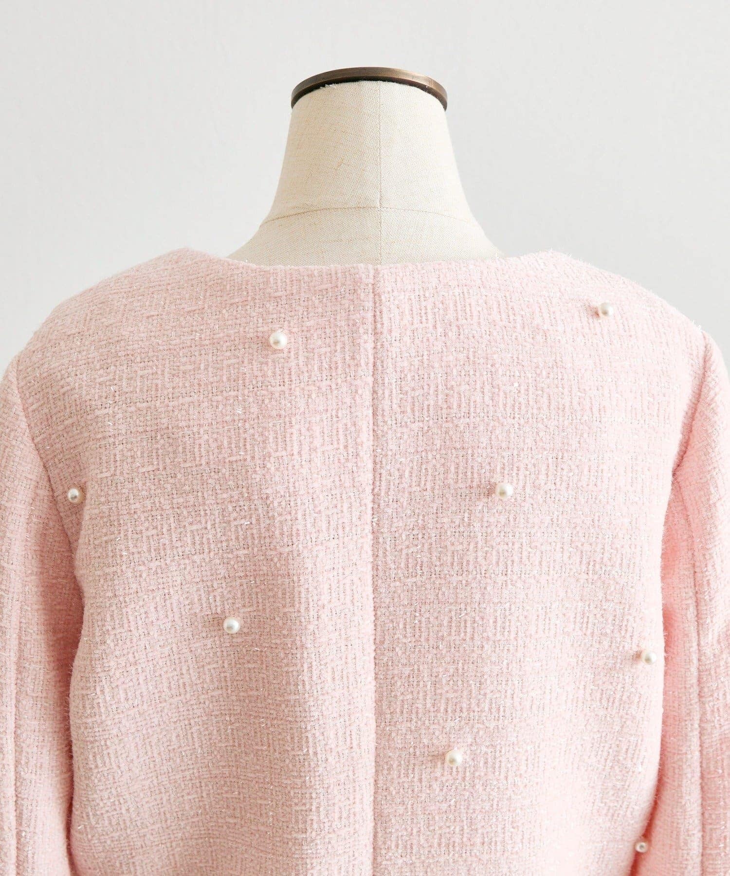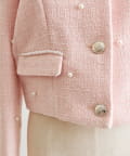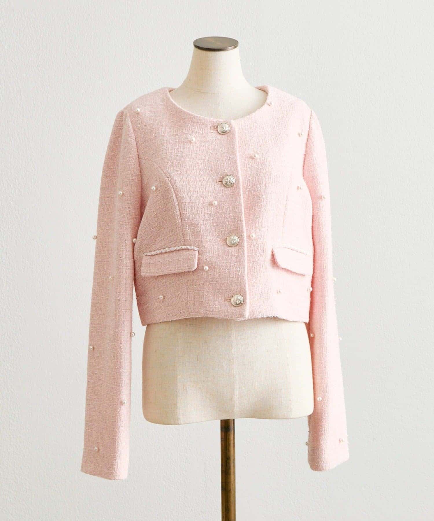 パールディテールが映える、上品フェミニンなツイードジャケット。
