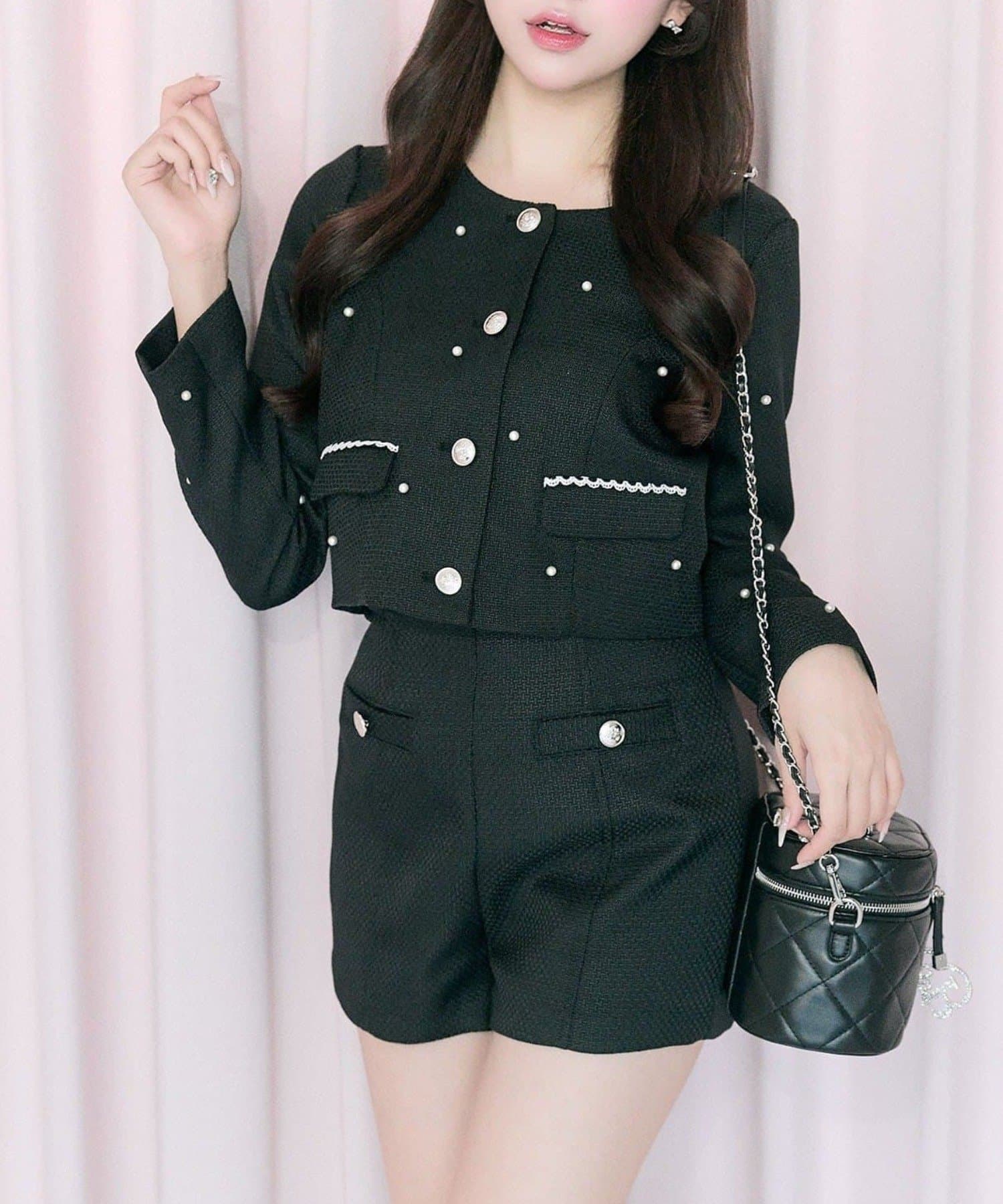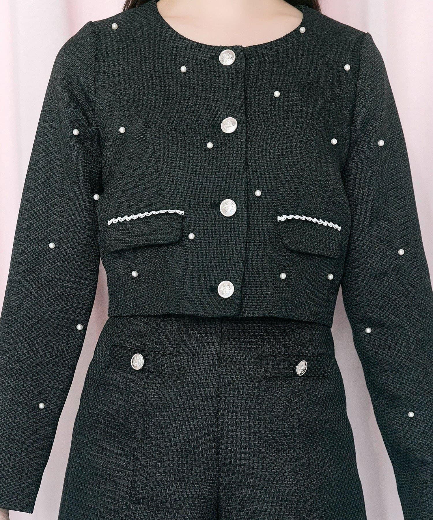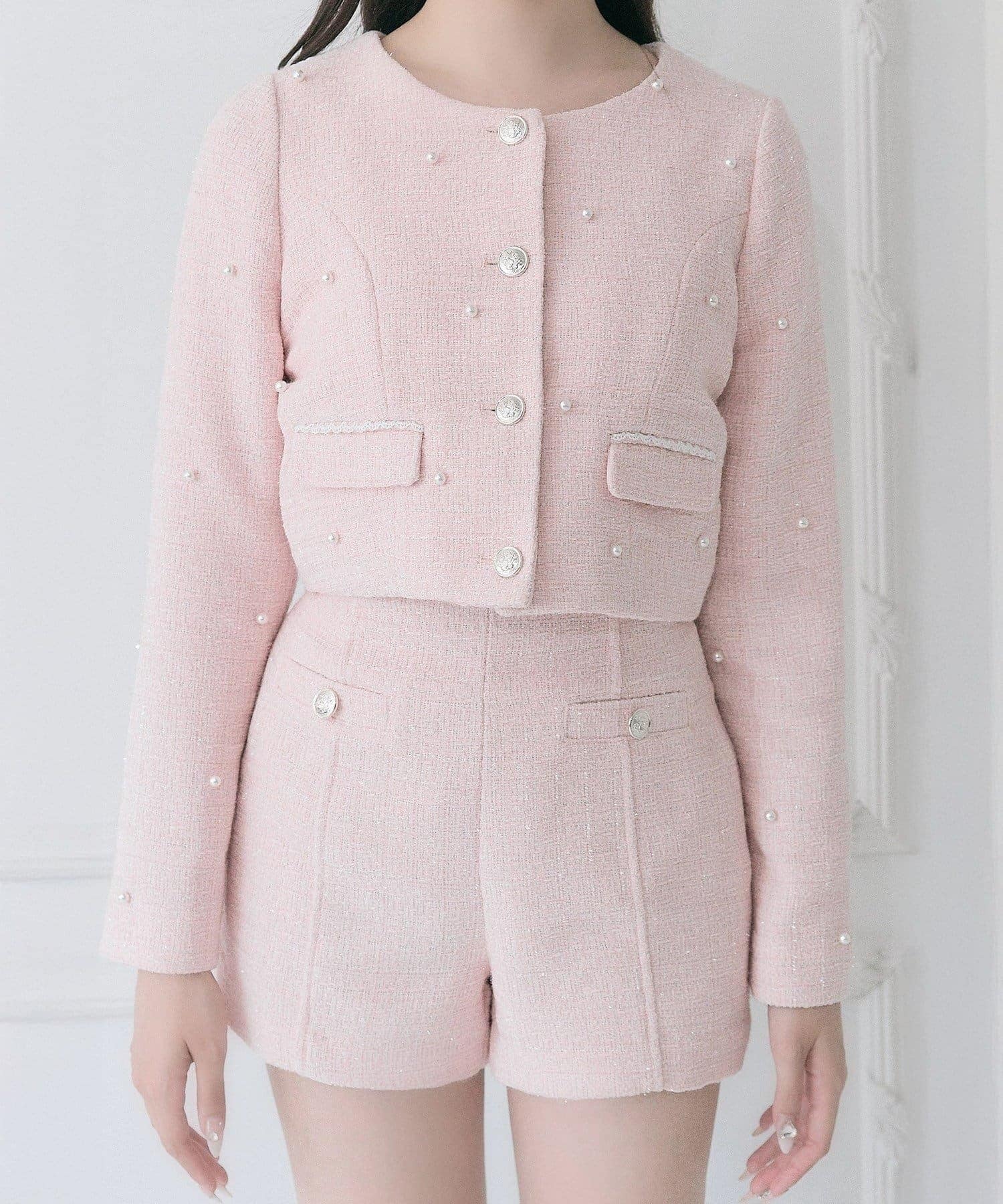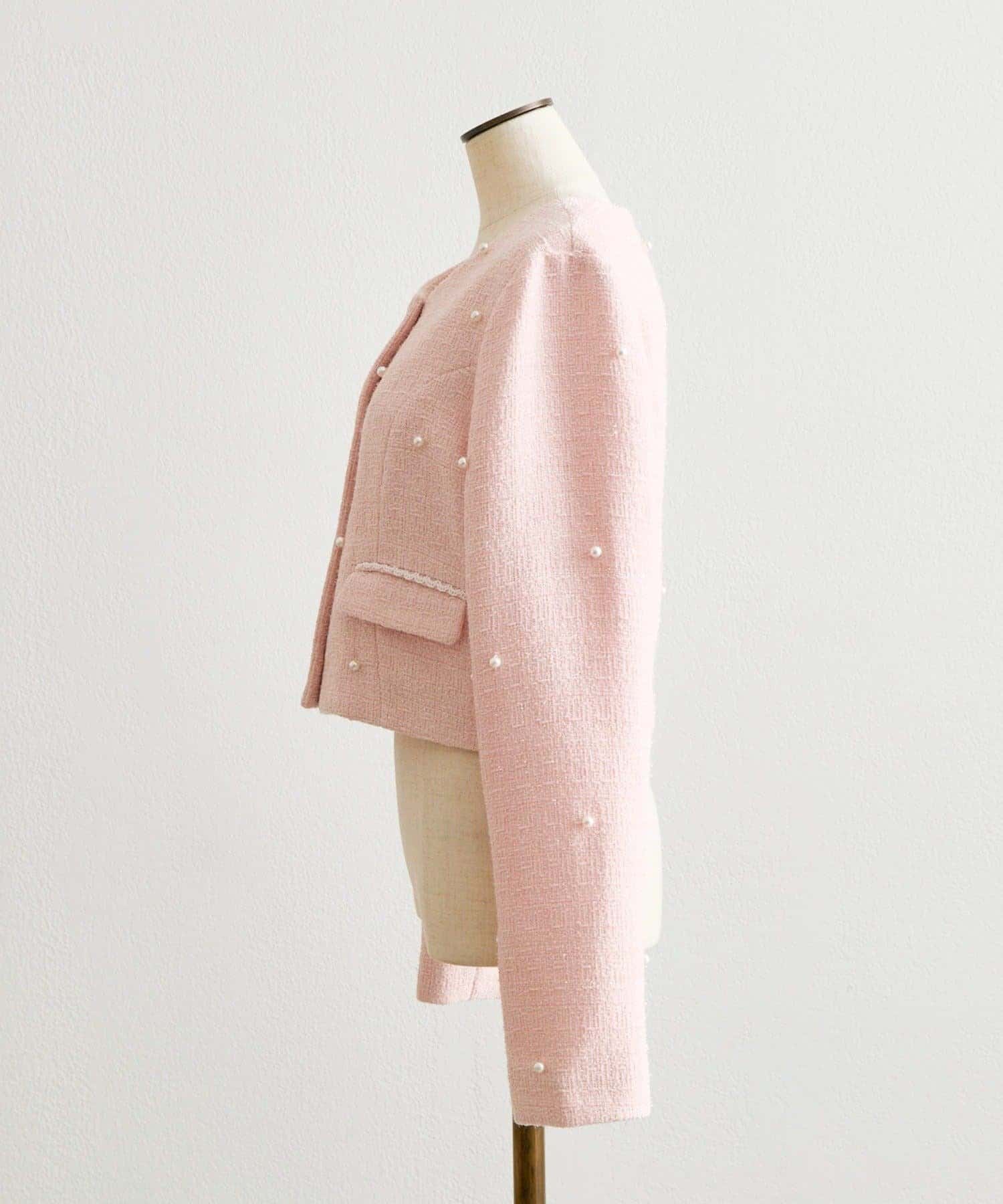 パールディテールが映える、上品フェミニンなツイードジャケット。