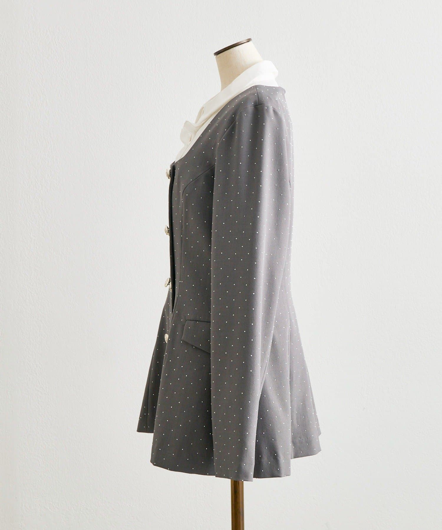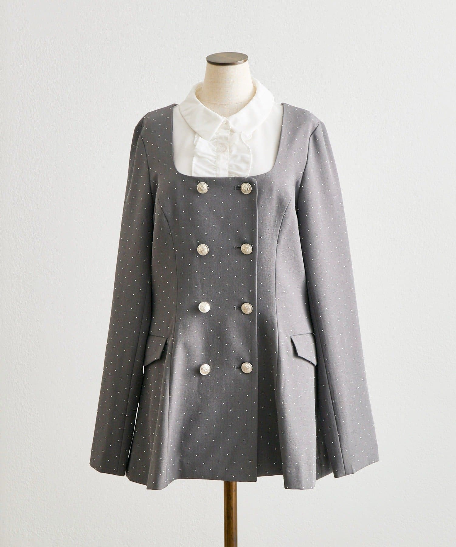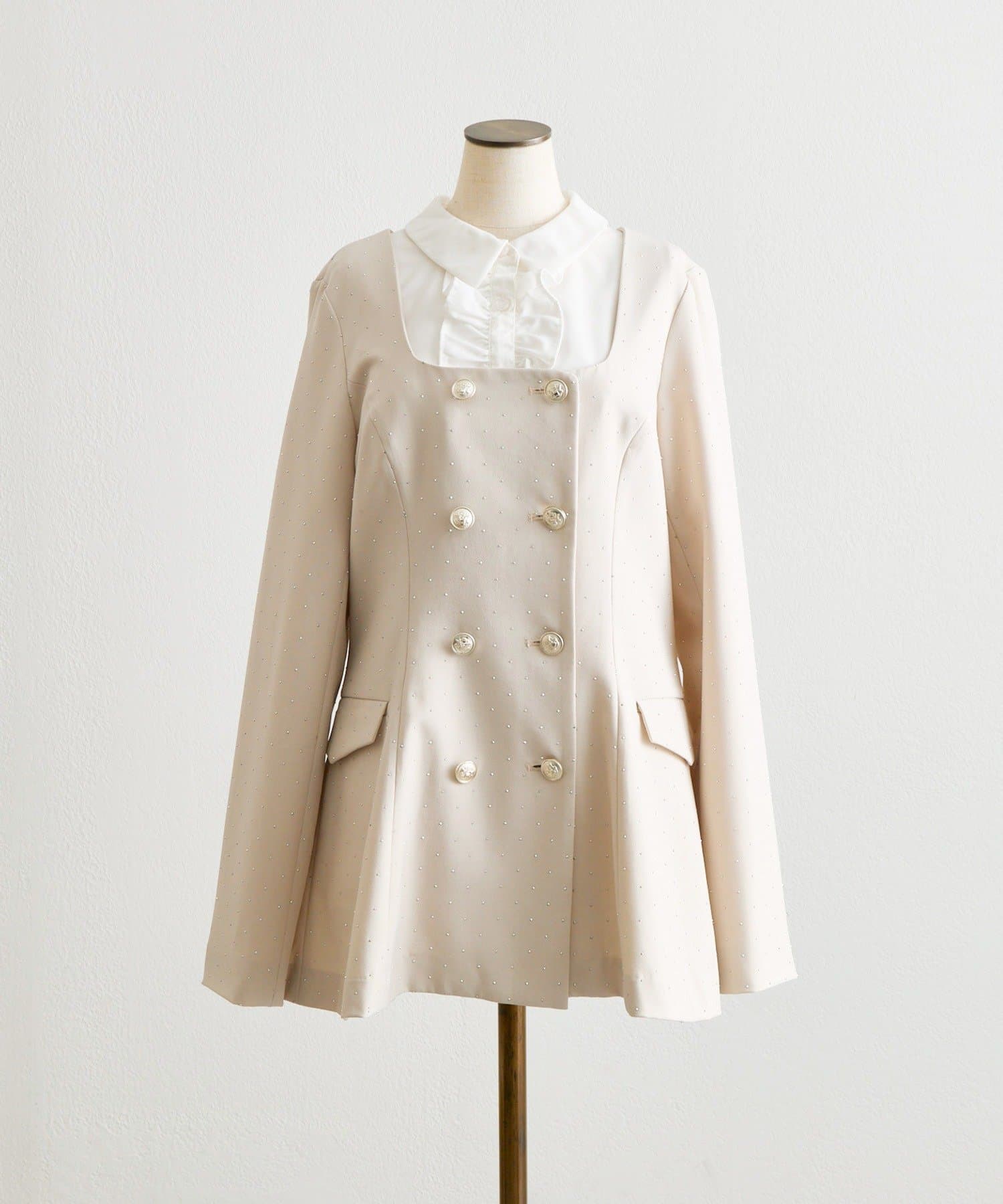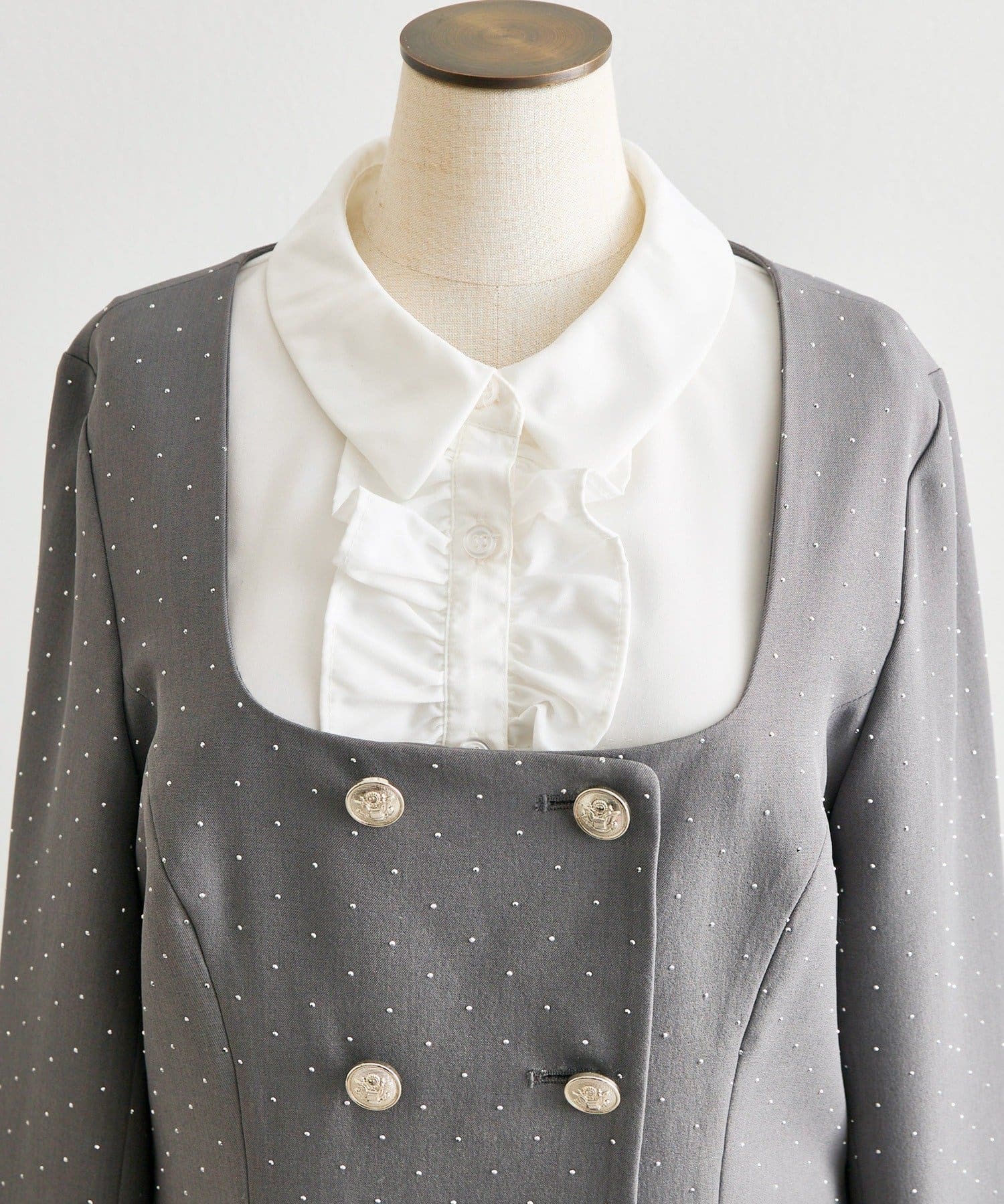 ・・フリル襟のブラウスをレイヤードしているようなデザインで、金ボタンが上品見えするジャケット。