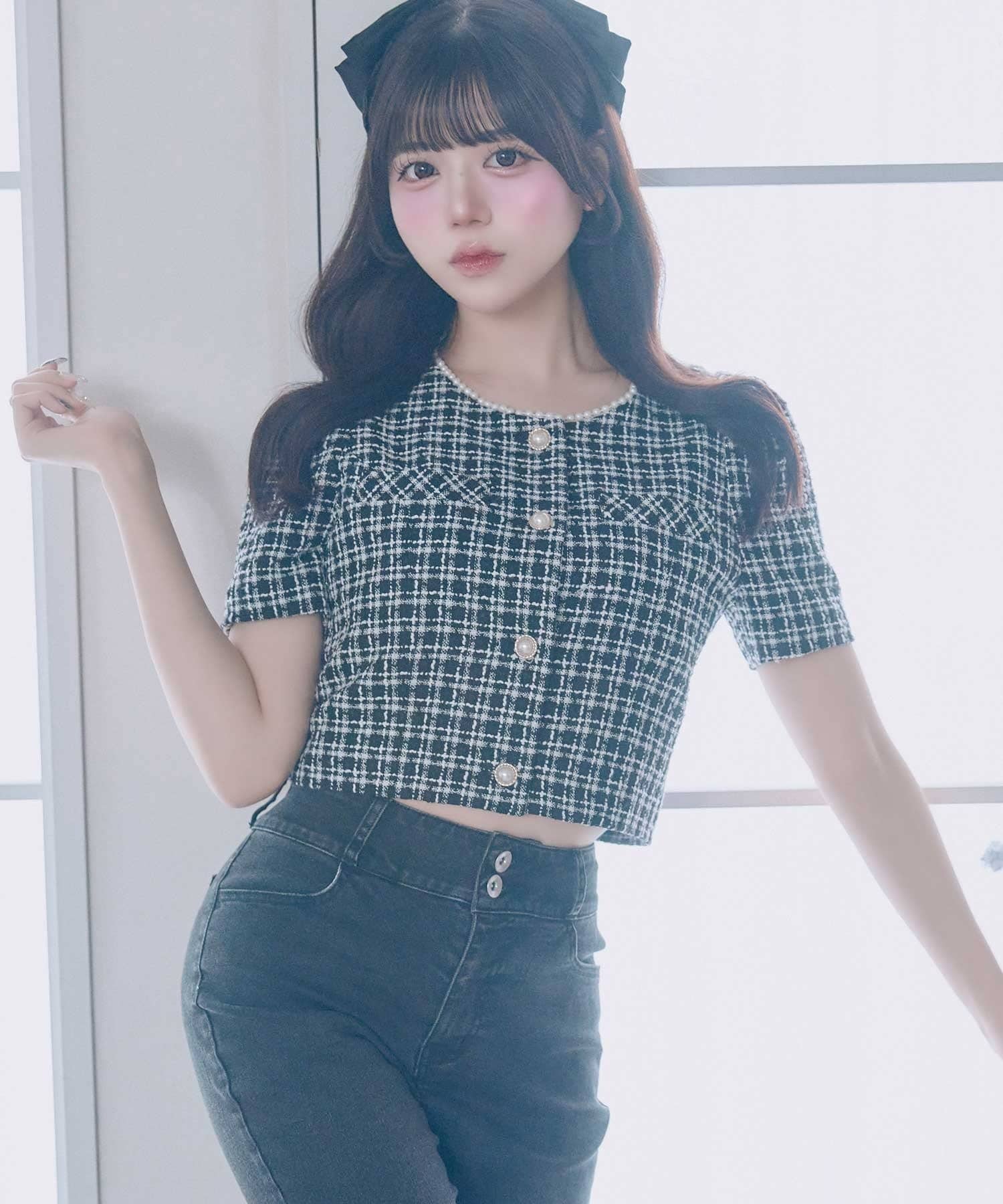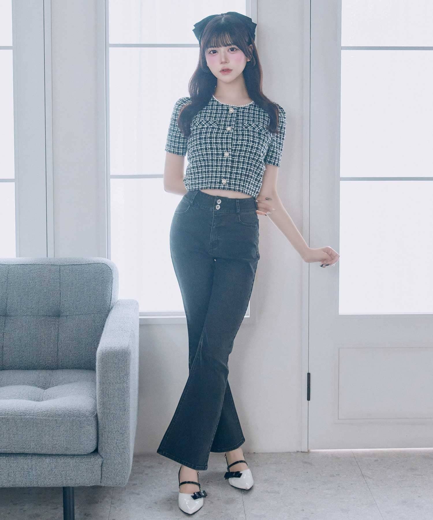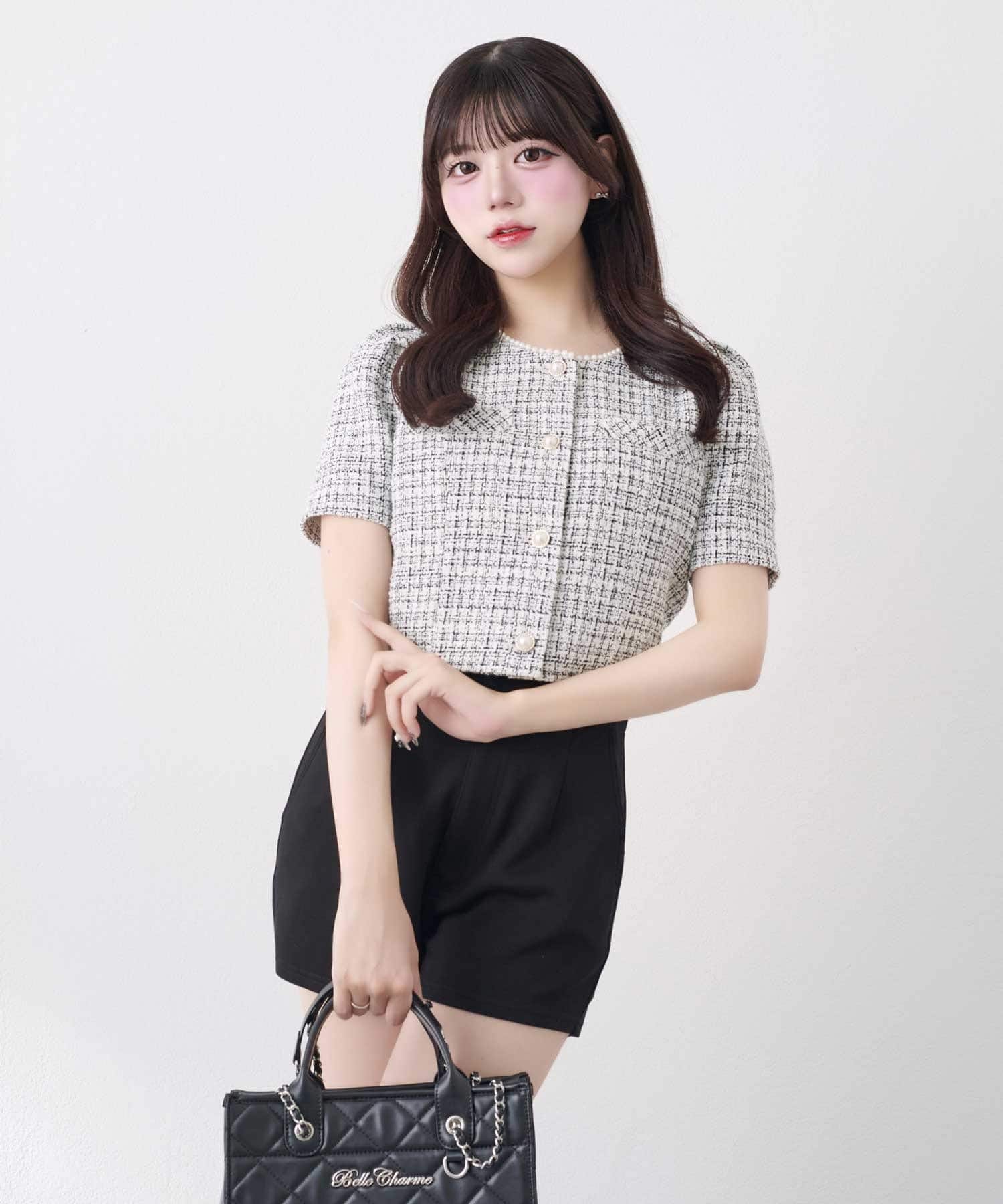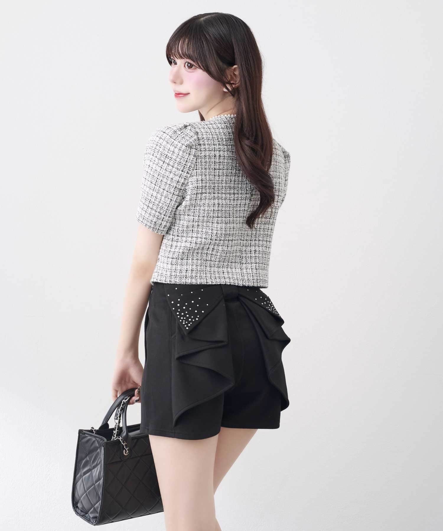 ・Back Ribbon Short Pants(品番:1161020040)と合わせることで上品なツイードとリボンディテールが引き立つフェミニンなスタイリングに。