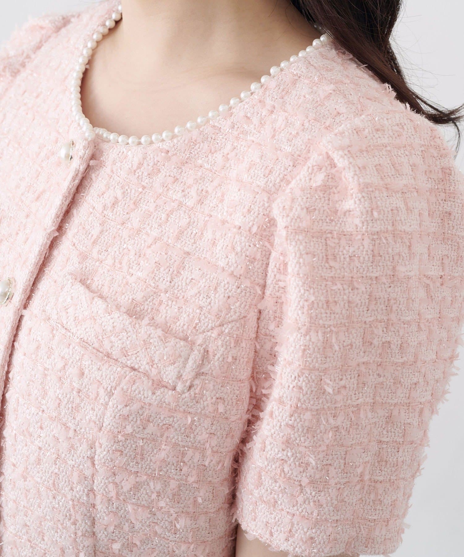 ・ネックラインにあしらったパールデザインが顔まわりを華やかに演出。