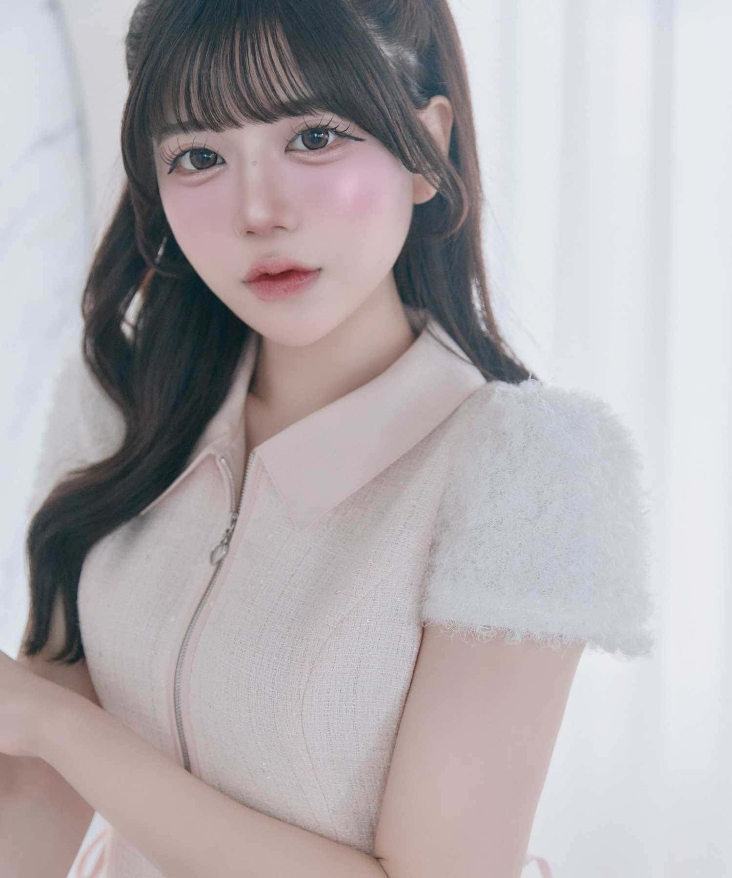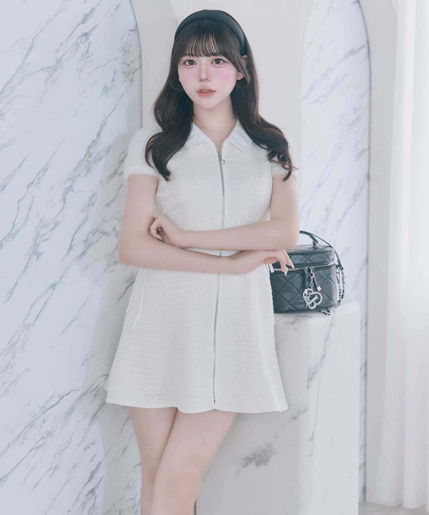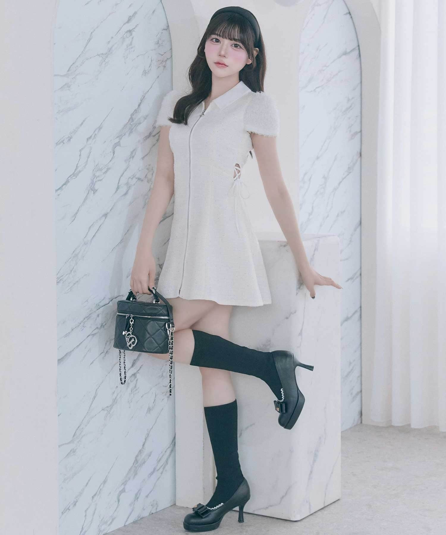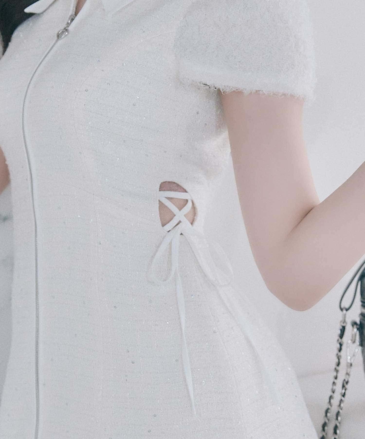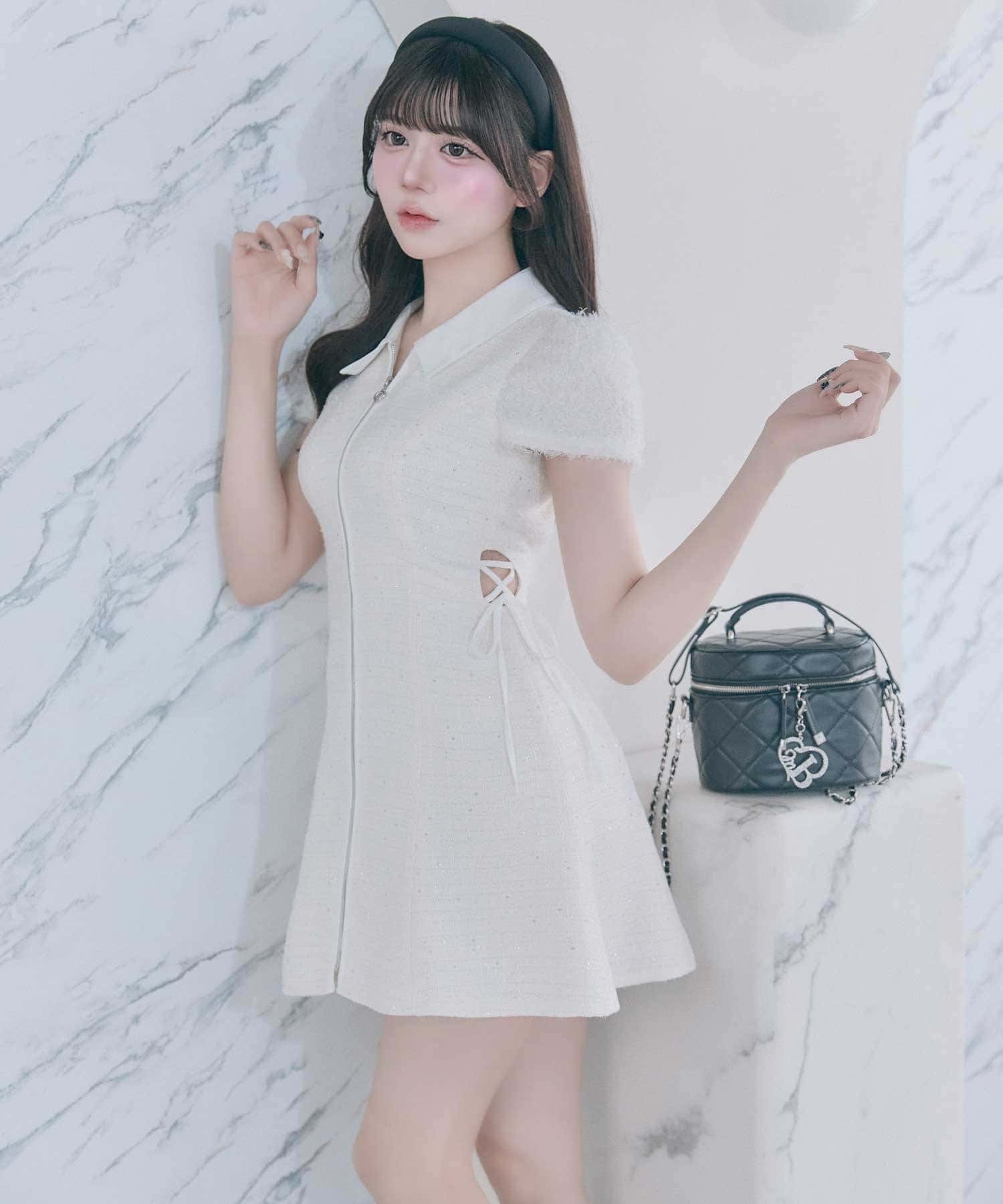 ツイード素材×ファースリーブで、上品さと華やかさを兼ね備えた主役ワンピース。
