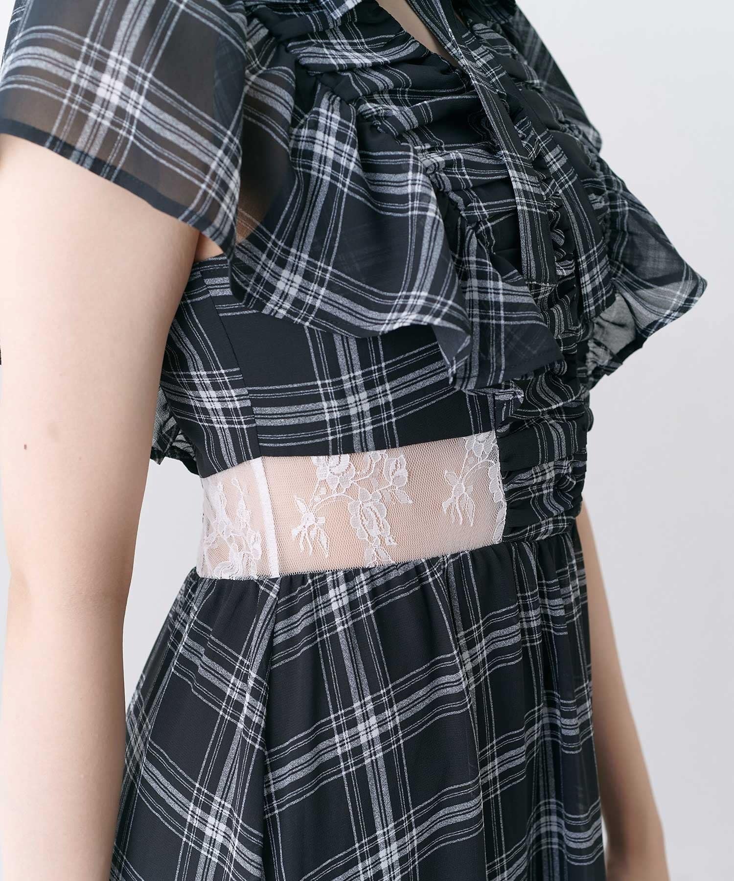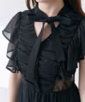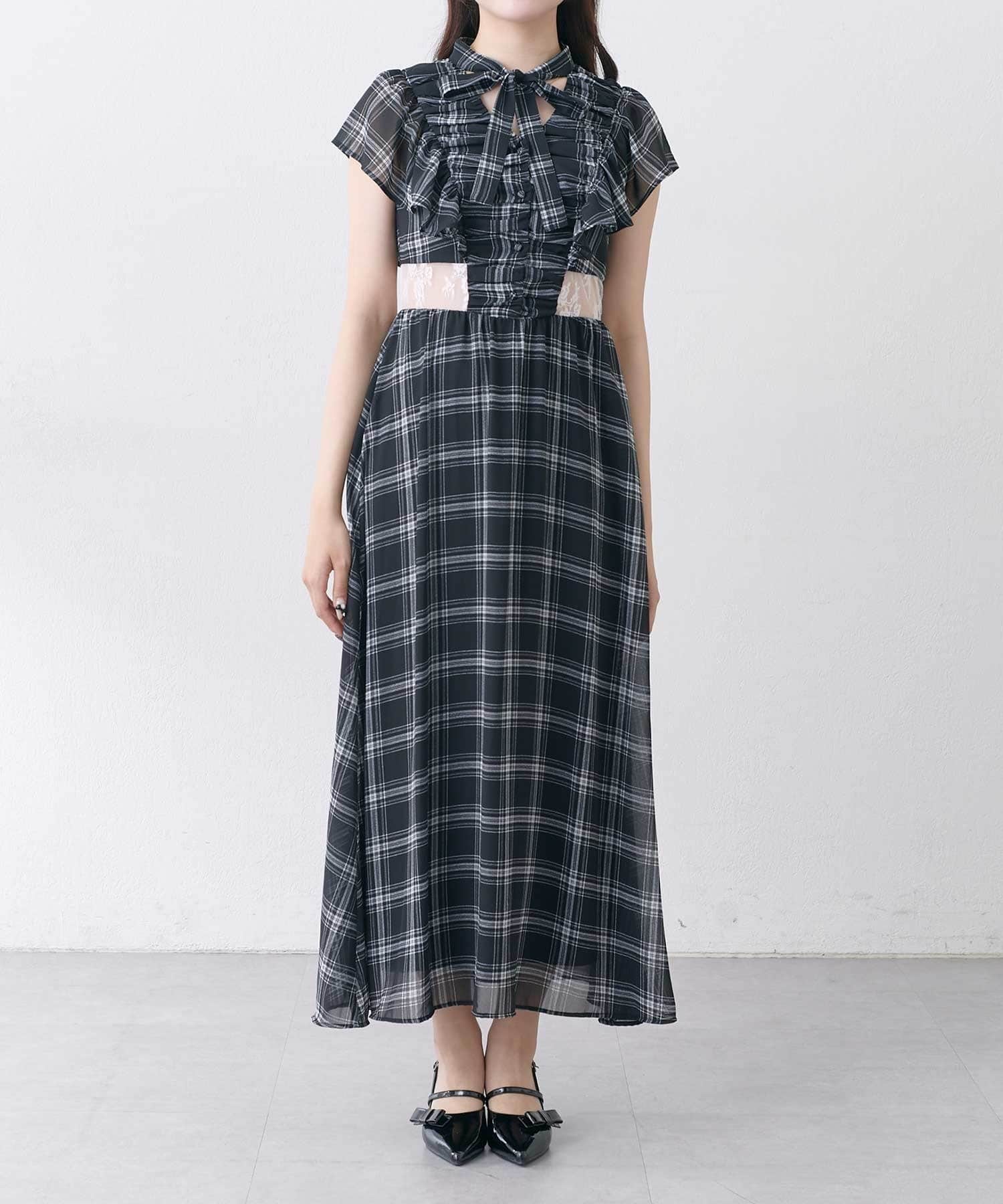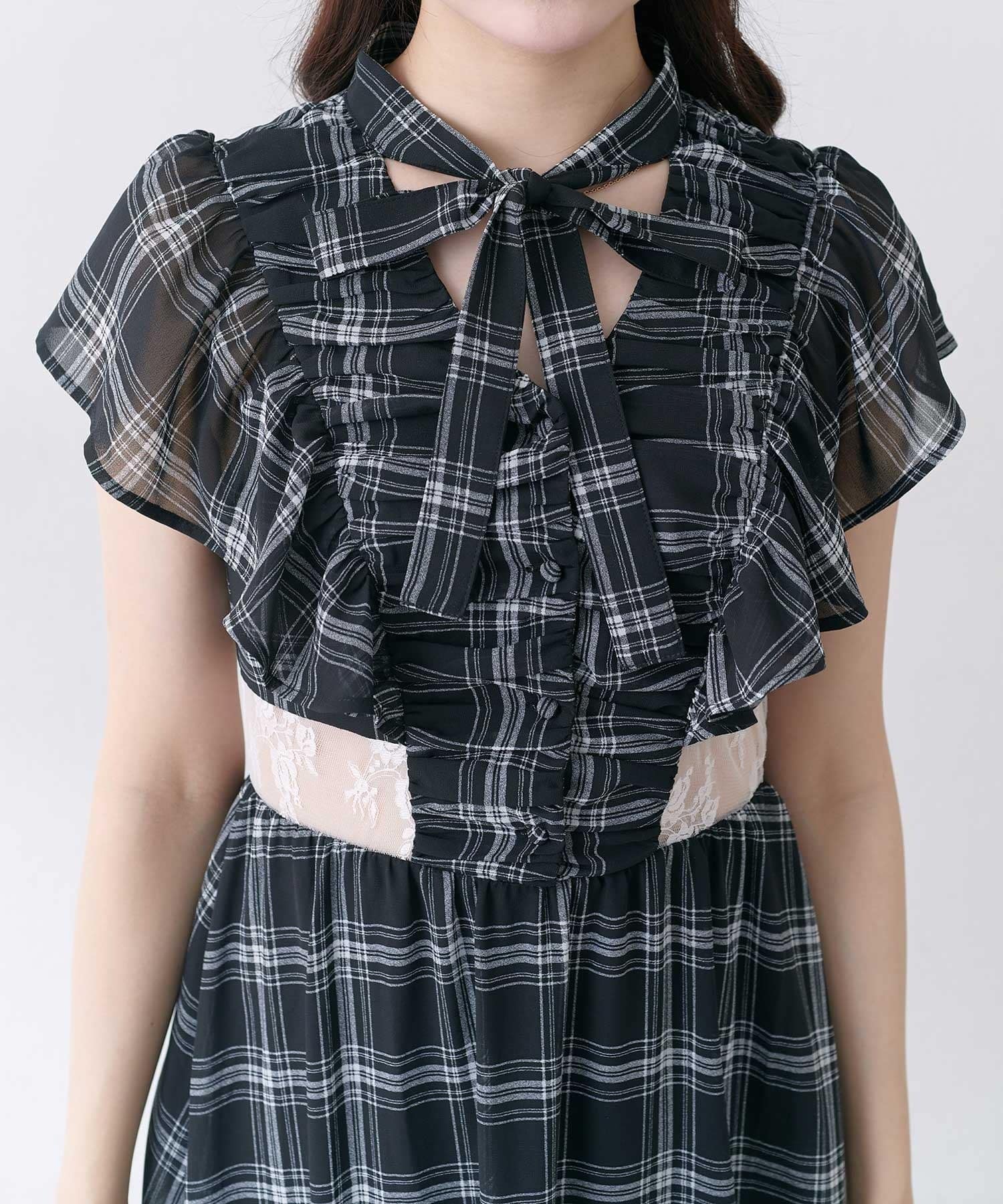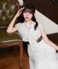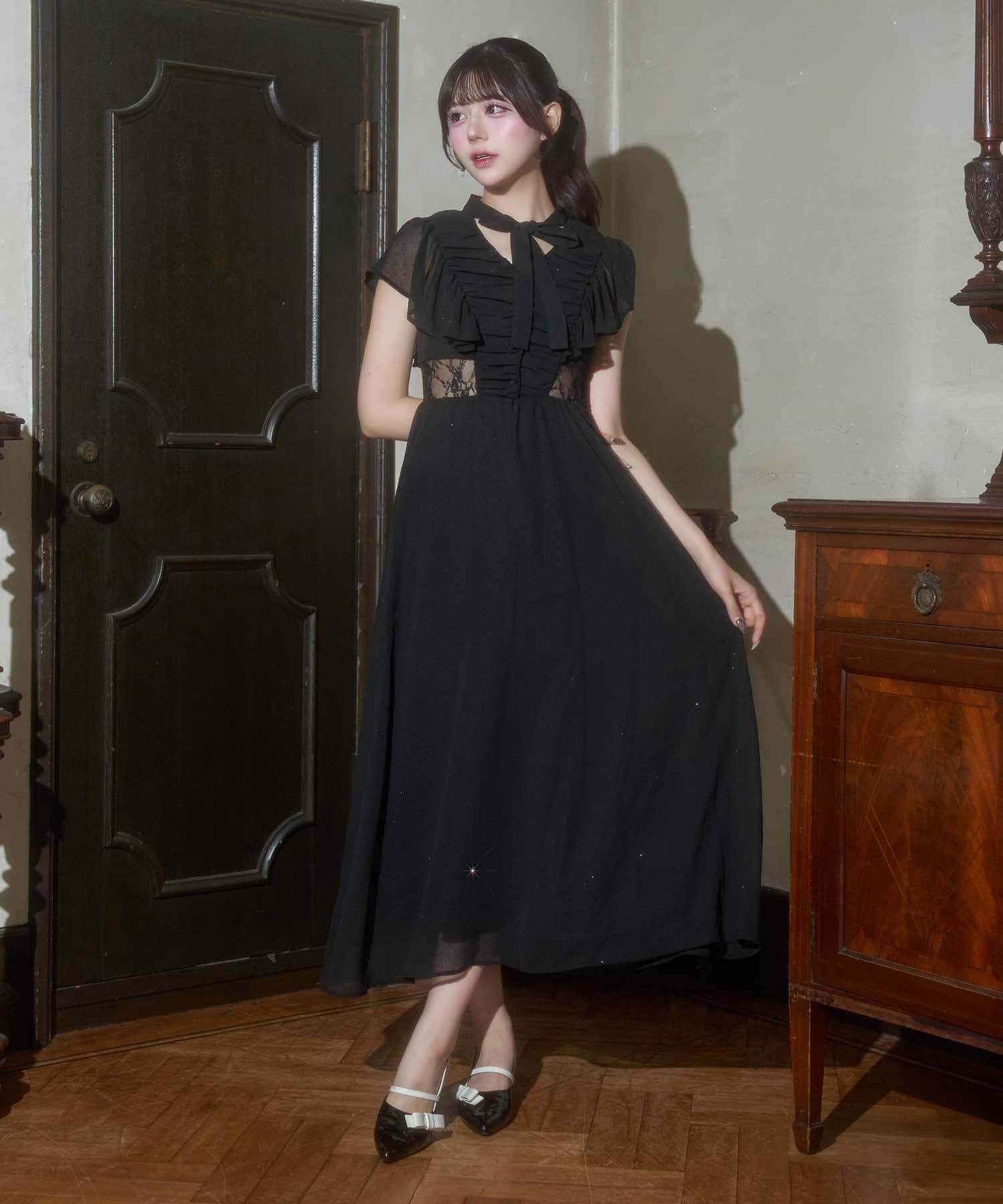 ・首元のリボンデザインやウエストのレースで華やかさを演出。