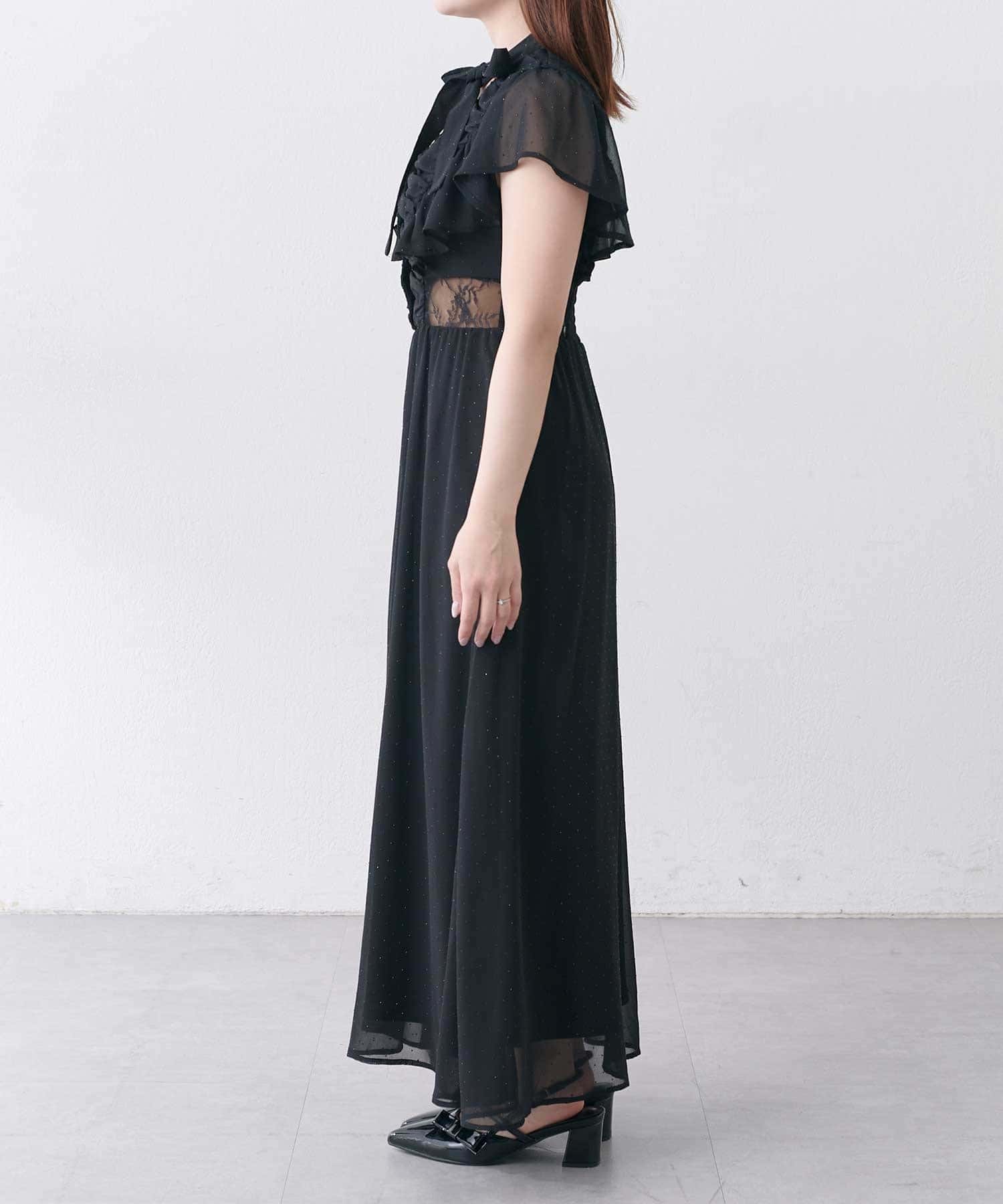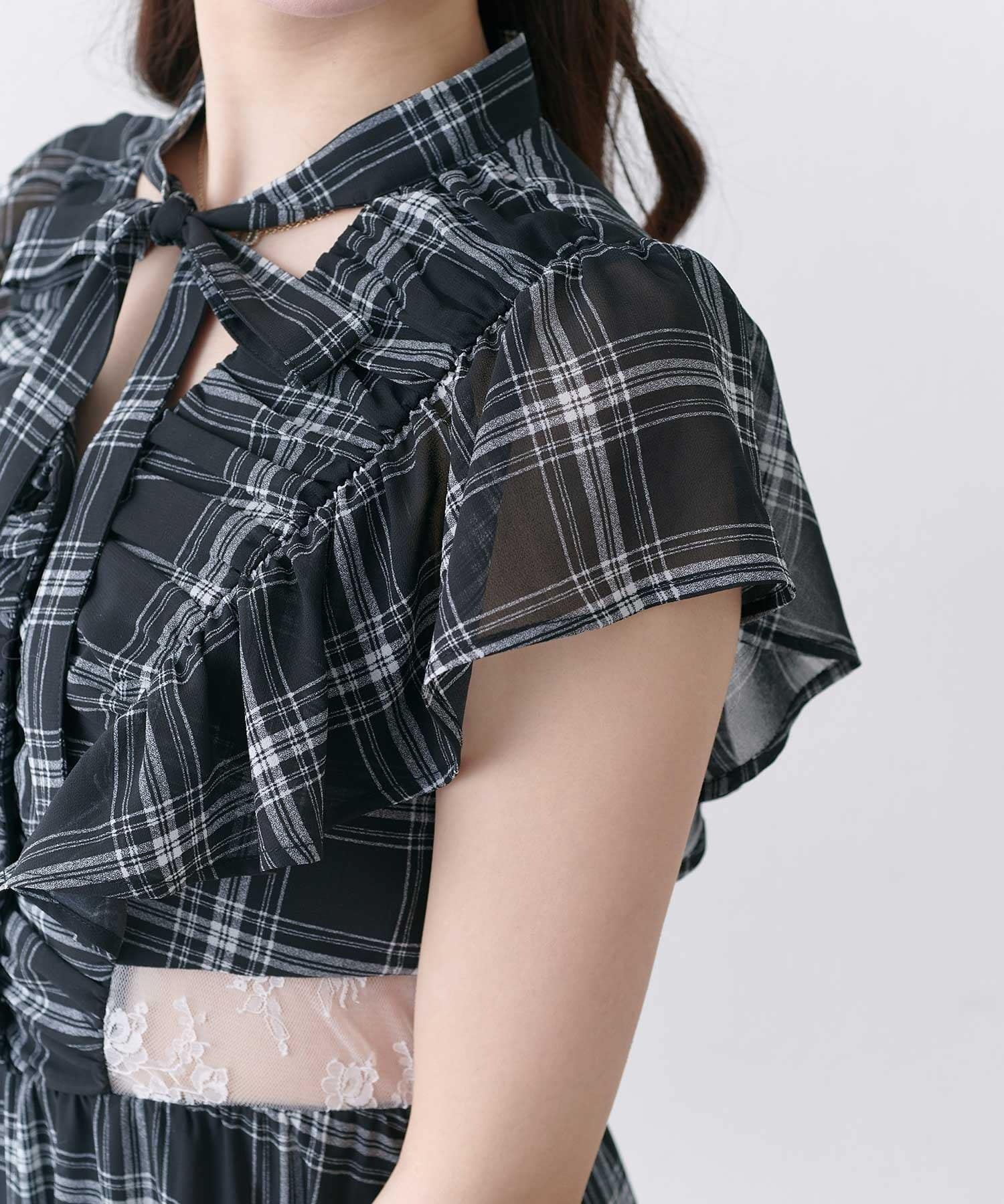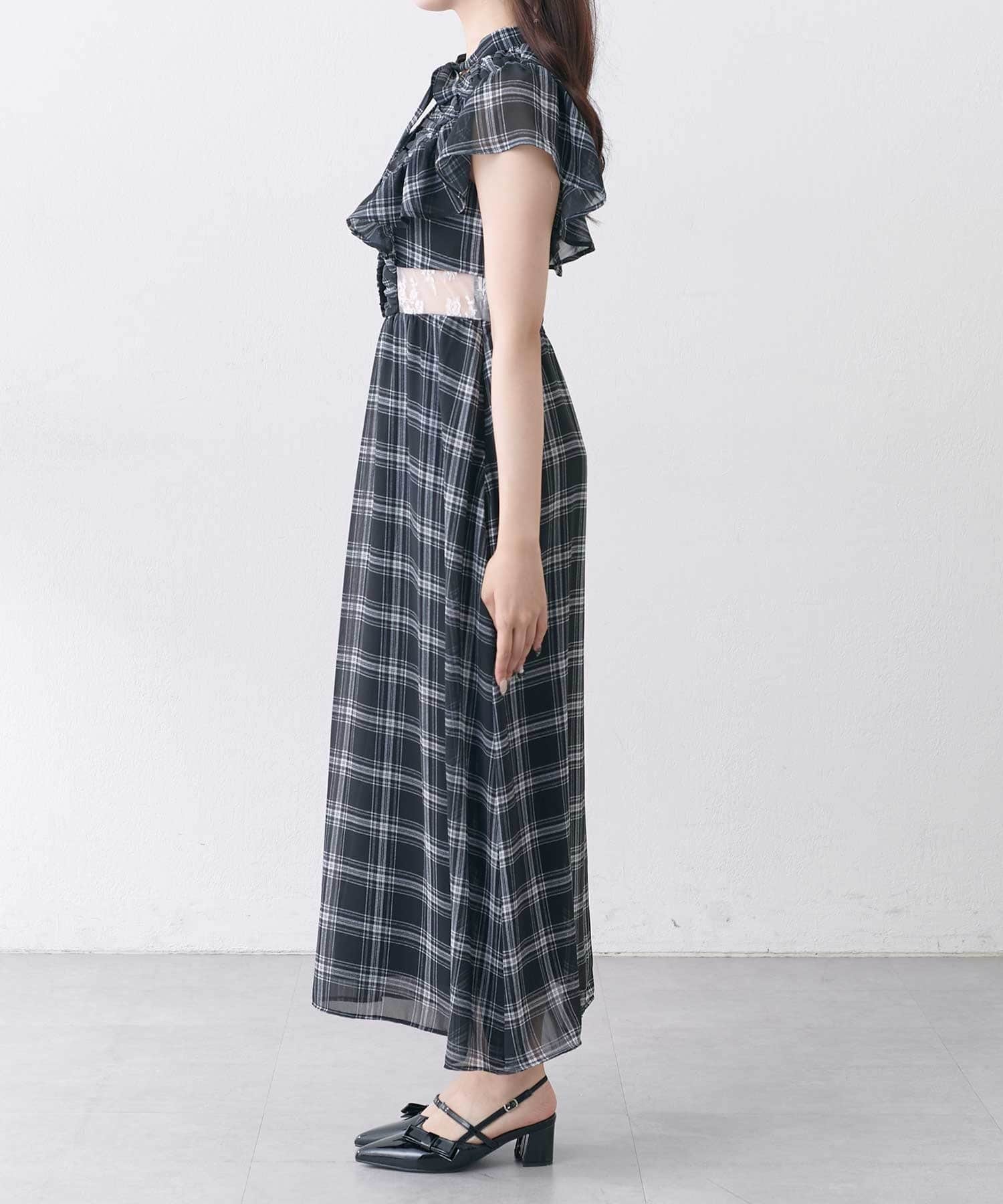 ・首元のリボンデザインやウエストのレースで華やかさを演出。