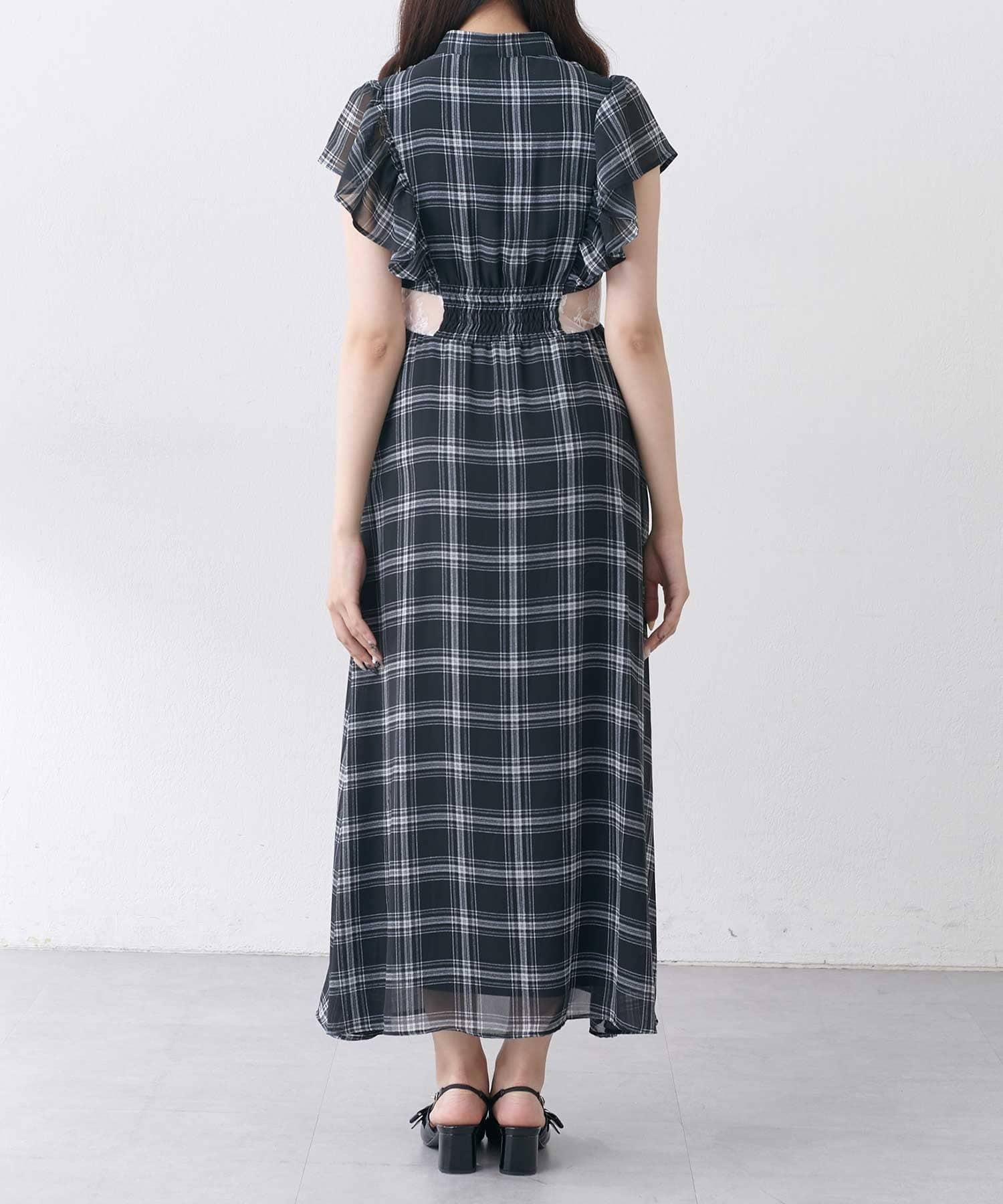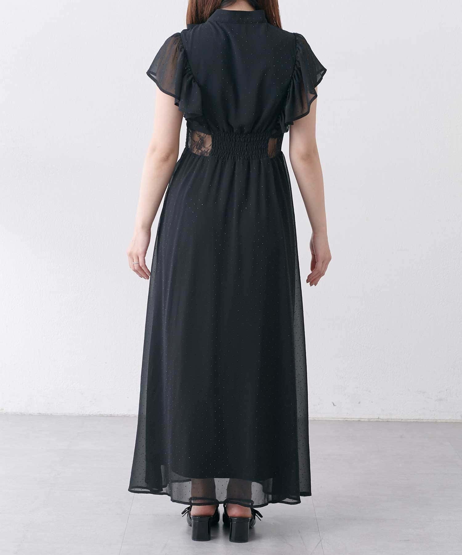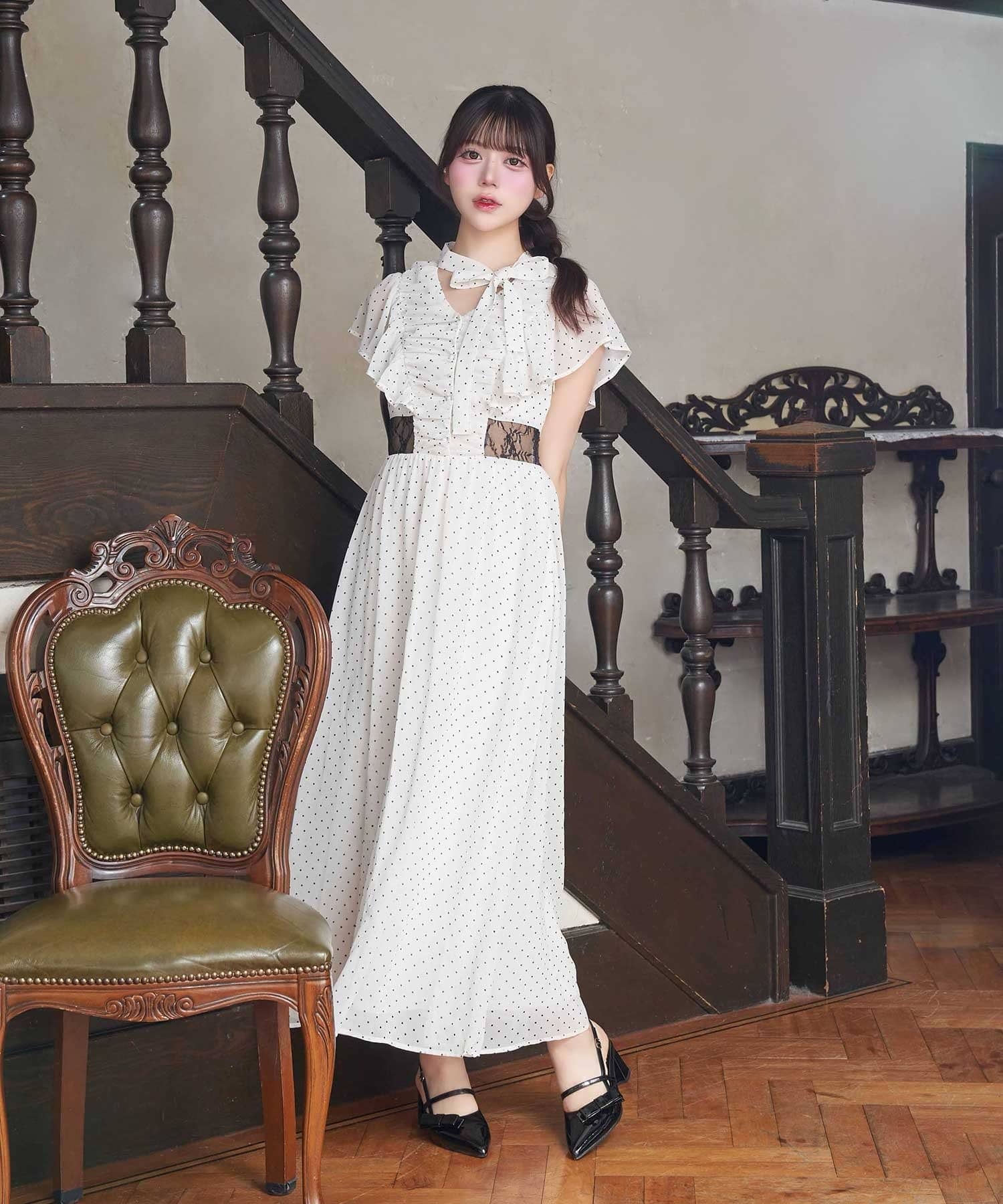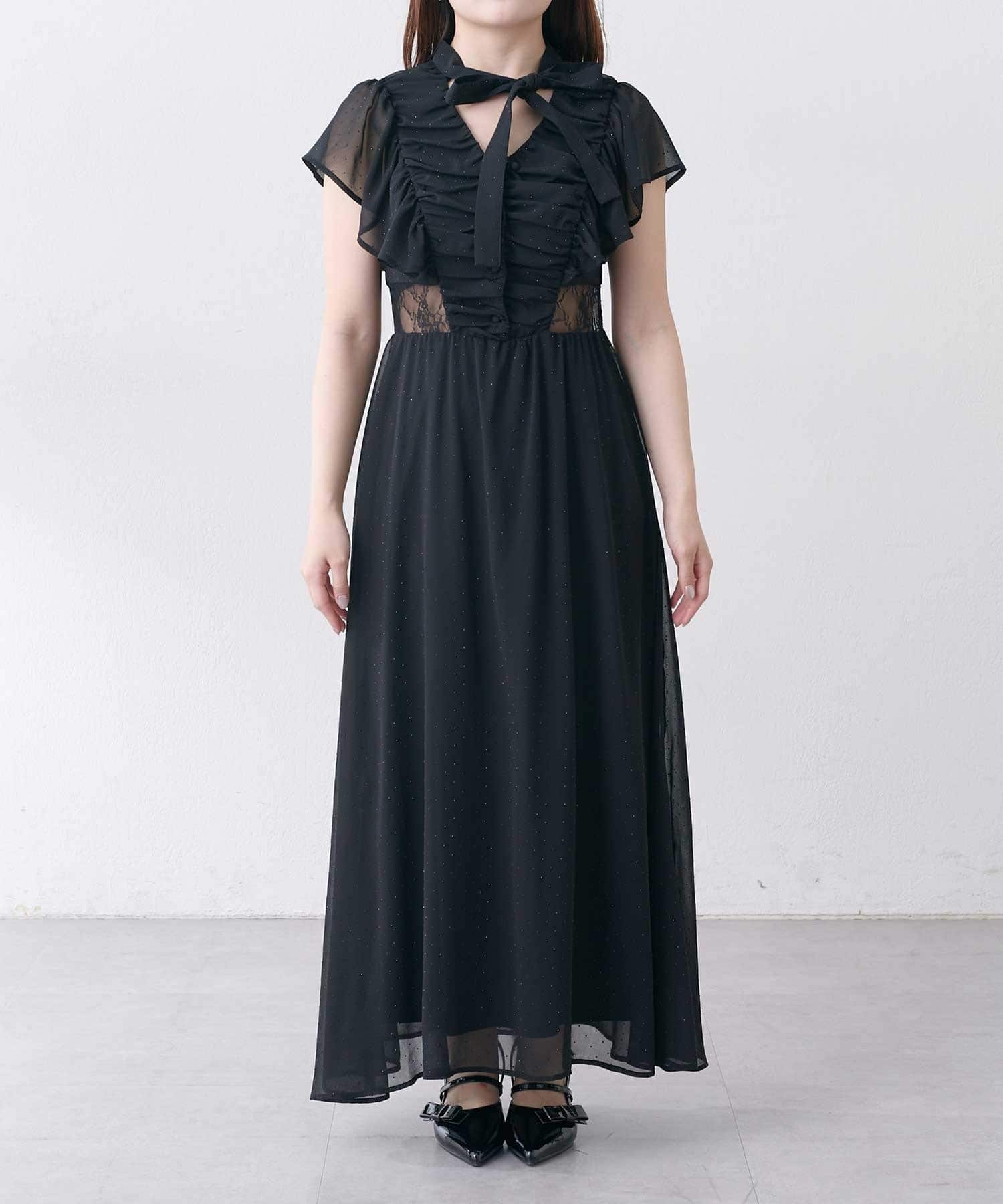 ・首元のリボンデザインやウエストのレースで華やかさを演出。