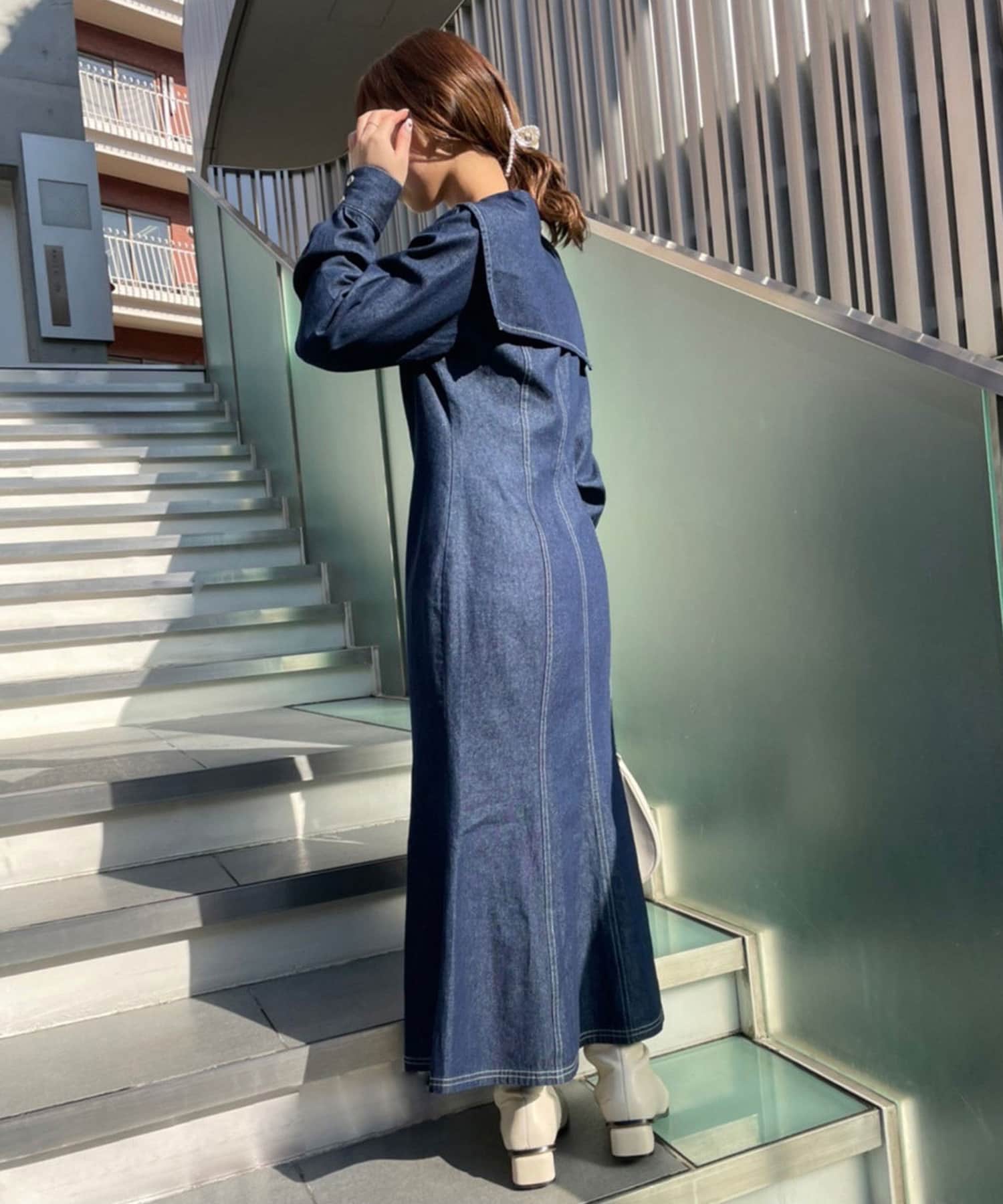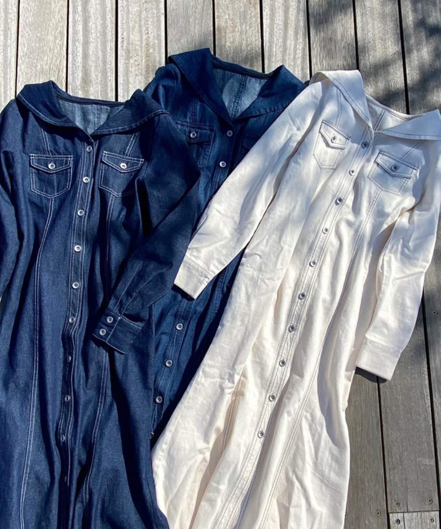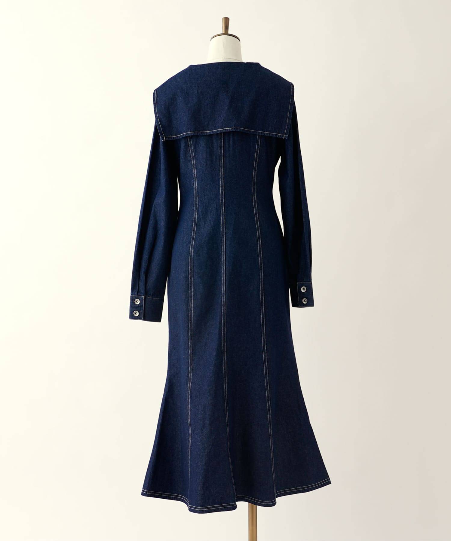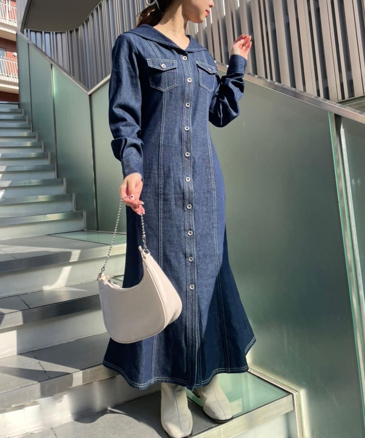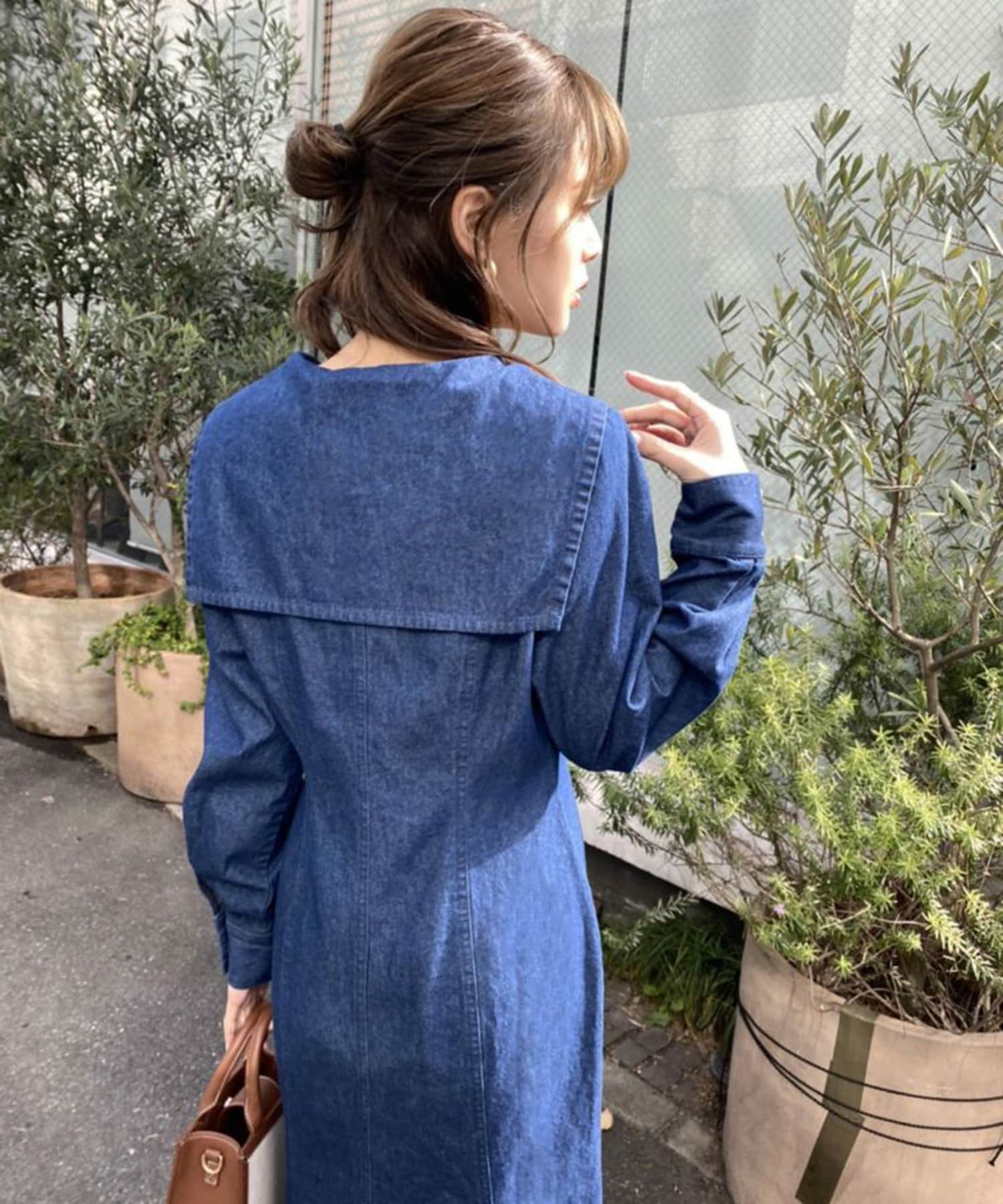 マリンテイストな雰囲気漂わせる、セーラーカラーのデニムワンピース。