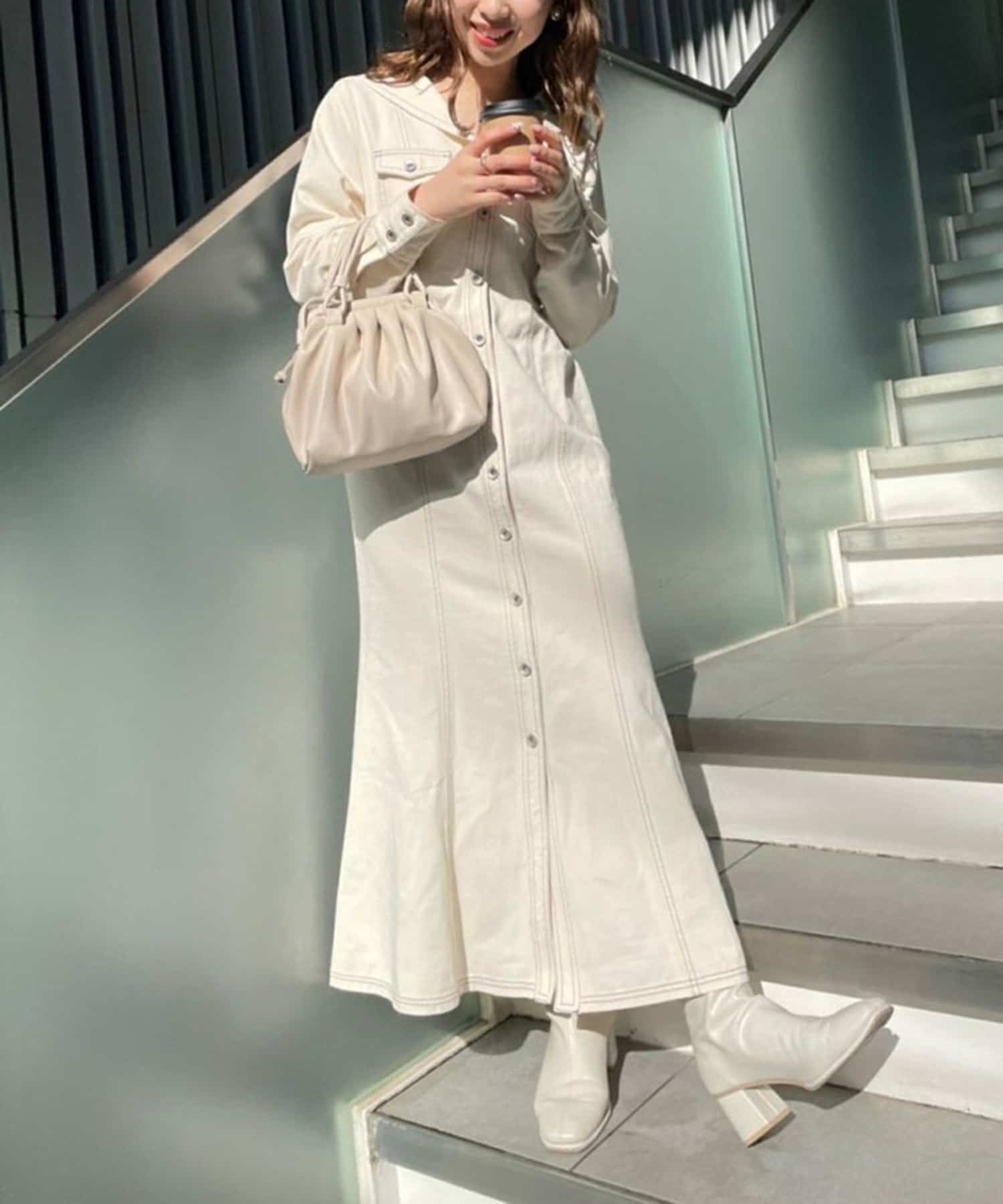 春先は上にトレンチなどを合わせる着こなしは大人っぽい印象に仕上げます。
